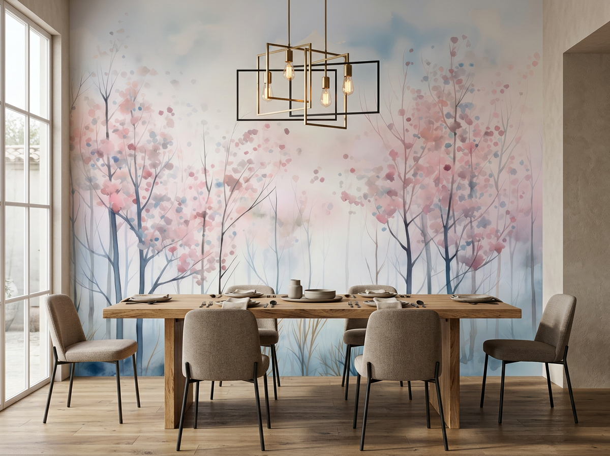 Świt zatrzymany w niedopowiedzeniu. MISTIA to oniryczna wizja wiosennego lasu, gdzie granica między niebem a ziemią zaciera się w pastelowej mgle. Delikatne, różowe korony drzew przenikają się z chłodnym błękitem tła, tworząc kompozycję pełną lekkości i spokoju. To wzór, który wprowadza do wnętrza kojący nastrój, działając na zmysły jak poranny spacer po rosie. Idealna propozycja do przestrzeni, które mają być azylem wyciszenia i subtelnej elegancji.