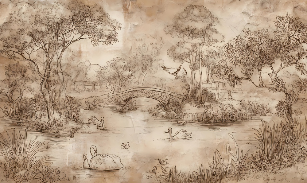 Artystyczna fototapeta krajobrazowa – antyczna rycina z łabędziami i mostem SABIA