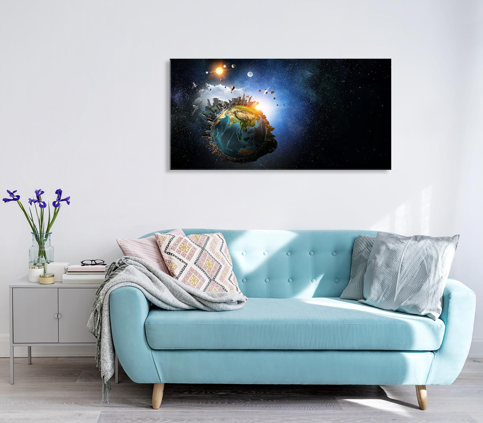 - w zestawie 2 zawieszki montowane z tyłu obrazu, jak również piankowe dystanse regulujące równomierny odstęp obrazu od ściany o około 1 cm przez co obraz daje efekt przestrzeni