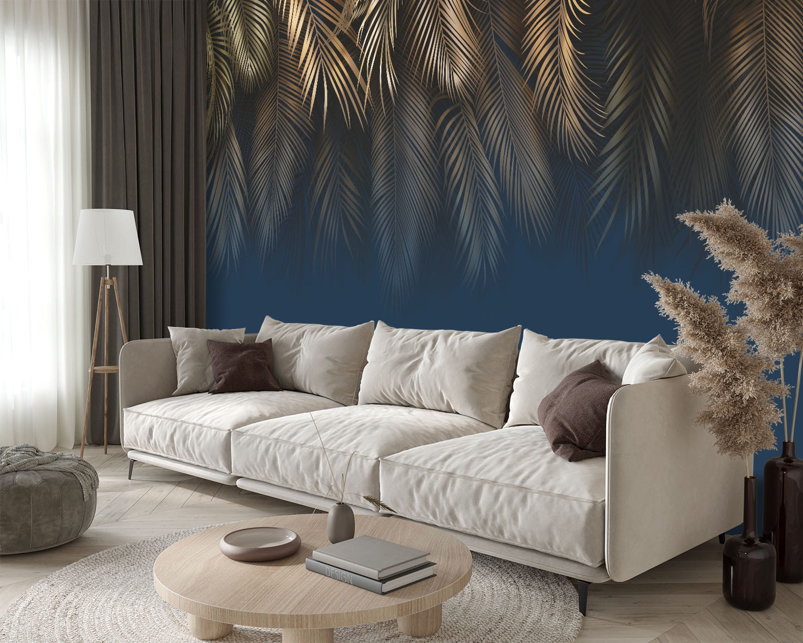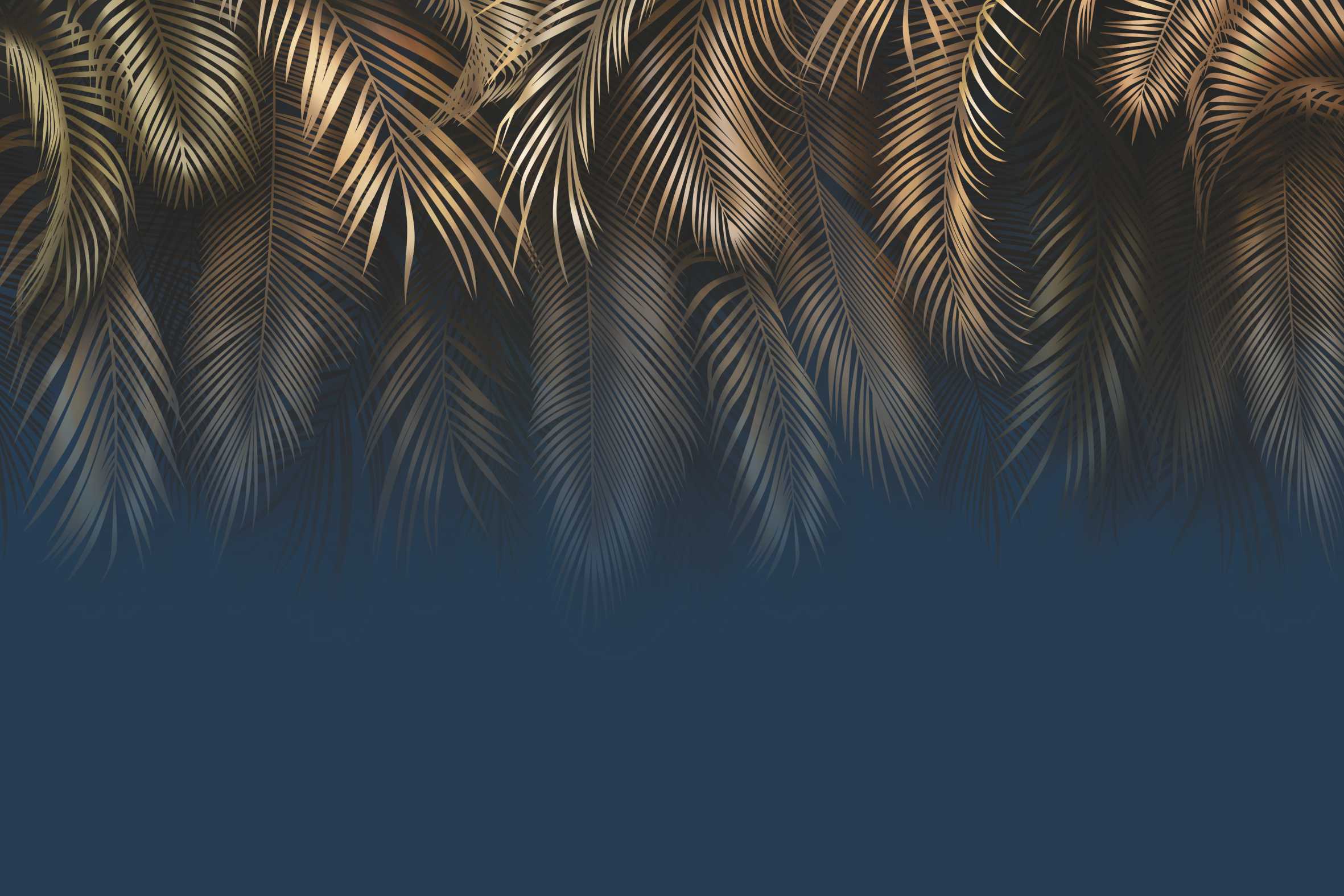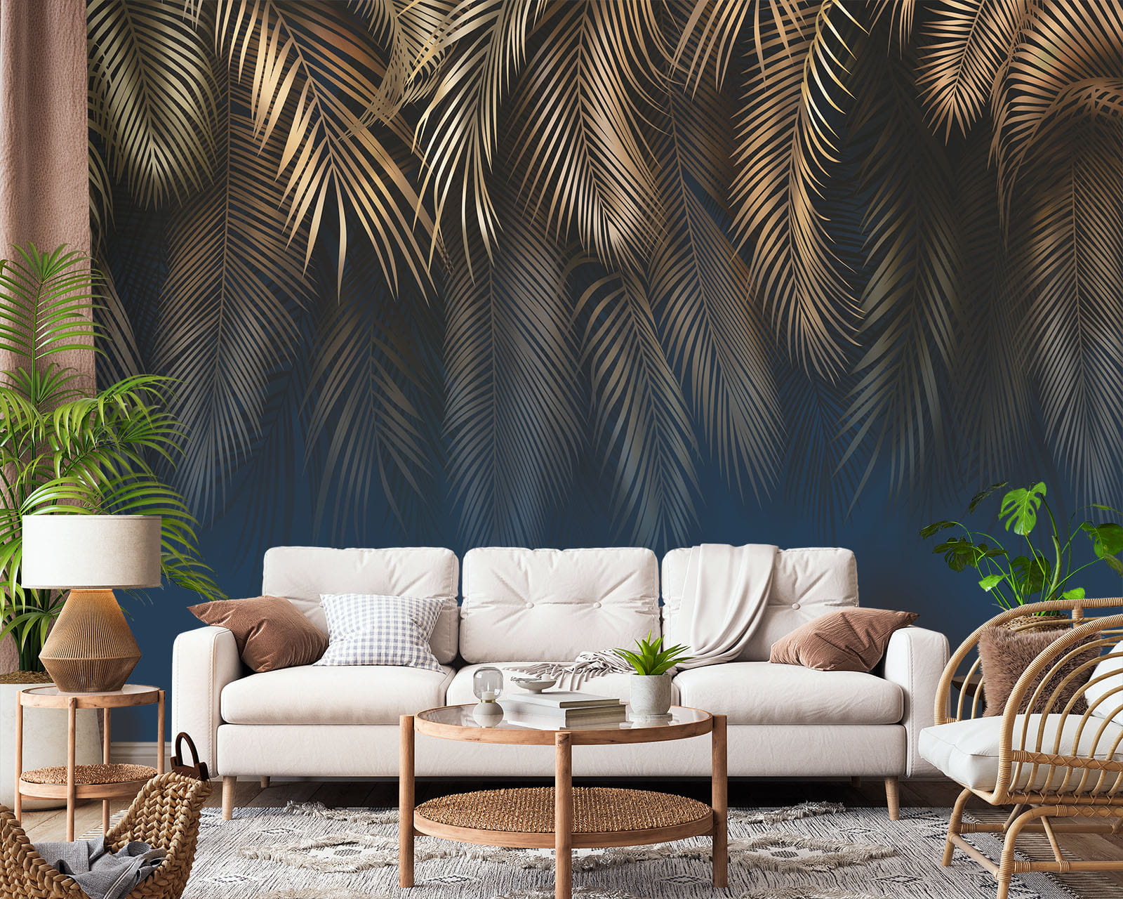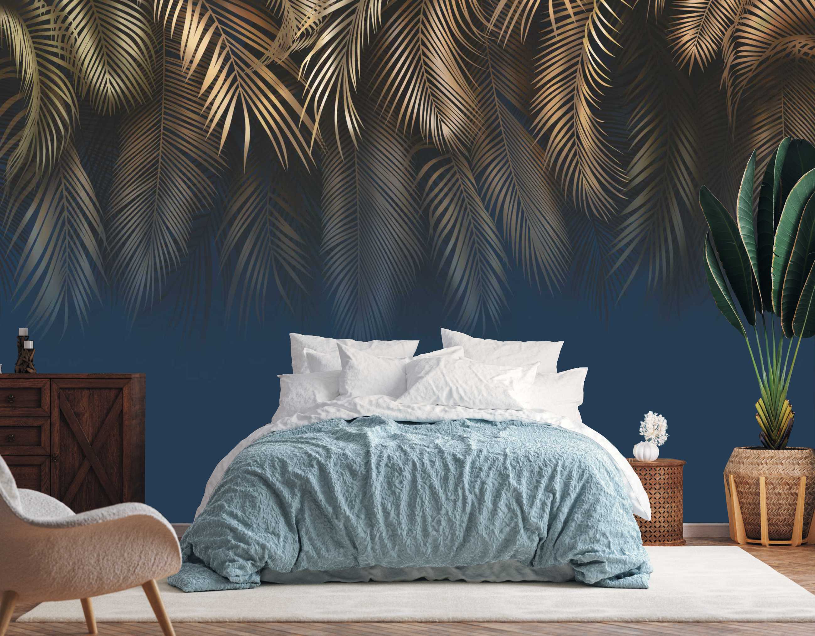 FOTOTAPETA 3D DO SALONU SYPIALNI ZŁOTE LIŚCIE PALMY
