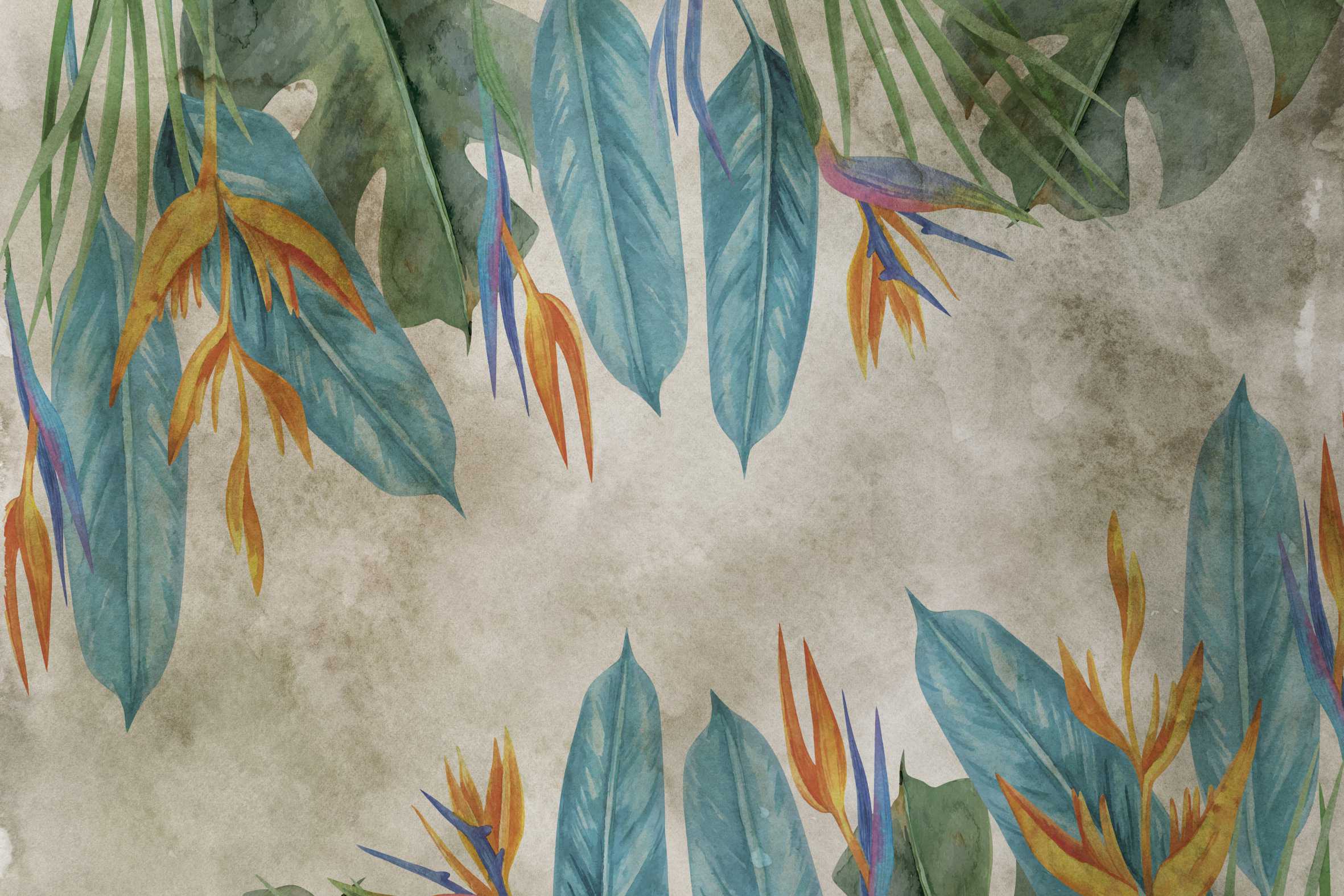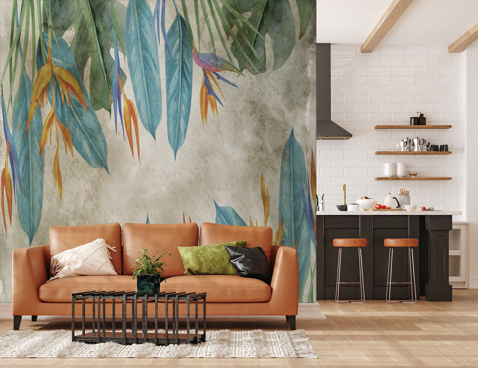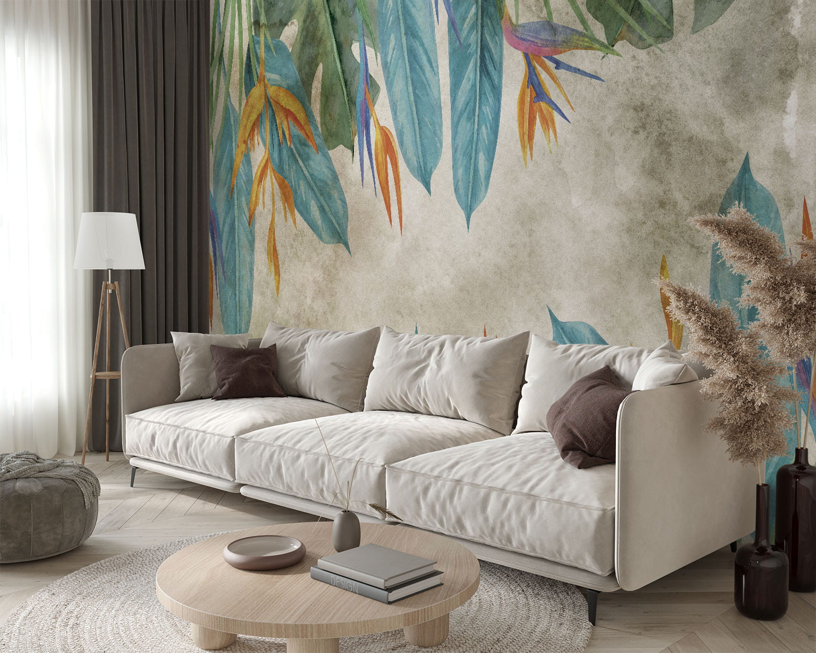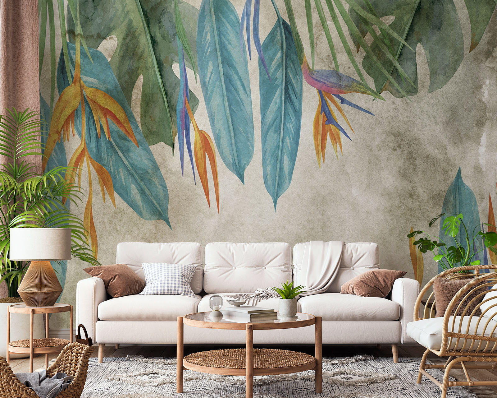 FOTOTAPETA DO SALONU SYPIALNI BARWNE LIŚCIE TROPIKALNE