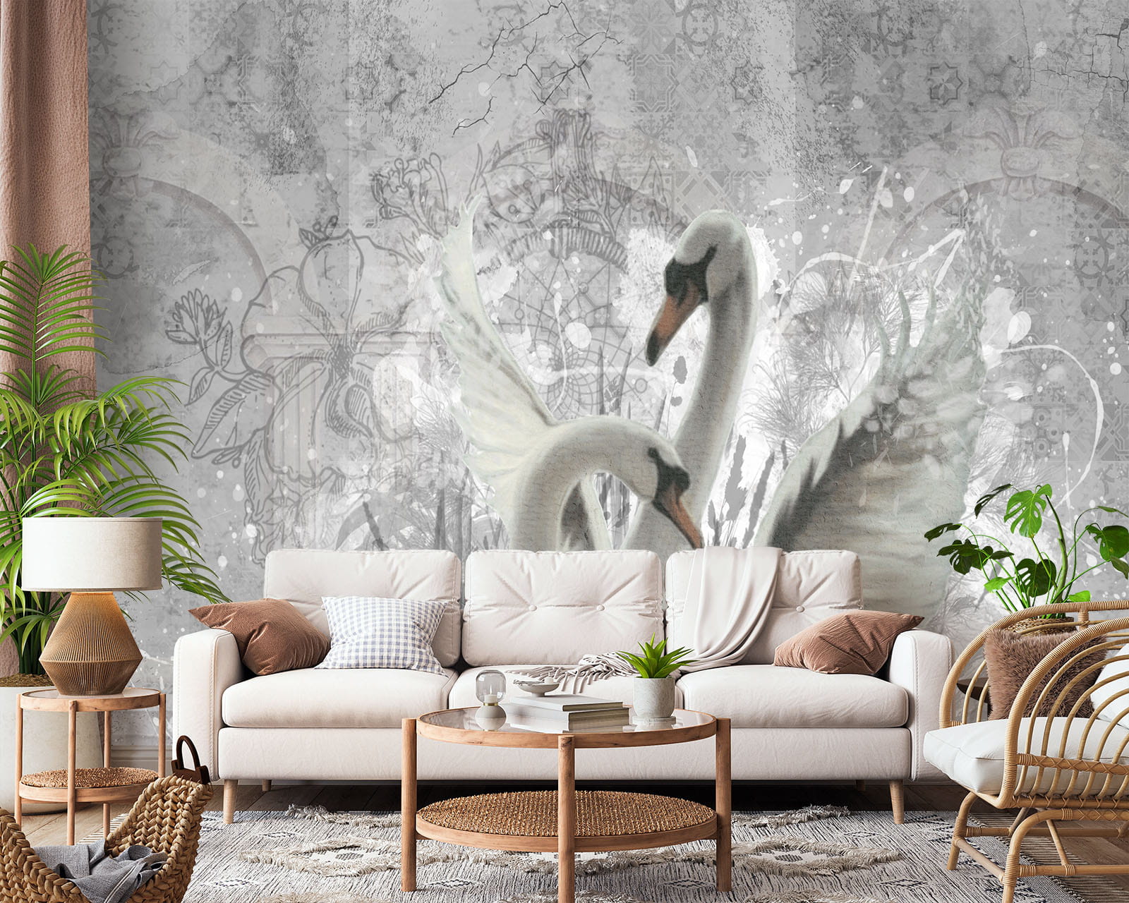 FOTOTAPETA DO SALONU SYPIALNI BETONOWA ŚCIANA ŁABĘDZIE