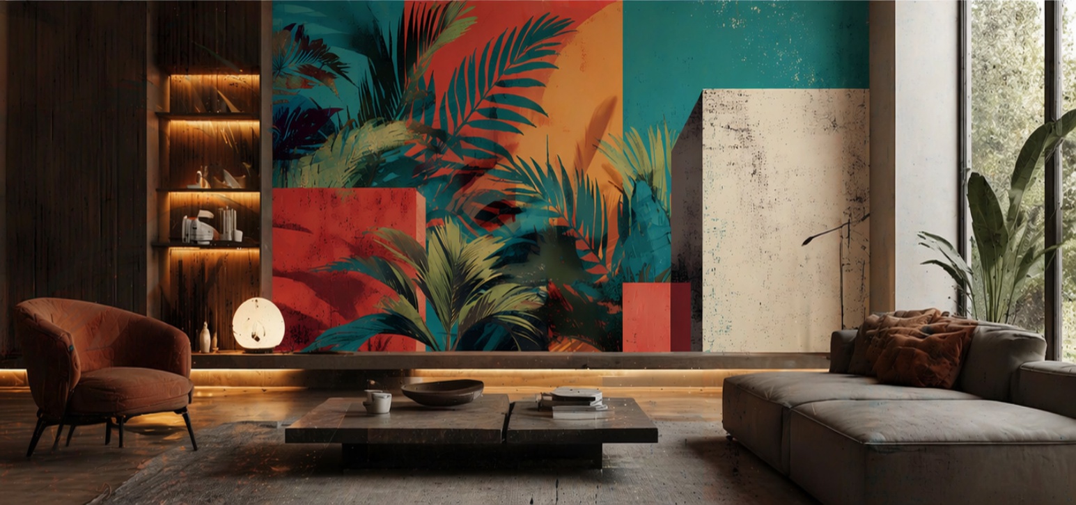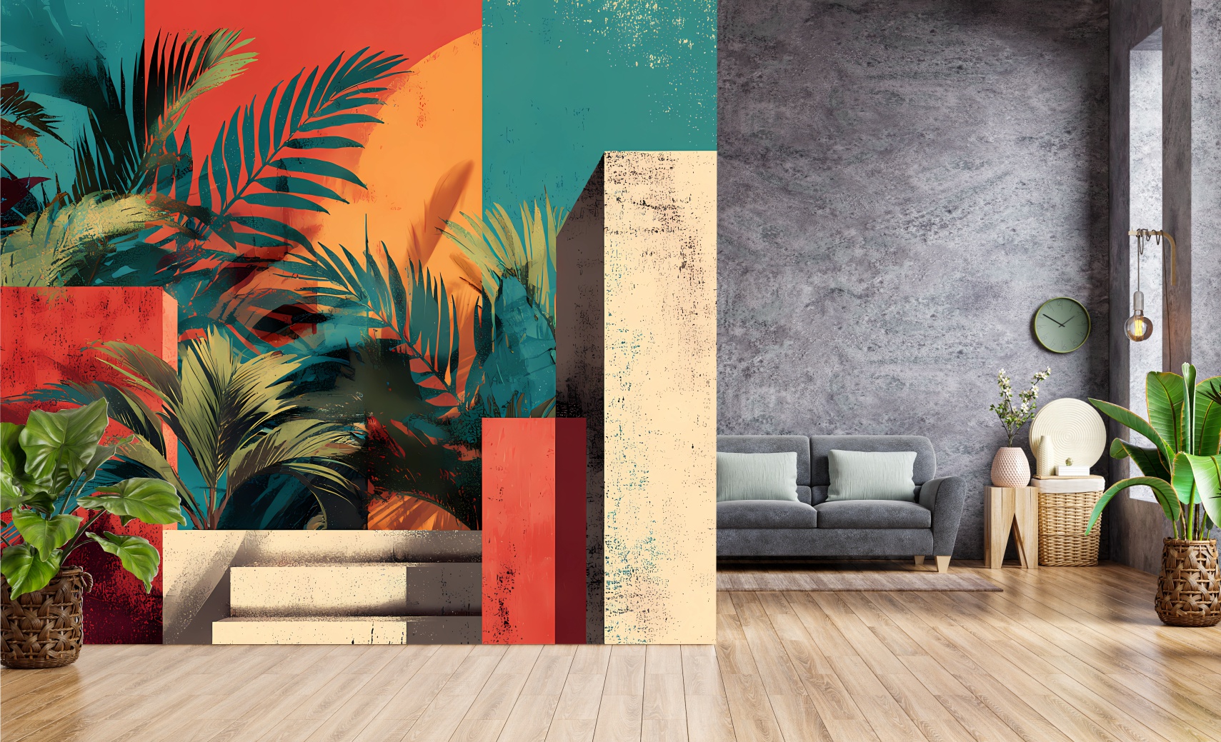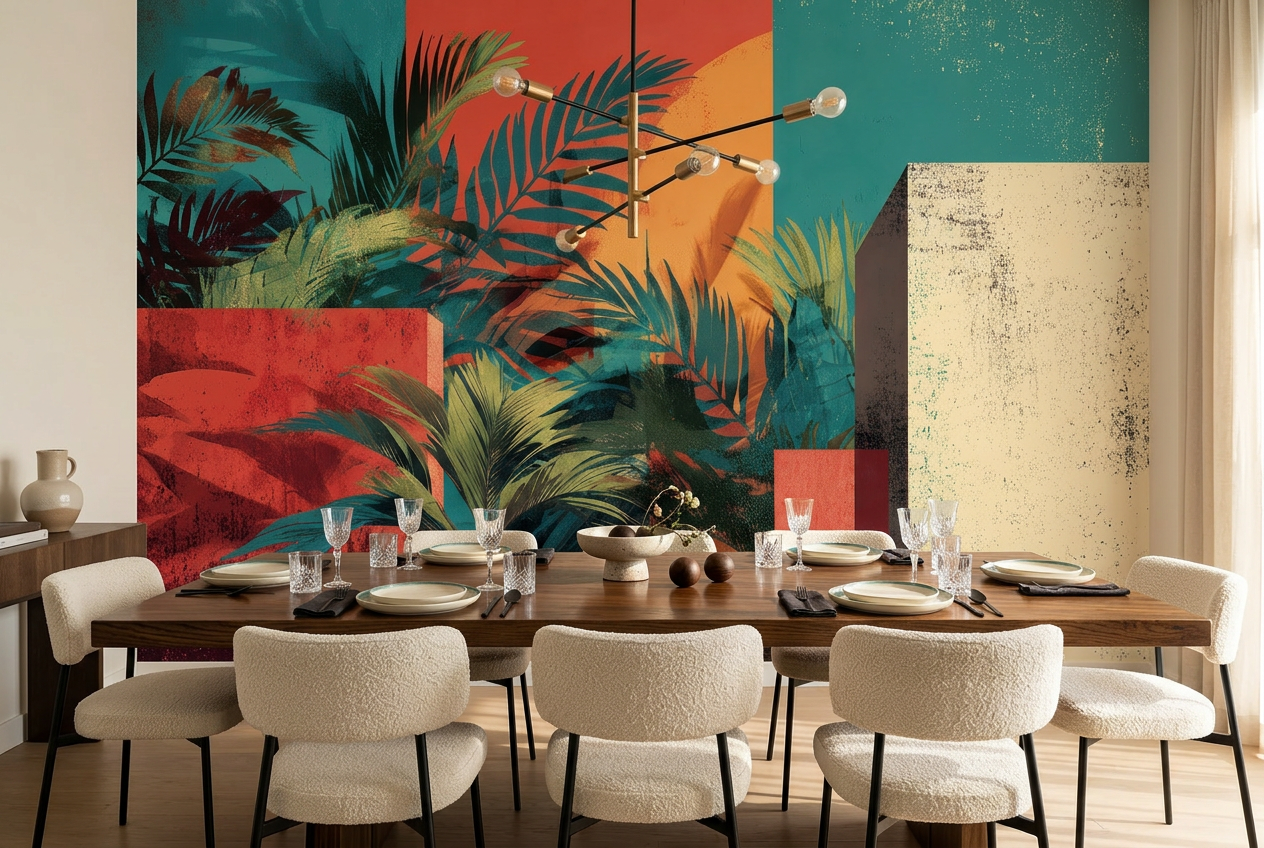 - Architektoniczna Głębia: Zastosowanie bloków kolorystycznych i nakładających się warstw (liście przed i za bryłami) optycznie powiększa pomieszczenie, dając efekt "okna" na egzotyczny ogród ukryty za betonowymi murami.
