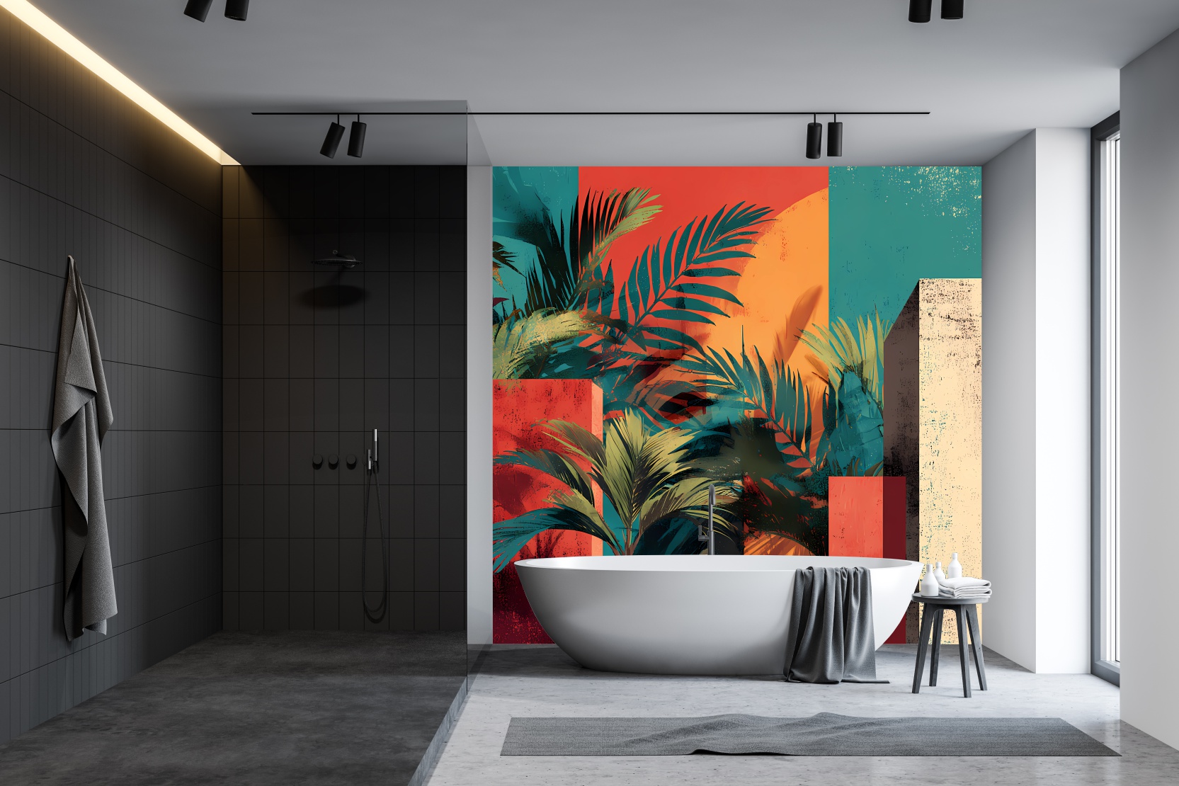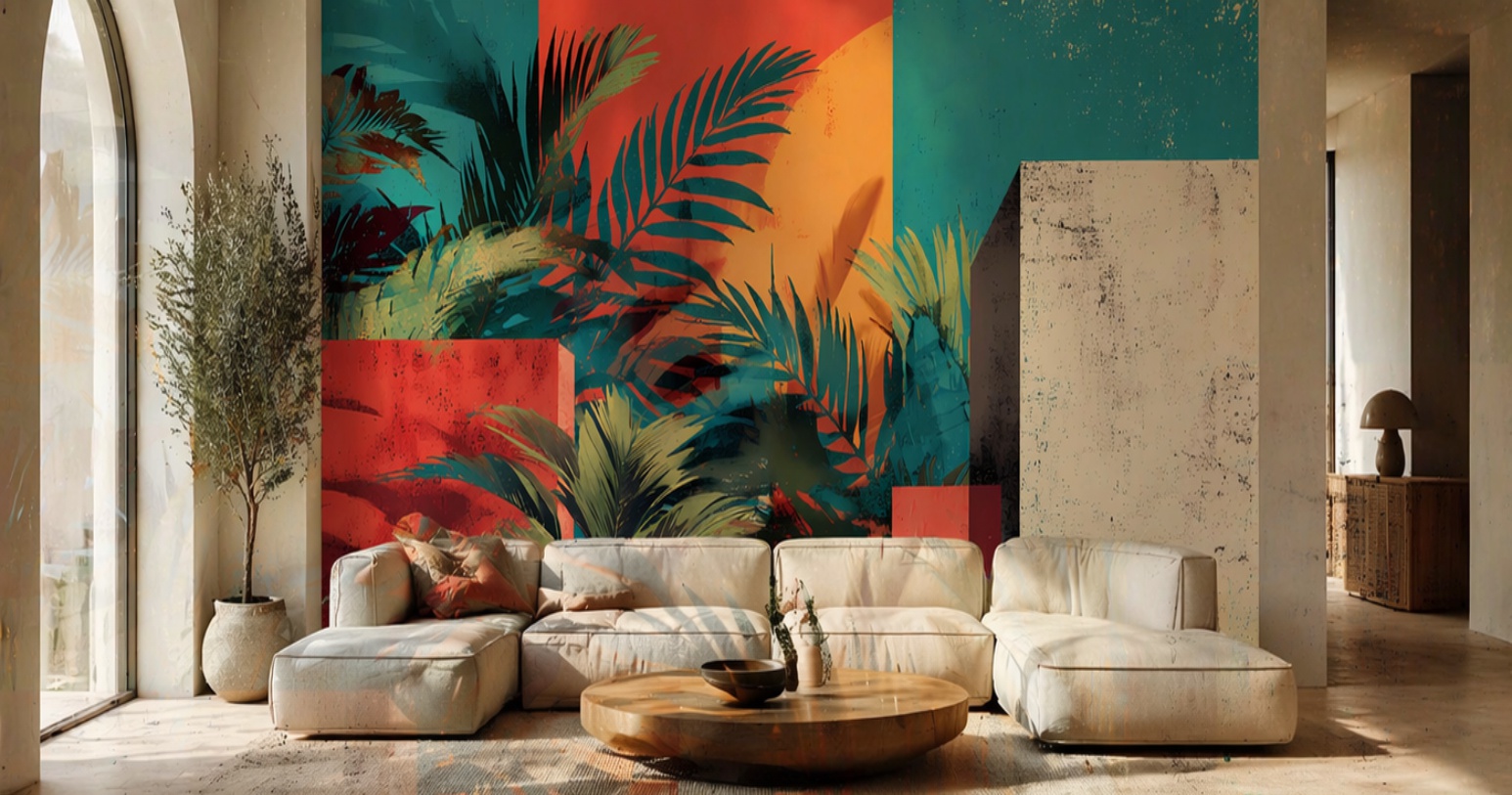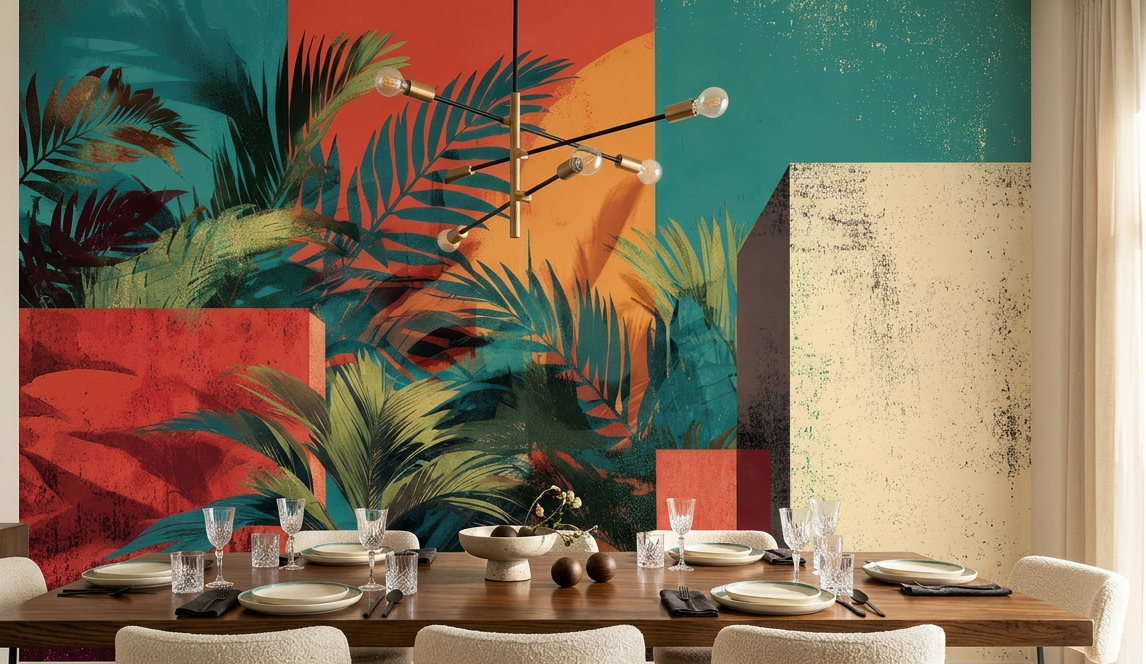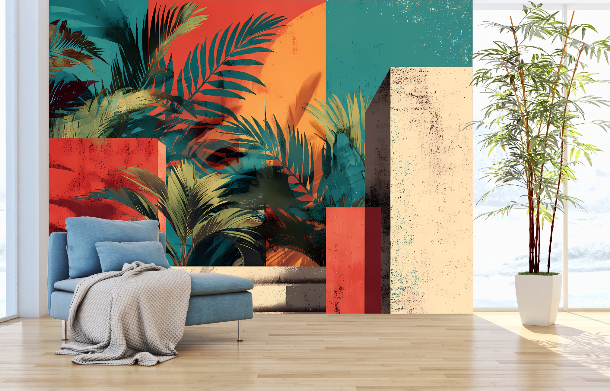 - Architektoniczna Głębia: Zastosowanie bloków kolorystycznych i nakładających się warstw (liście przed i za bryłami) optycznie powiększa pomieszczenie, dając efekt "okna" na egzotyczny ogród ukryty za betonowymi murami.