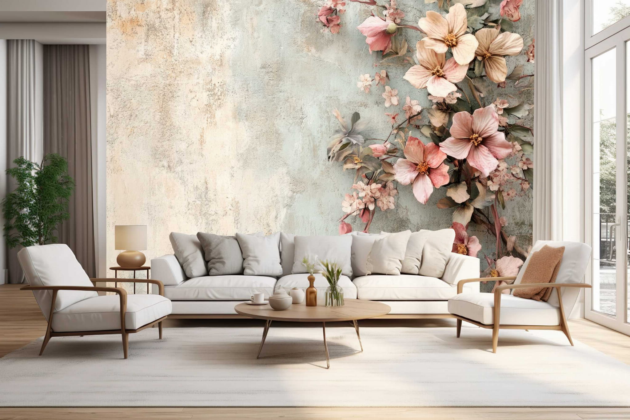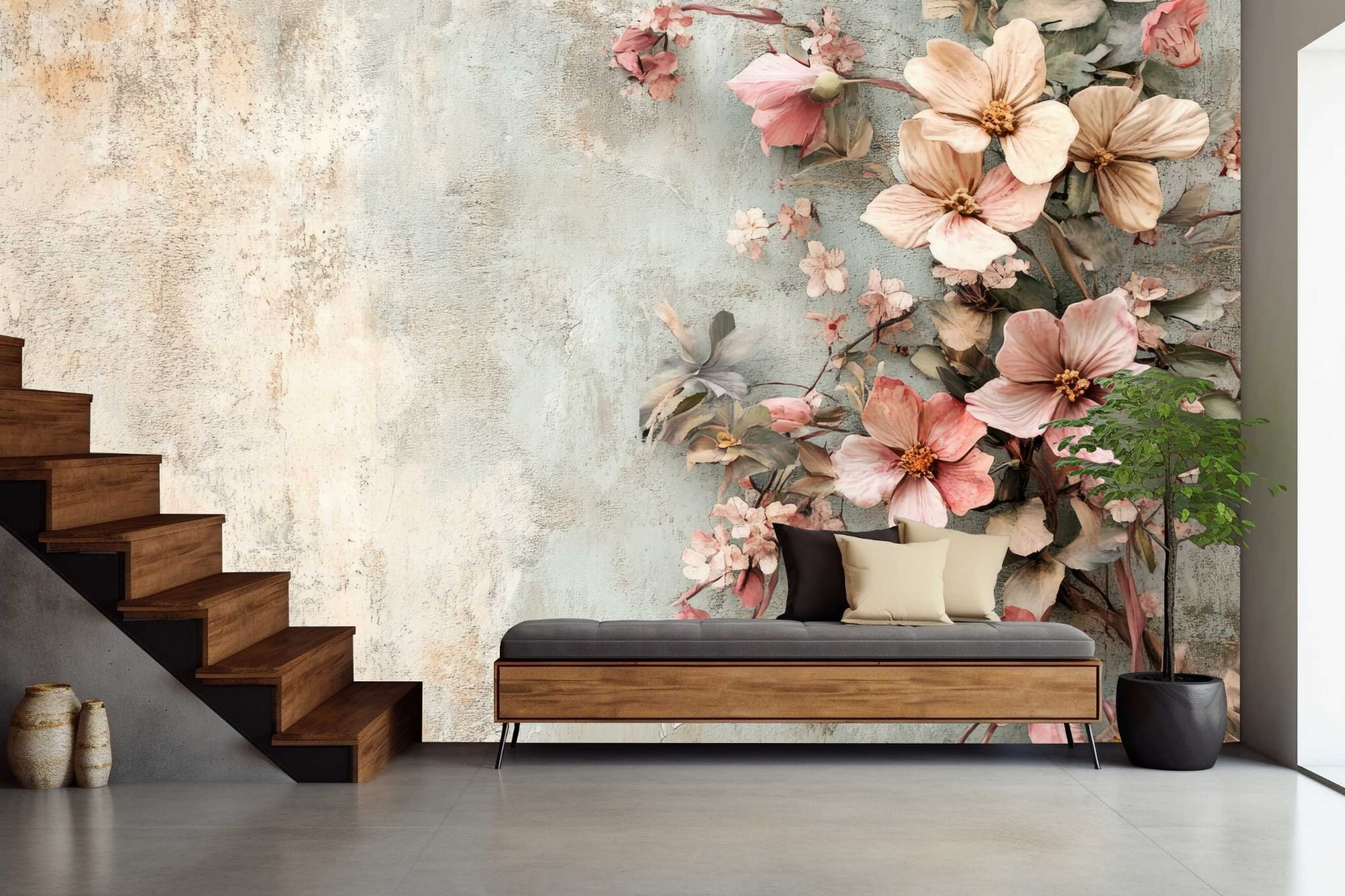 Fototapeta FLORAL dekoracyjny mural vintage KWIATY NA BETONOWYM TLE