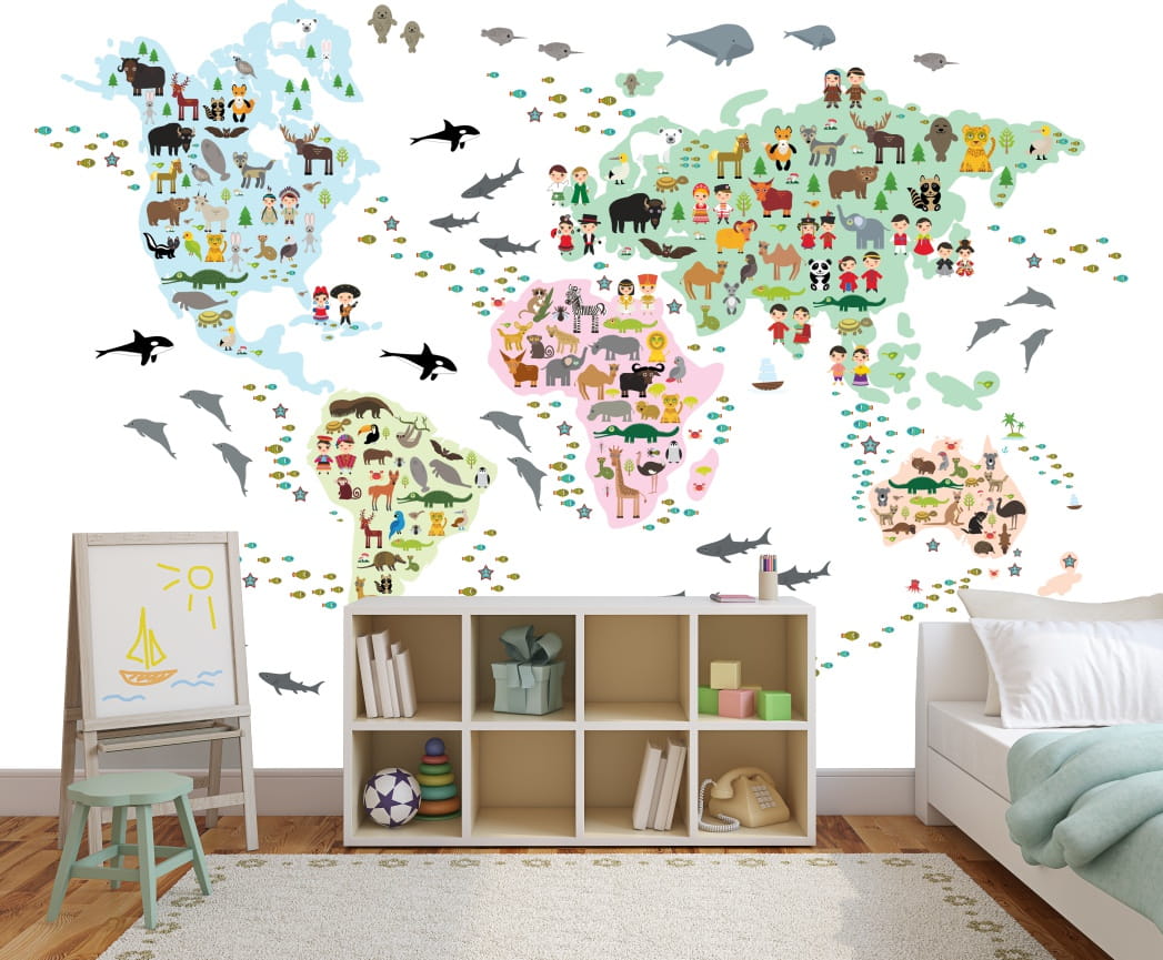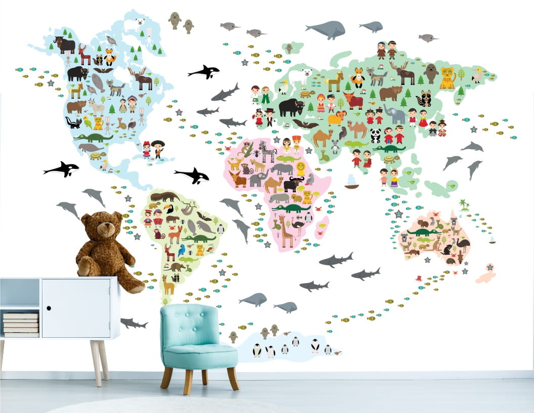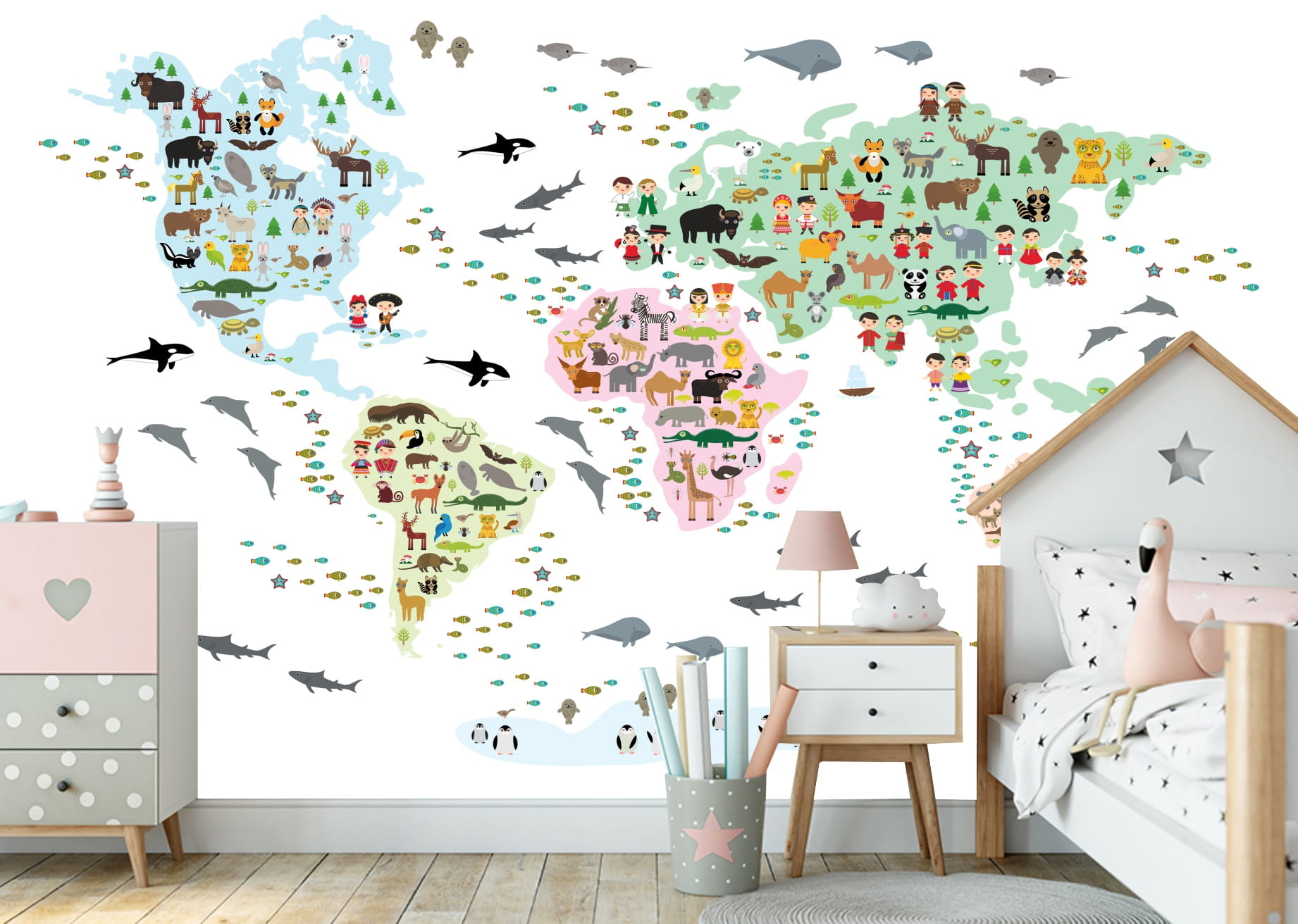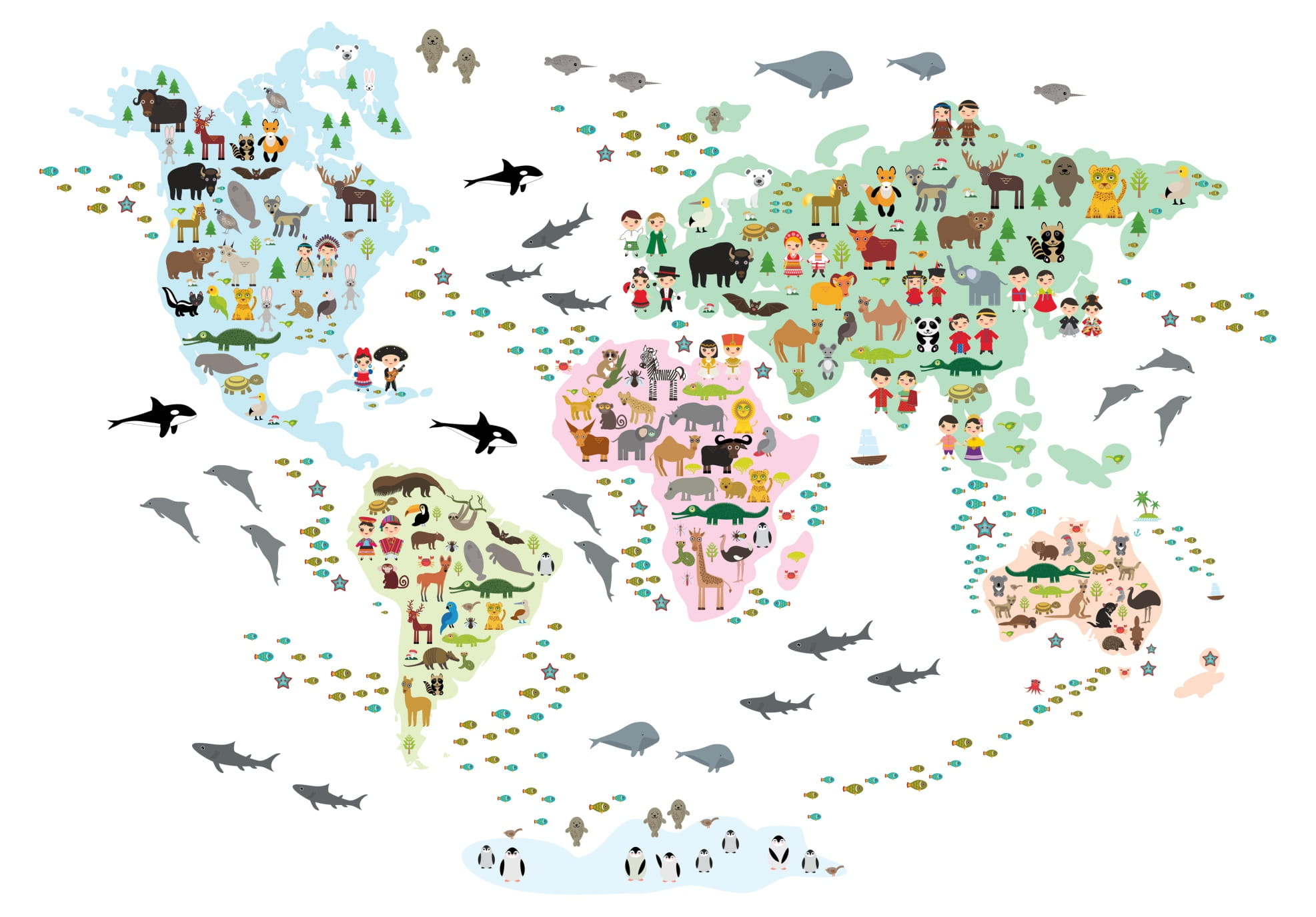Fototapeta MAPA ŚWIATA dla dzieci ZWIERZAKI ŚWIATA