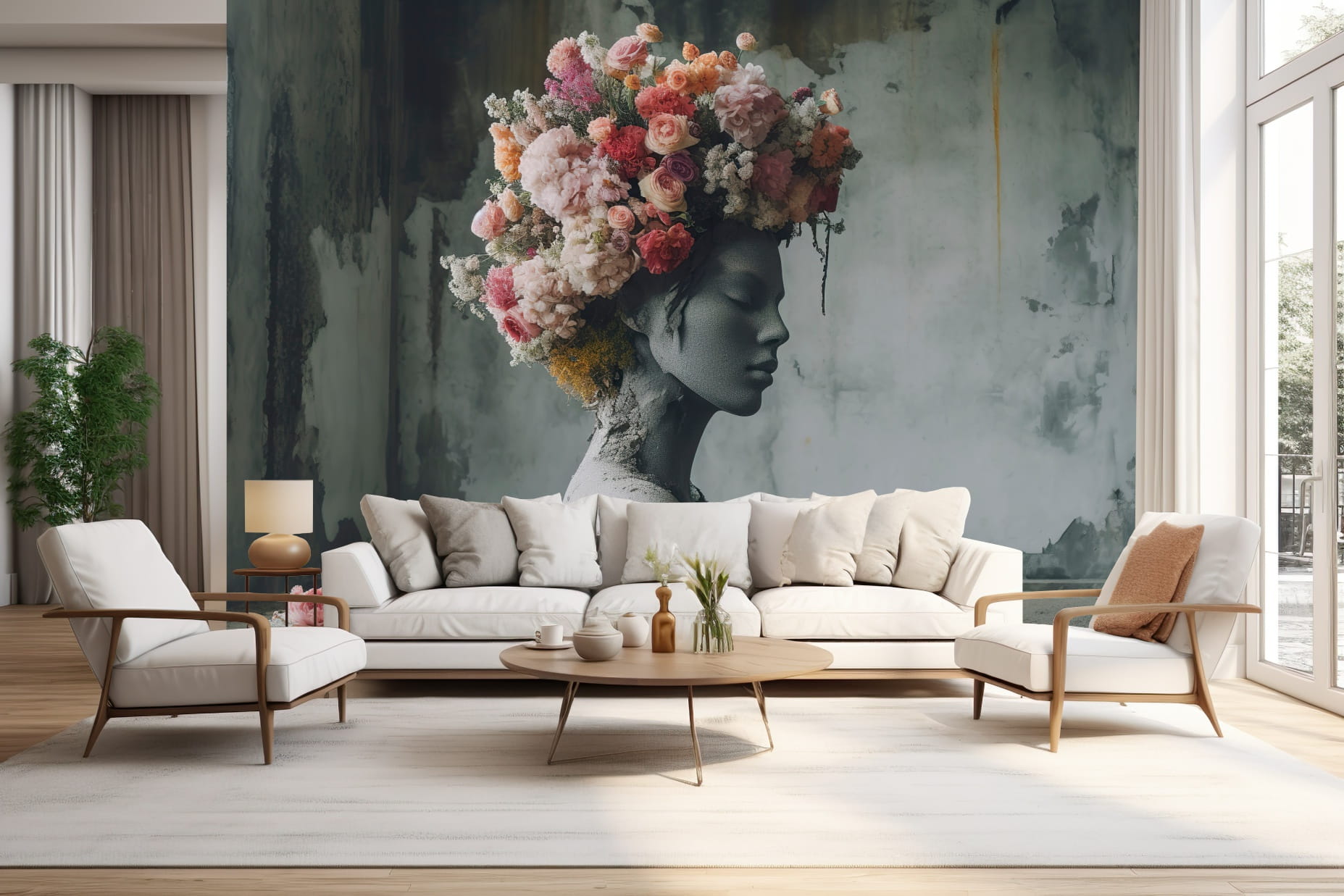 Fototapeta NOWOCZESNA do salonu sypialni ARTYSTYCZNA BETONOWA RZEŹBA KOBIETA KWIATY