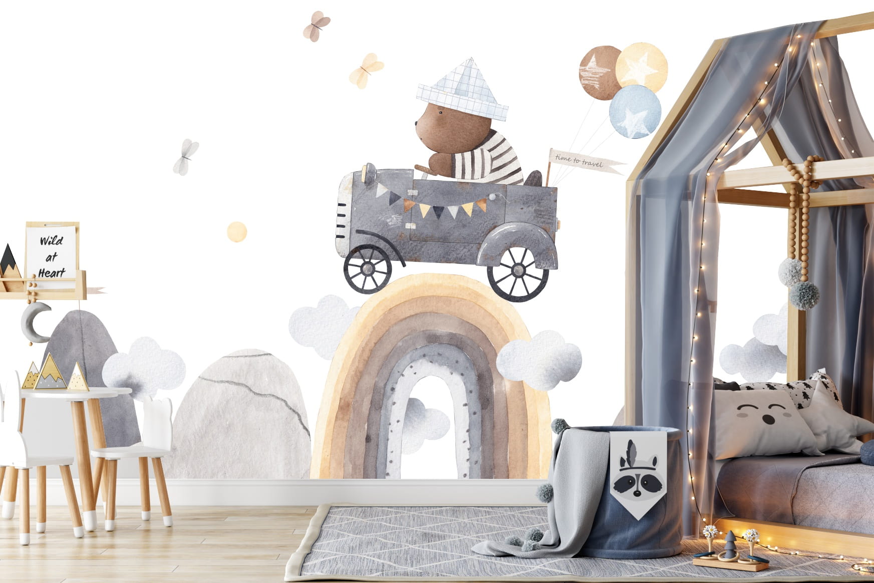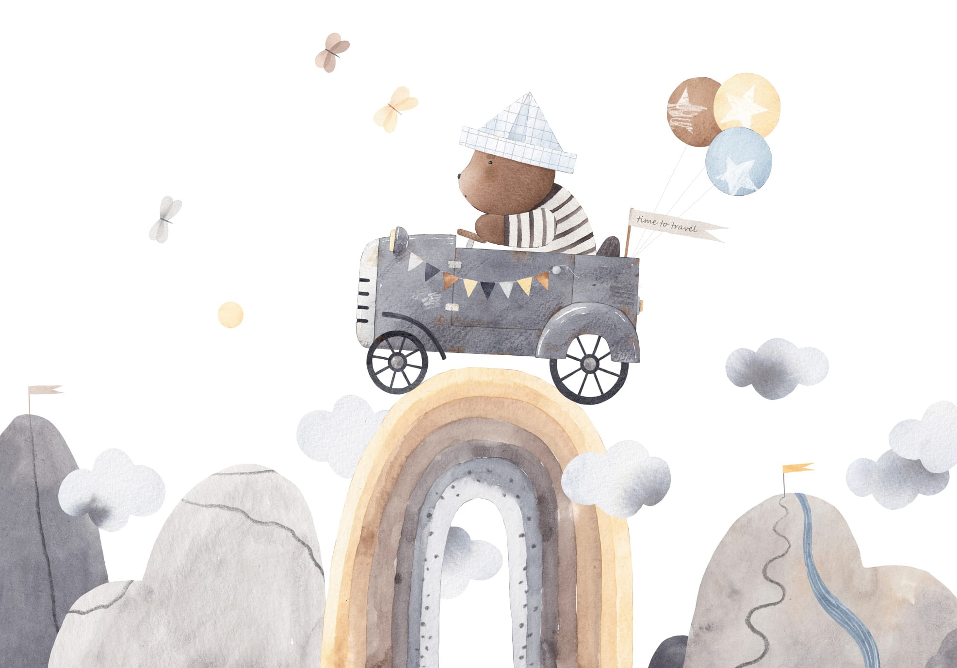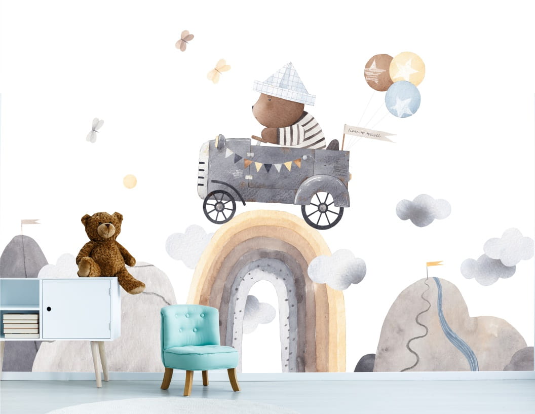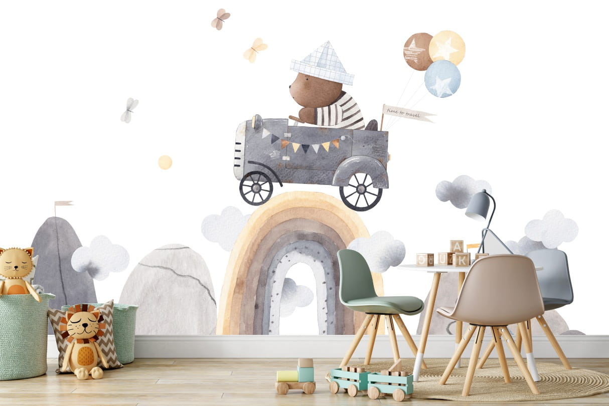 Fototapeta dla chłopca RETRO AUTO MIŚ BOHO TĘCZA