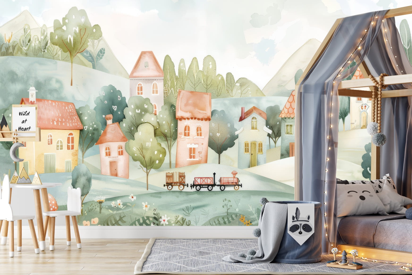 Fototapeta dla dzieci BAJKOWE MIASTECZKO W GÓRACH POCIĄG