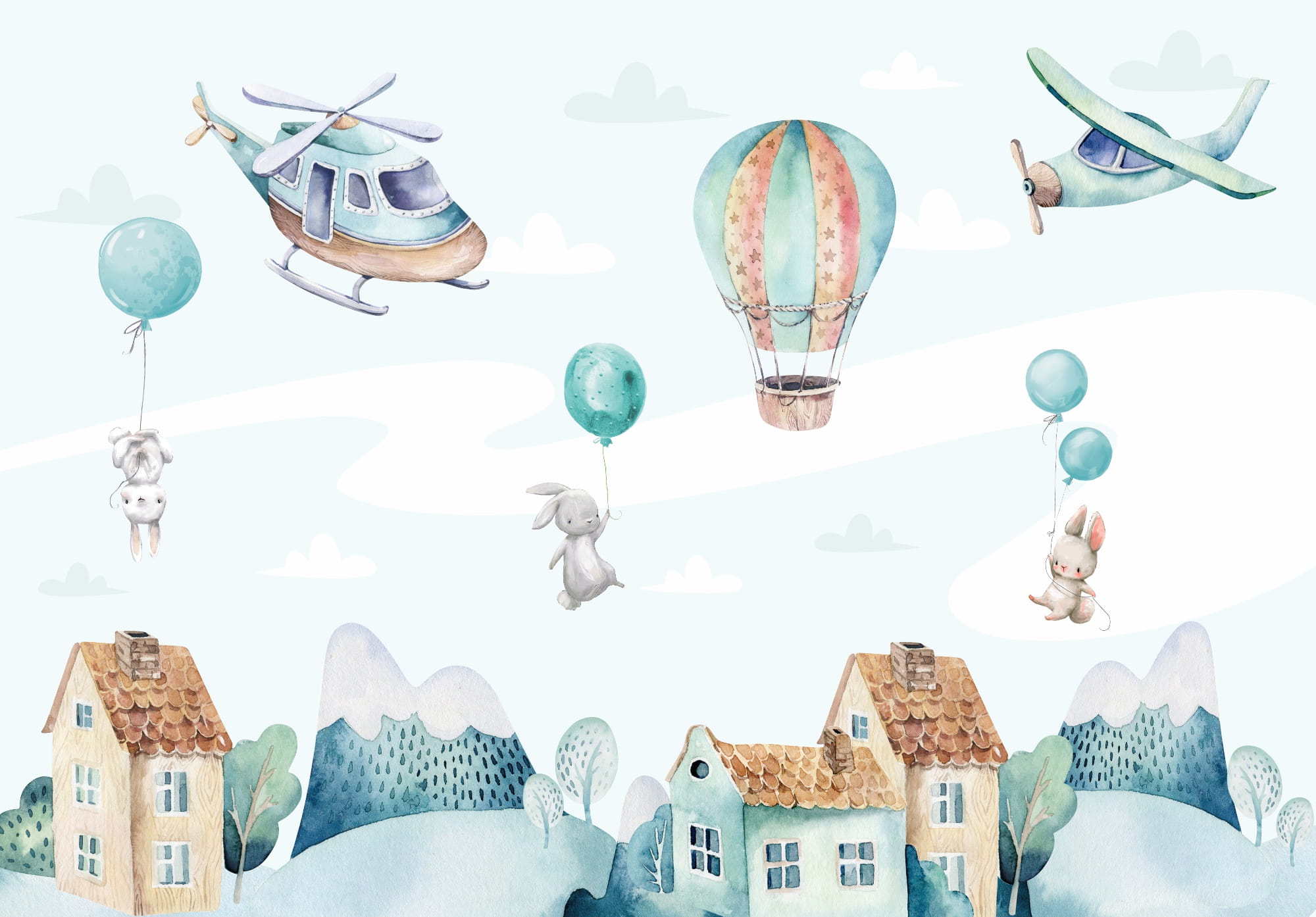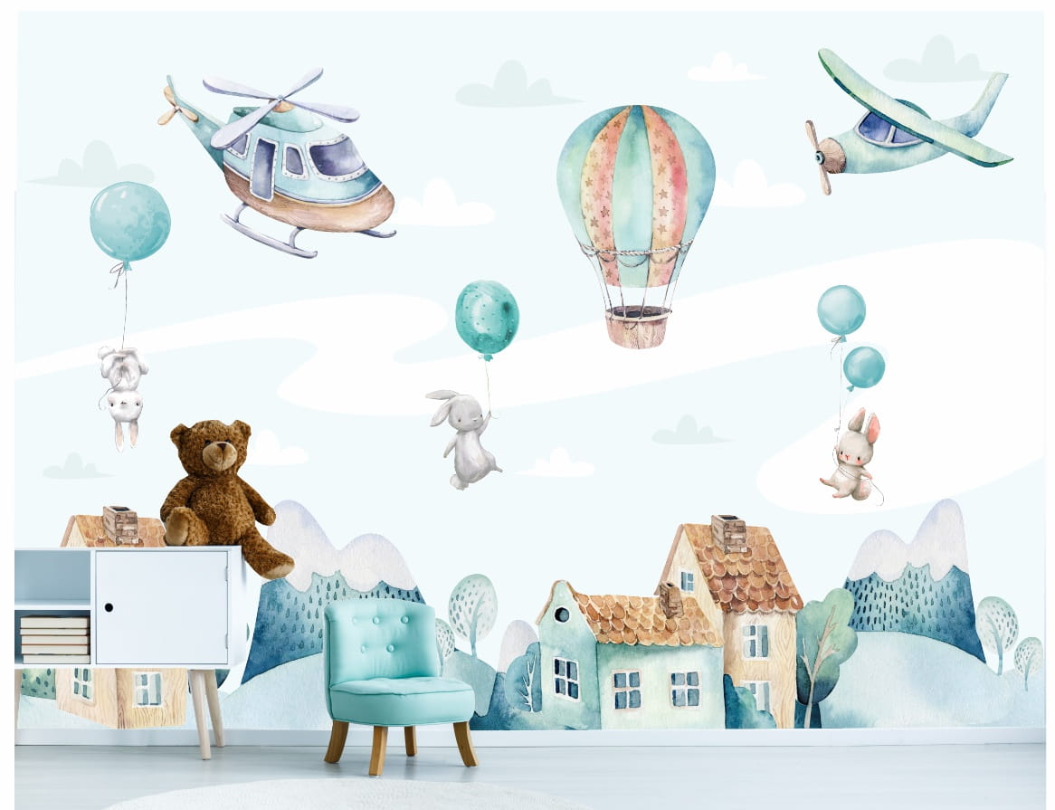 Fototapeta ścienna dla dzieci dla chłopca KRÓLICZKI Z BALONAMI DOMKI SAMOLOTY