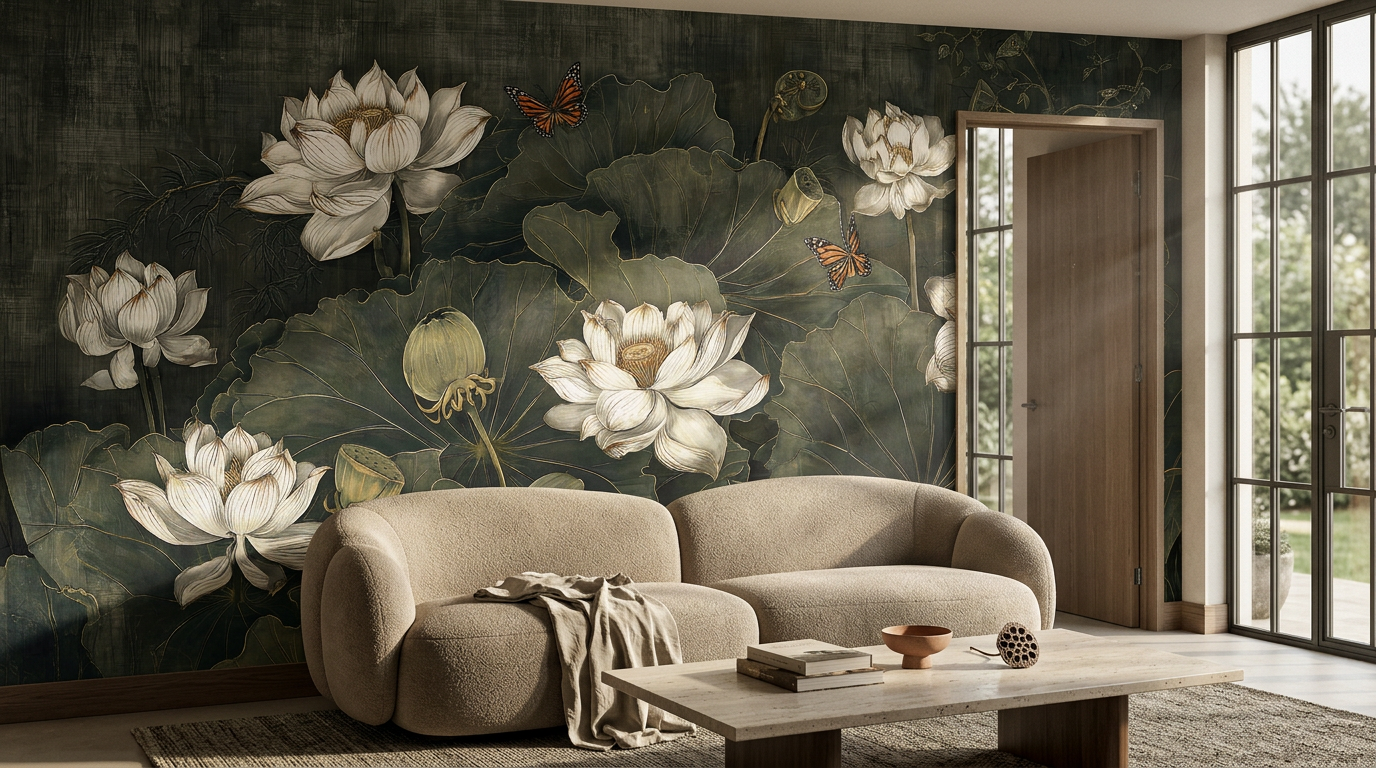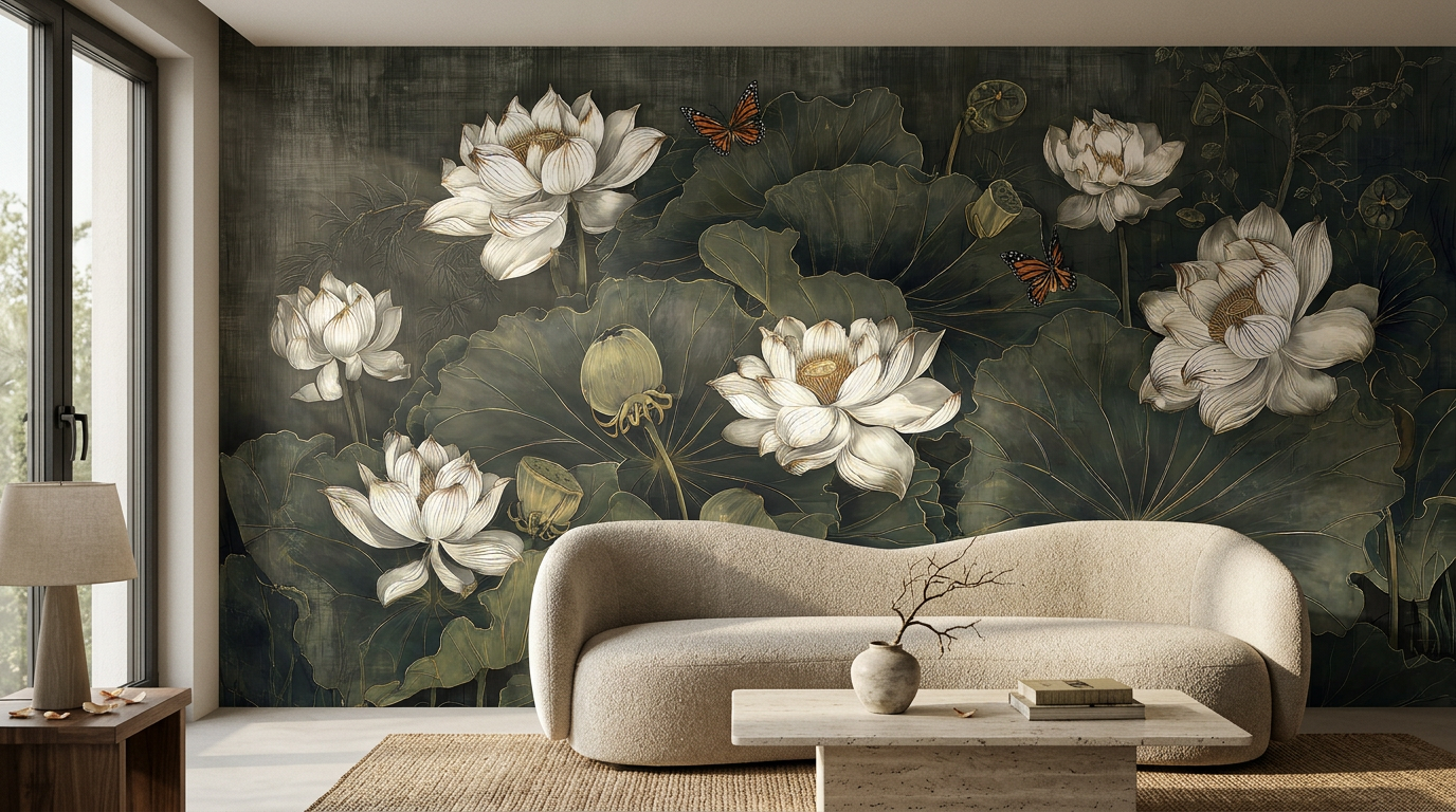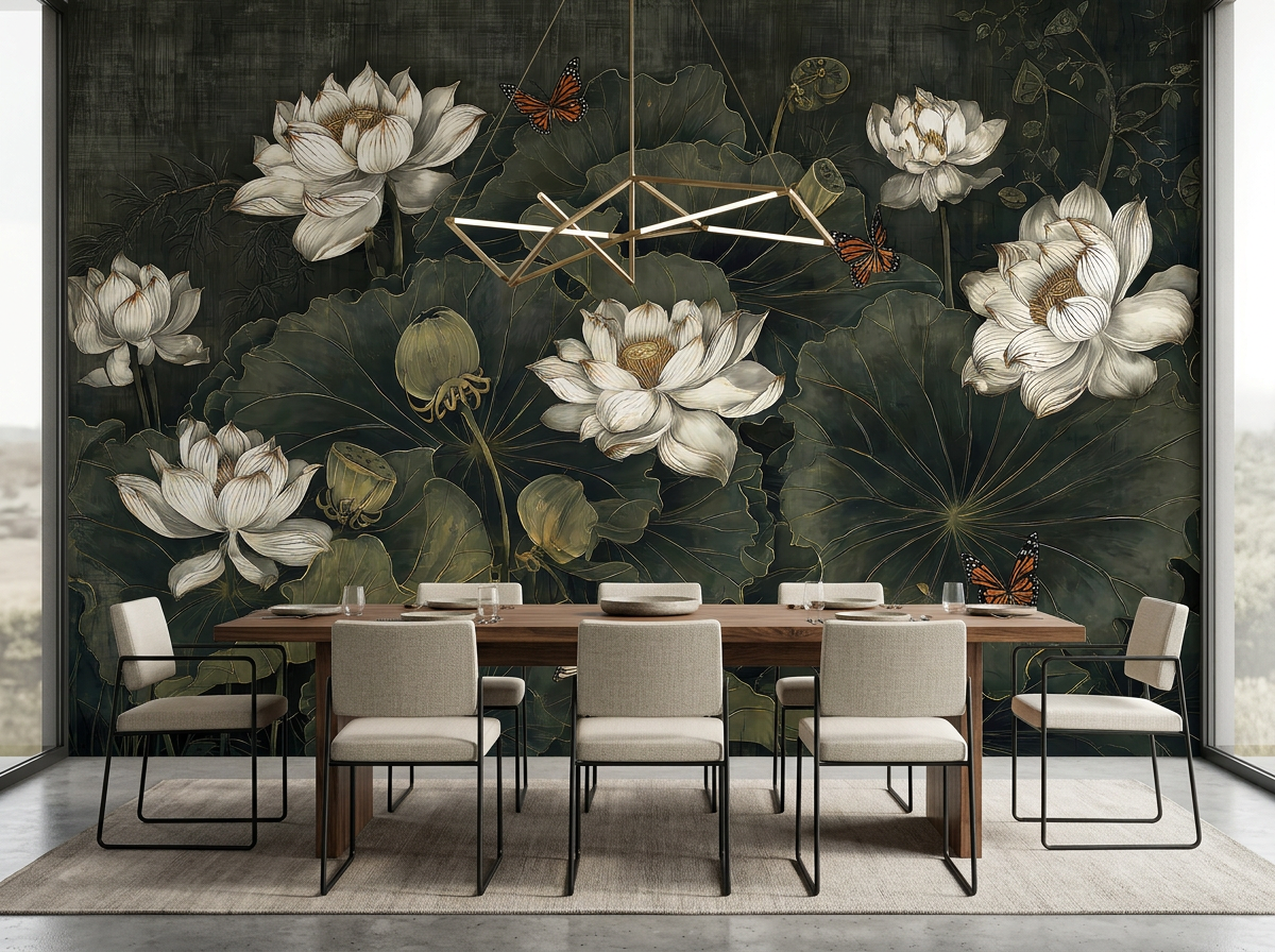 Vintage Lotus Tapestry to artystyczny projekt, który zmienia ścianę w wielkoformatowy gobelin. Centralnym motywem są białe, świetliste kwiaty lotosu rozkwitające na tle głębokich, oliwkowych liści. Całość kompozycji dopełniają subtelne motyle oraz złota konturówka, która nadaje projektowi szlachetnego, biżuteryjnego charakteru.