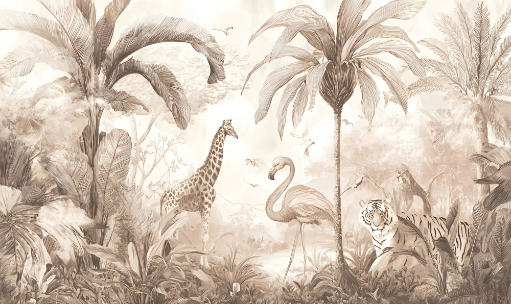 Podróż do serca dzikiej przyrody uchwycona w szlachetnej sepii. ELYSIUM to majestatyczna kompozycja, w której dostojna żyrafa, egzotyczny flaming i tajemniczy tygrys wyłaniają się z bujnego, palmowego gaju. Utrzymana w tonacji ciepłego beżu, przypomina zabytkową ilustrację ze starożytnego zielnika lub klasyczną miedziorytową ryciny. To wzór, który nadaje wnętrzu szlachetny, historyczny rys, tworząc atmosferę przygody, elegancji i nostalgicznego luksusu.
