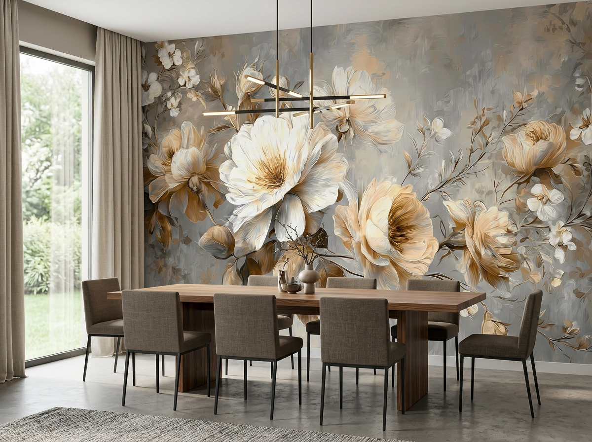 Klasyczne piękno w nowej odsłonie. FLORESSA to wielkoformatowe dzieło sztuki, które przenosi urok barokowych ogrodów wprost do nowoczesnych wnętrz. Kremowe i miodowe róże, namalowane z niezwykłą ekspresją, wyłaniają się z dynamicznego, strukturalnego tła. Ciepła paleta barw i delikatne, świetliste akcenty sprawiają, że wzór ten emanuje szlachetnością, wprowadzając do pomieszczenia aurę luksusu i przytulności.