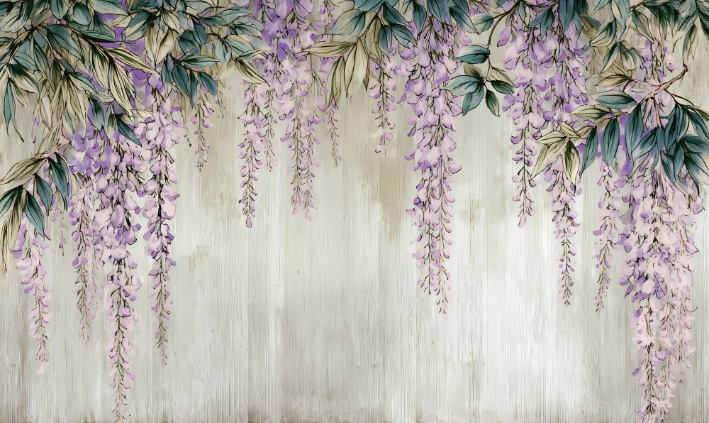 Kaskada spokoju i elegancji. WISTERIA to poetycka kompozycja, w której delikatne, fioletowe grona kwitnącej glicynii zdają się spływać kaskadą z sufitu na tło o teksturze bielonego, przecieranego drewna. Ten projekt to harmonia między naturalnym wdziękiem botaniki a szlachetnością ręcznego rysunku. Wprowadza do wnętrza aurę śródziemnomorskiego ogrodu i artystycznej swobody, pozostając przy tym definicją luksusu.