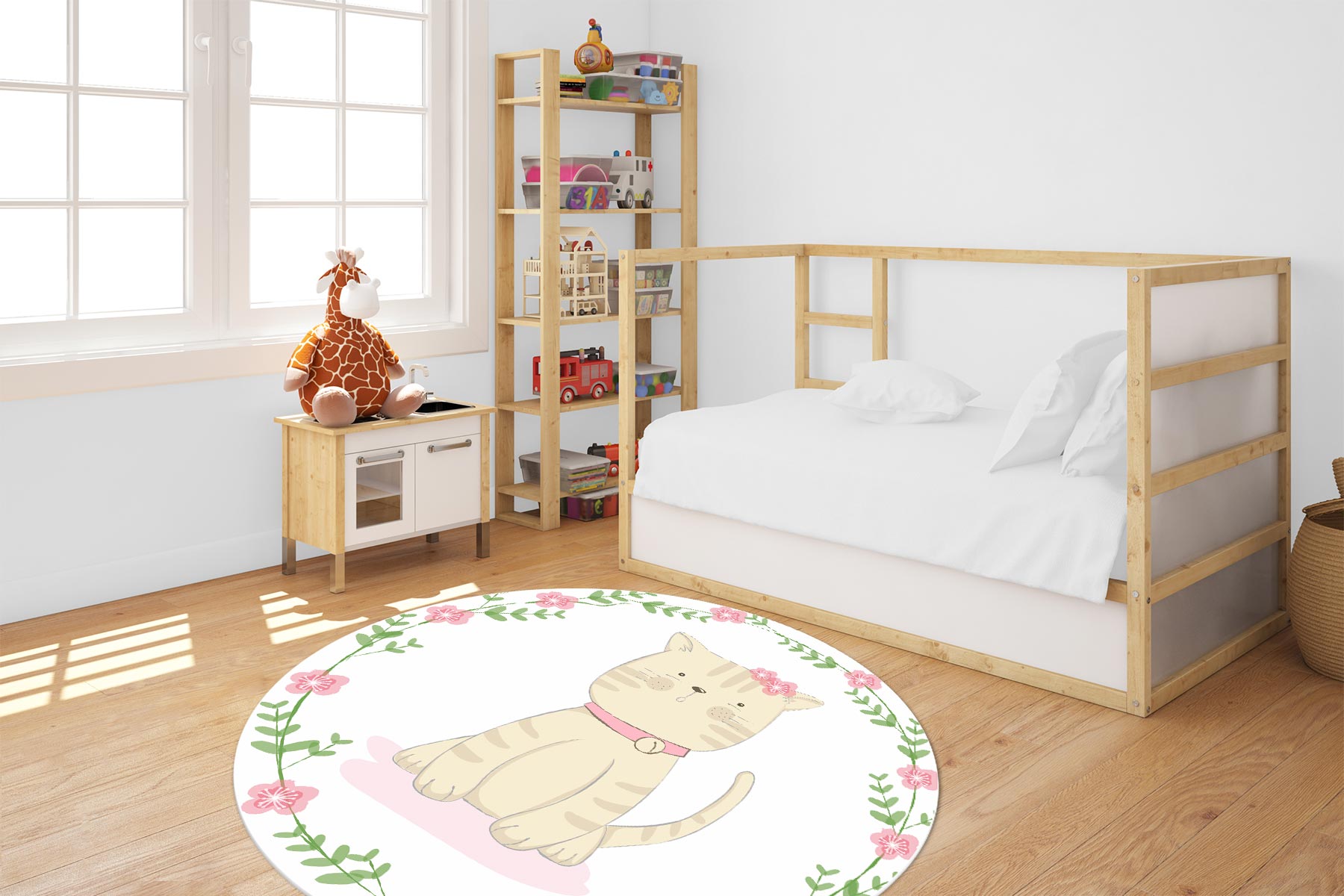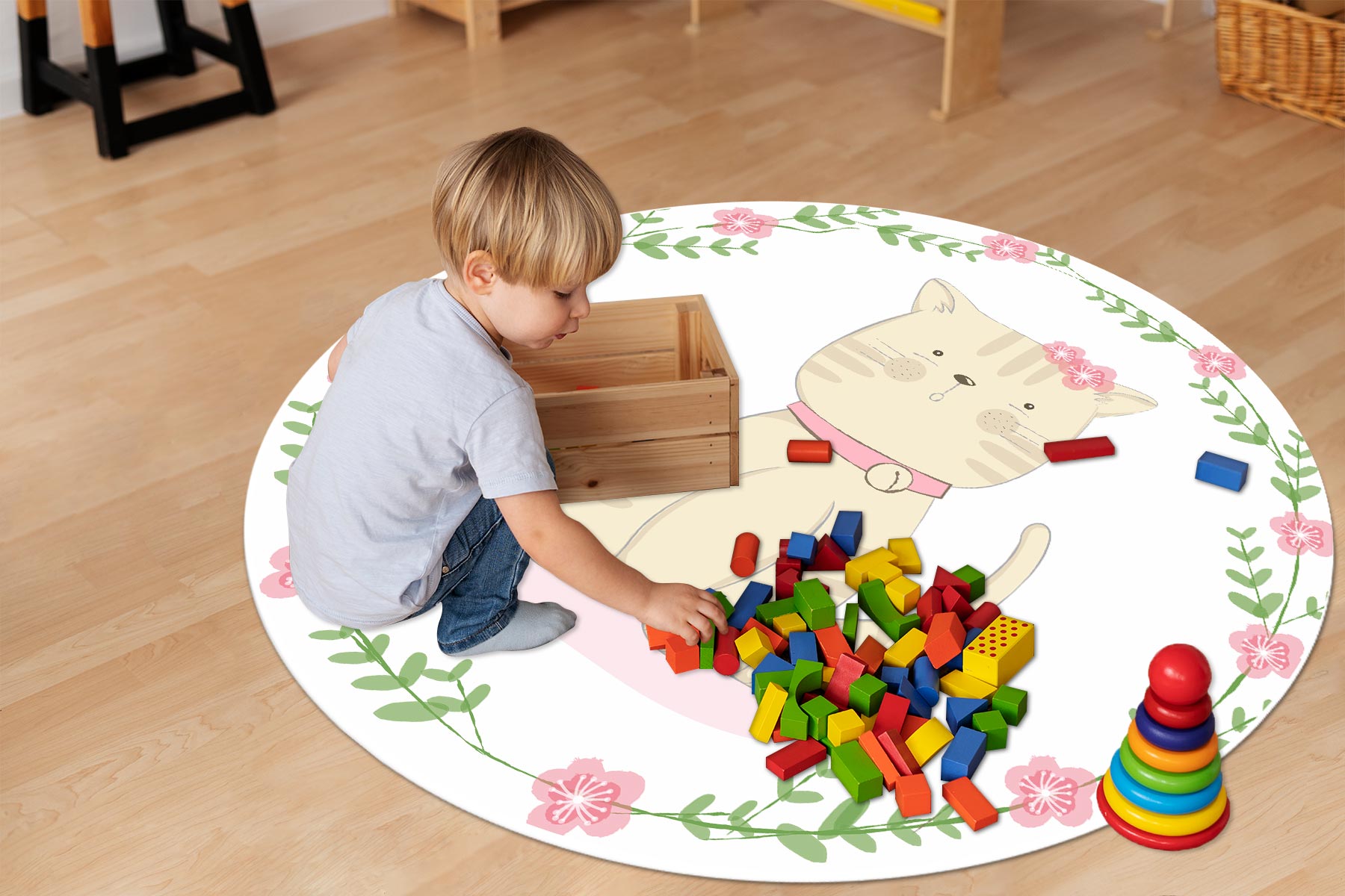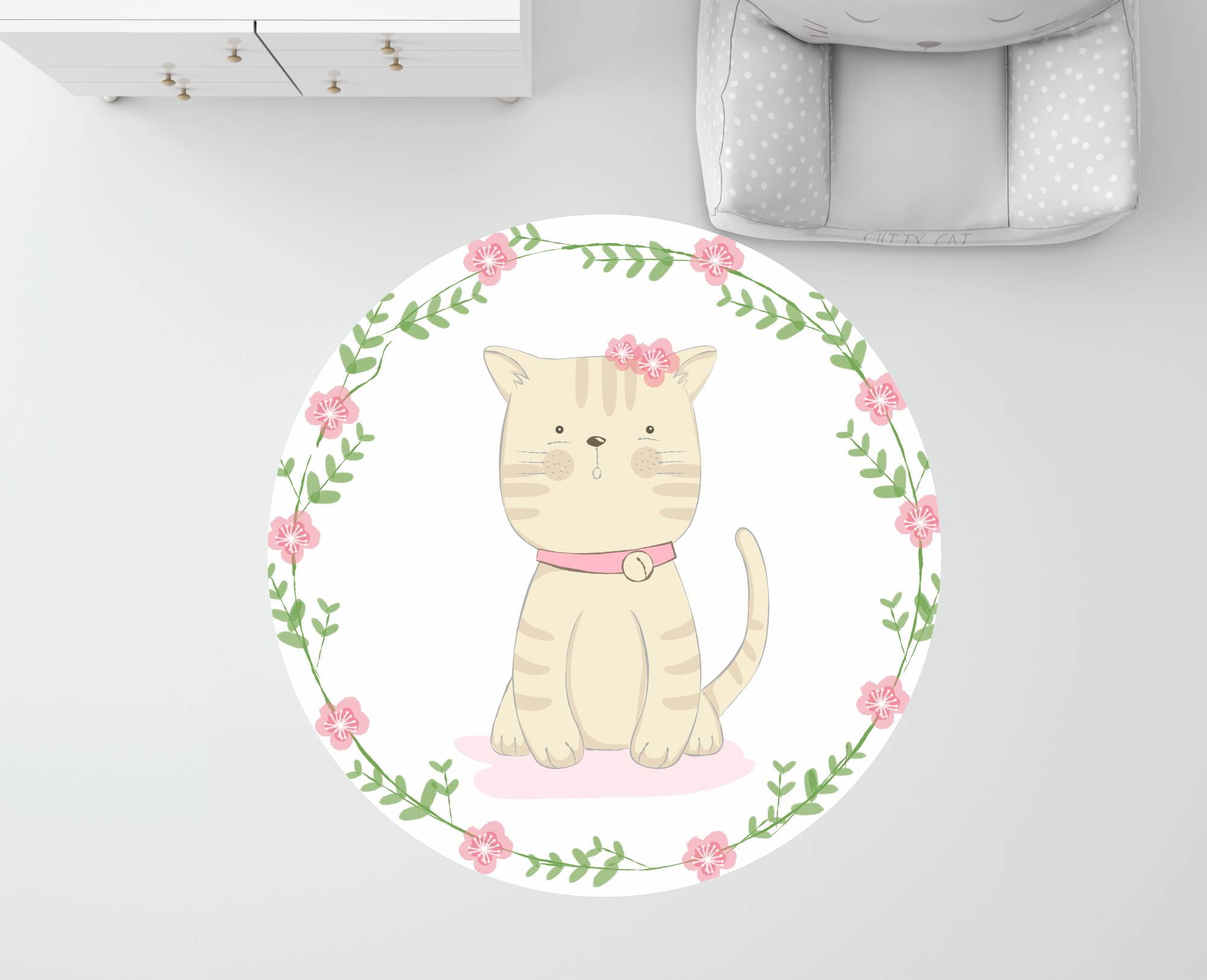 MATA WINYLOWA OKRĄGŁA dla dzieci do zabawy rudy kot kwiatki