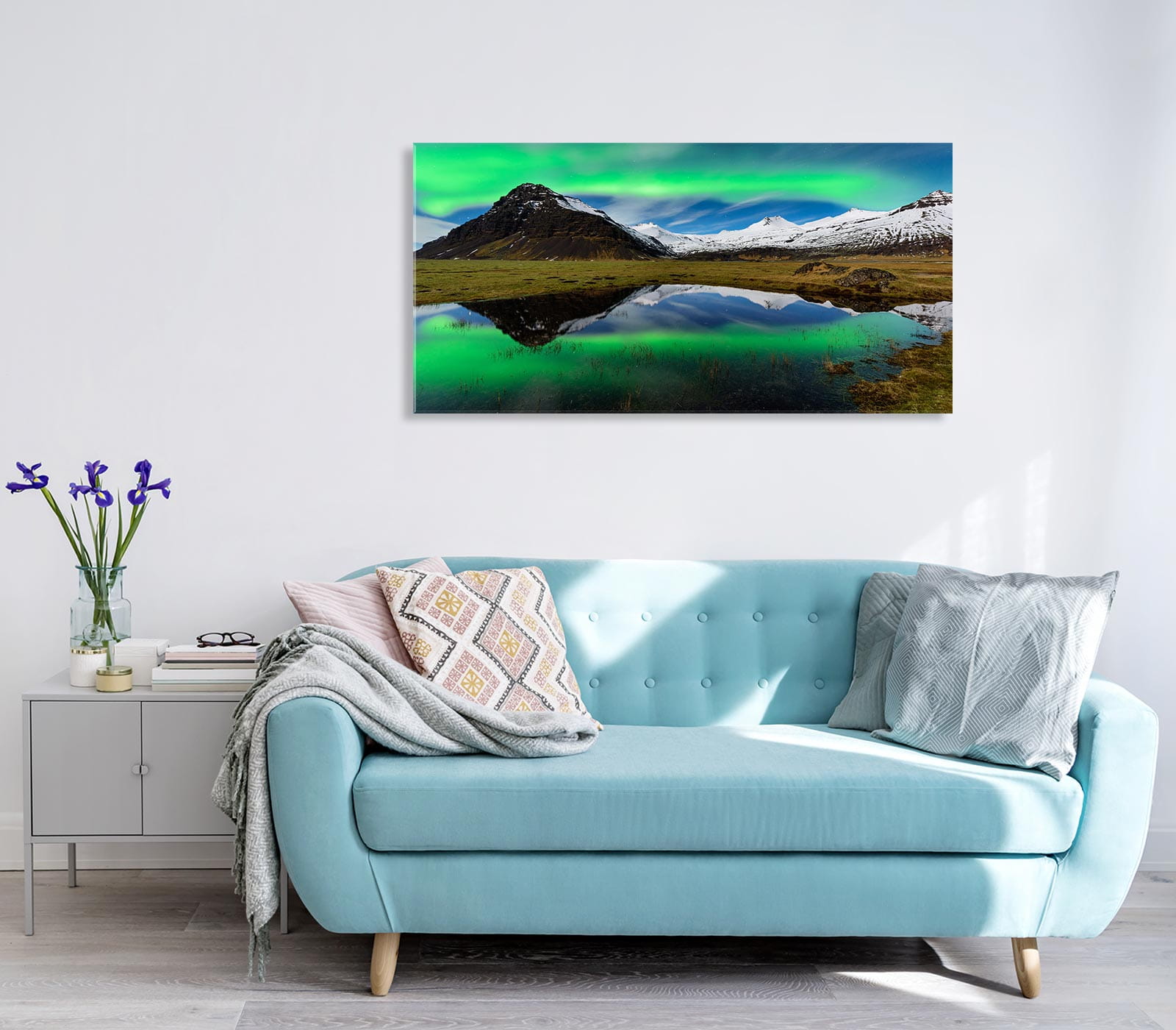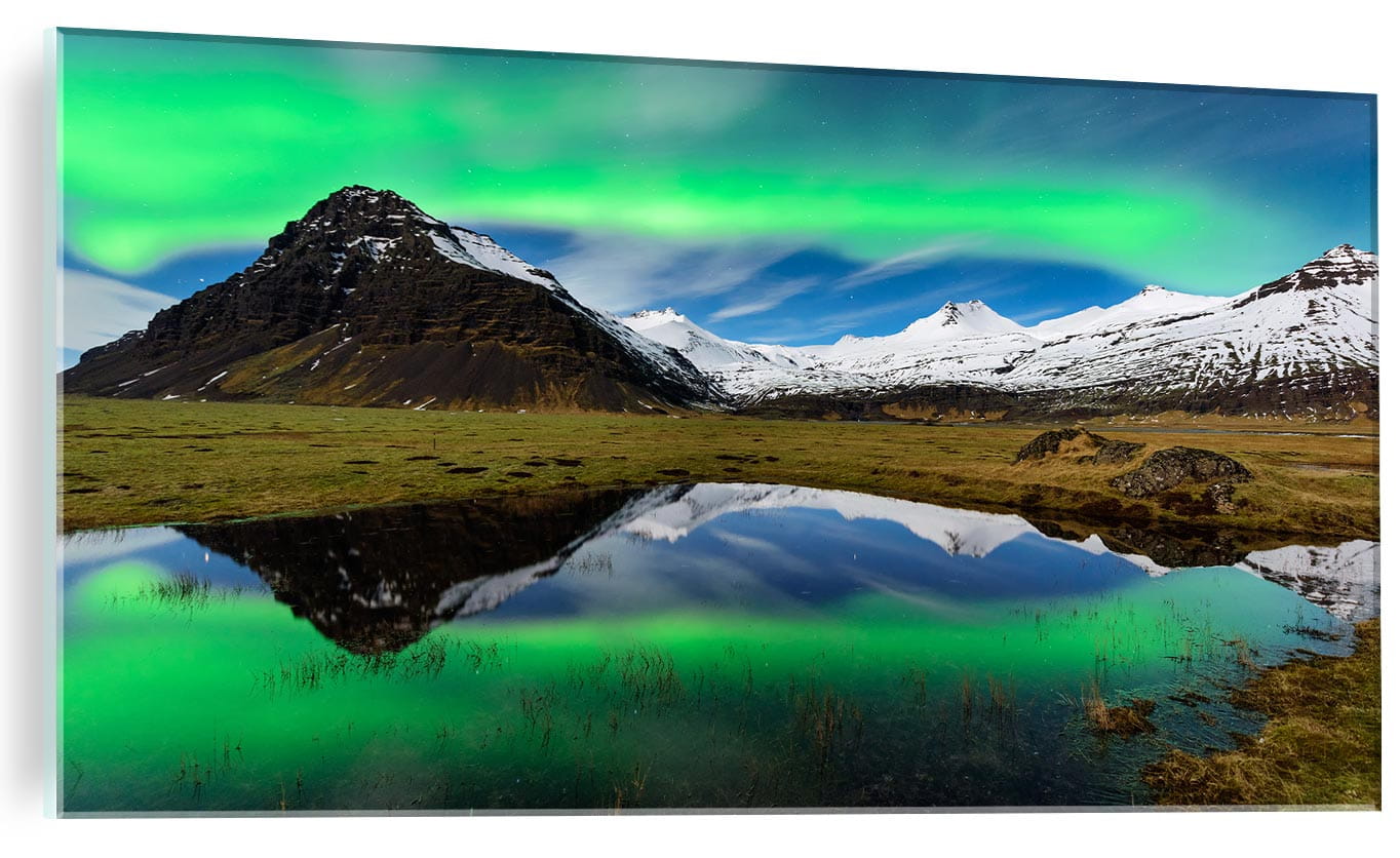 NOWOCZESNY FOTO OBRAZ NA SZKLE ZORZA POLARNA GÓRY