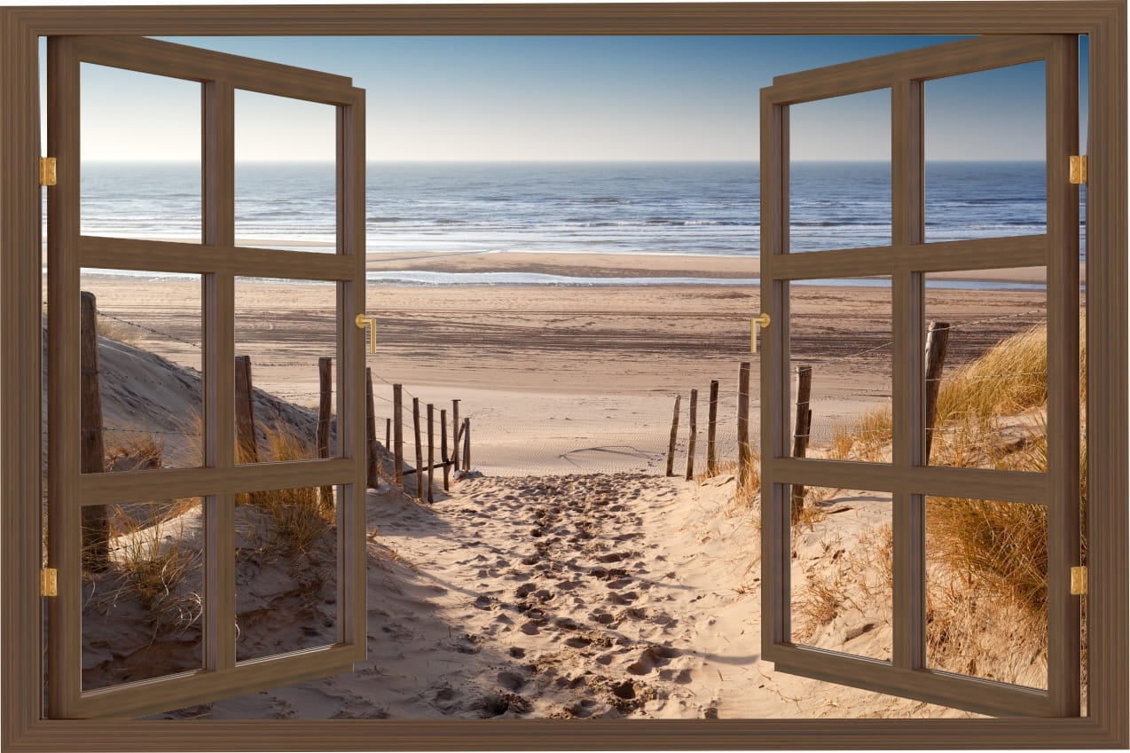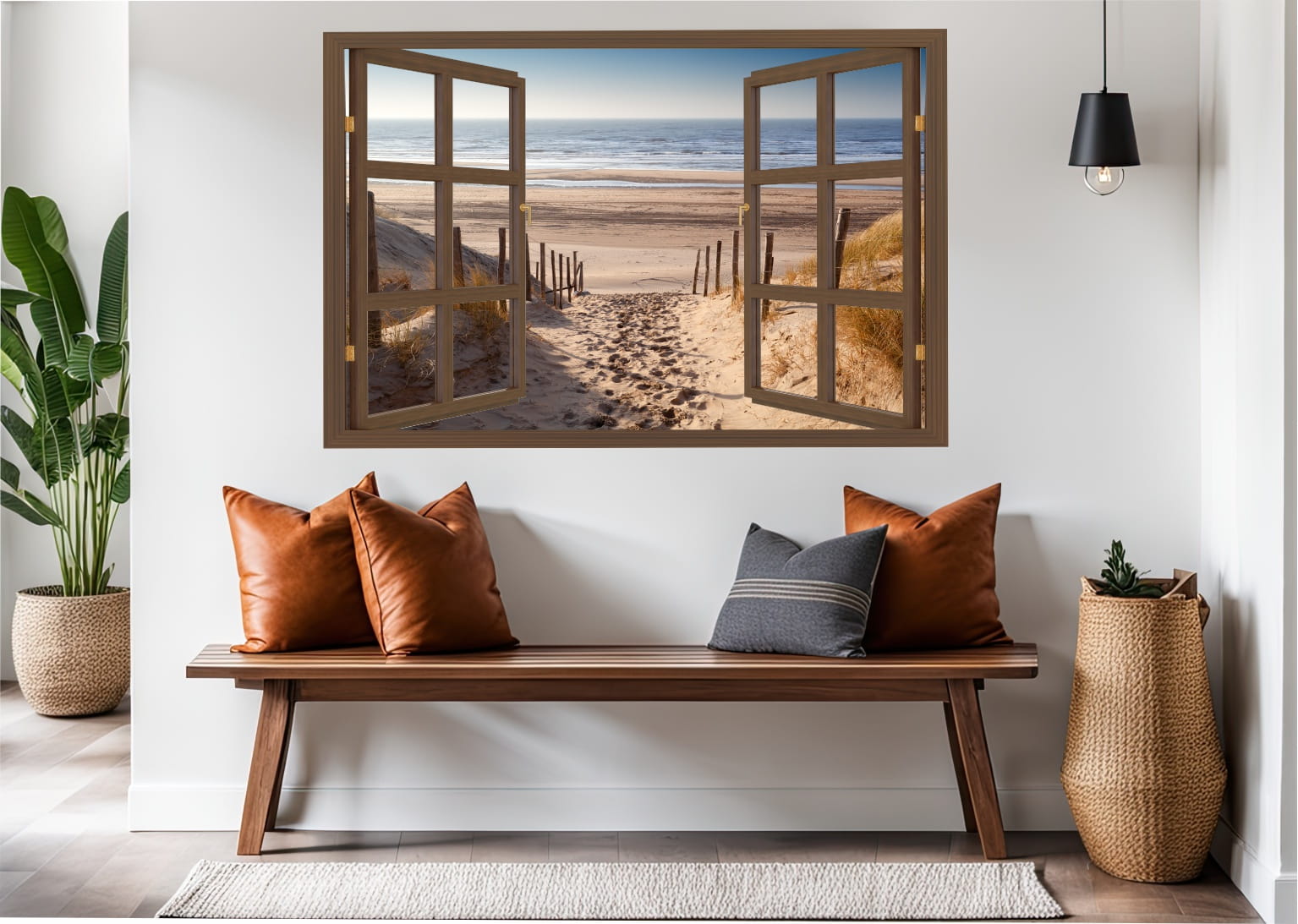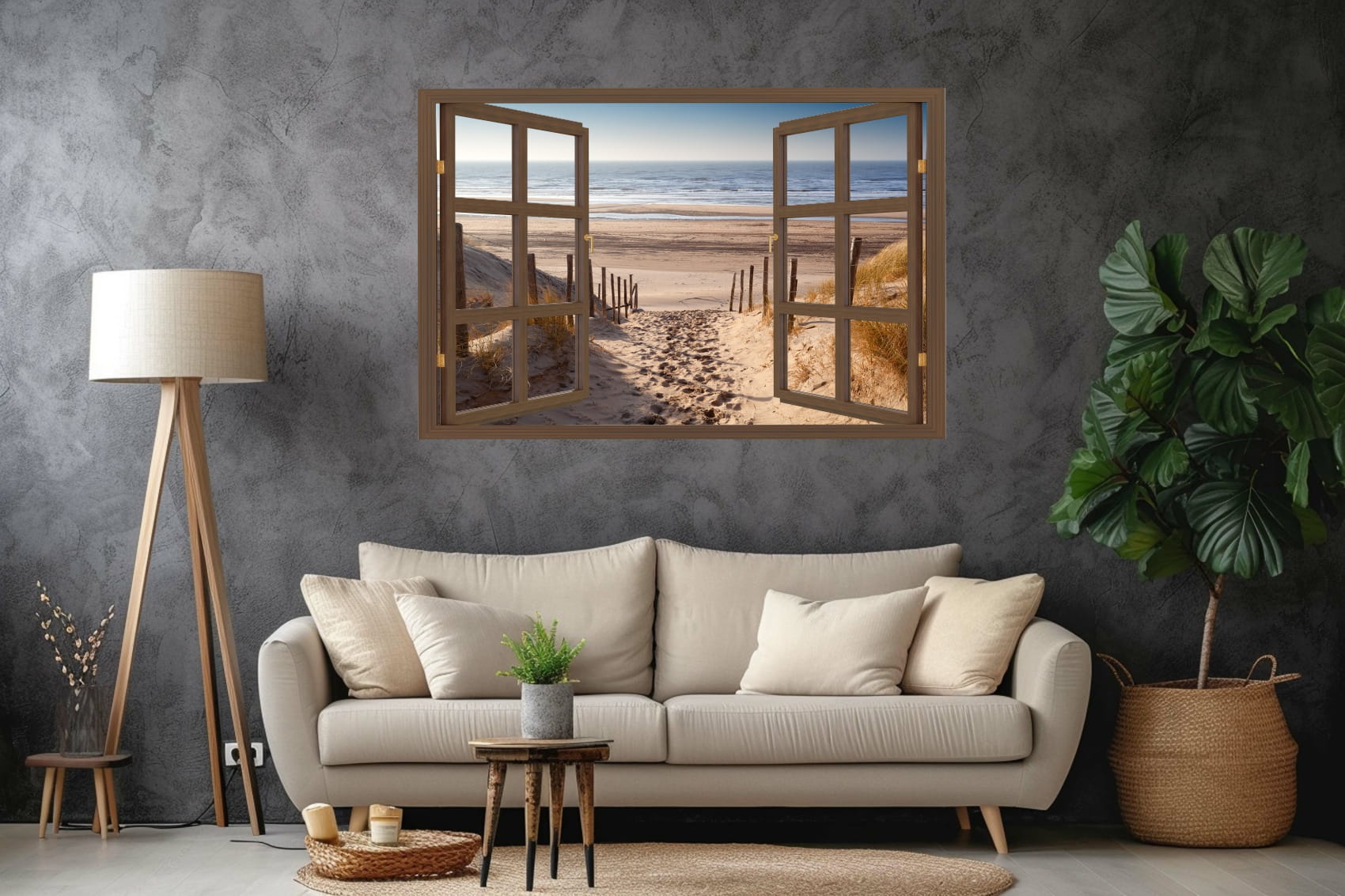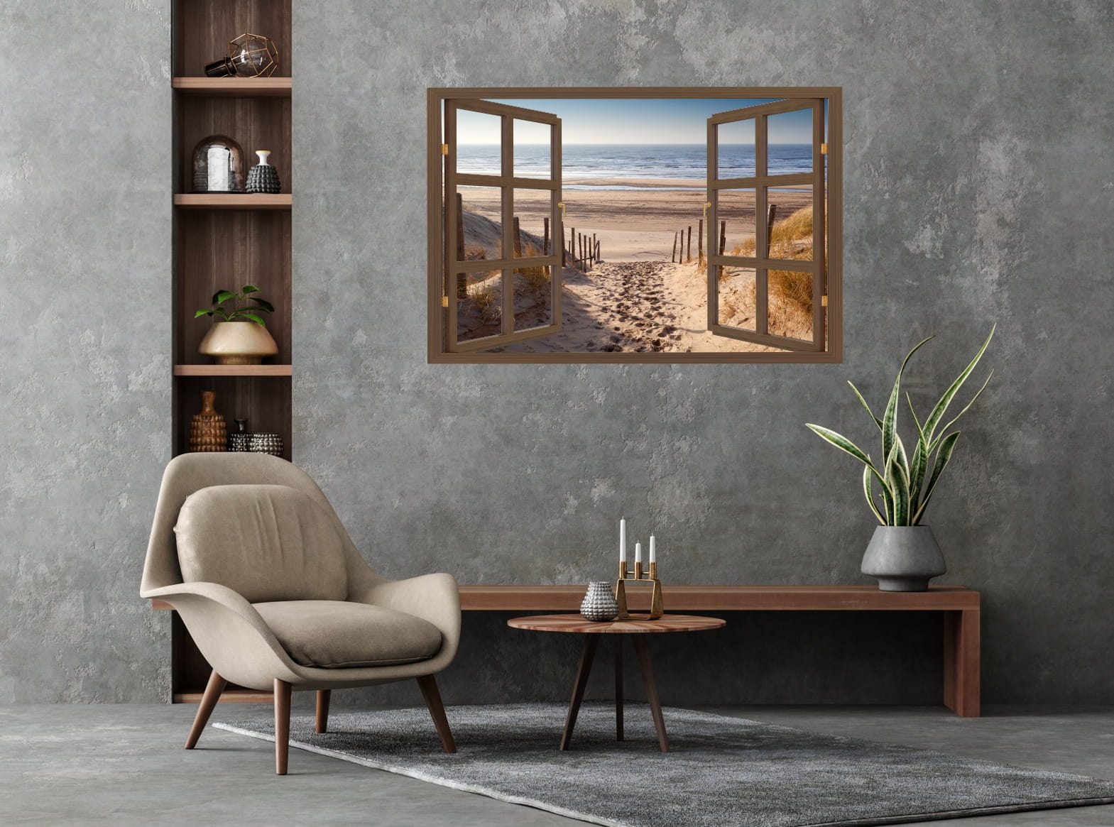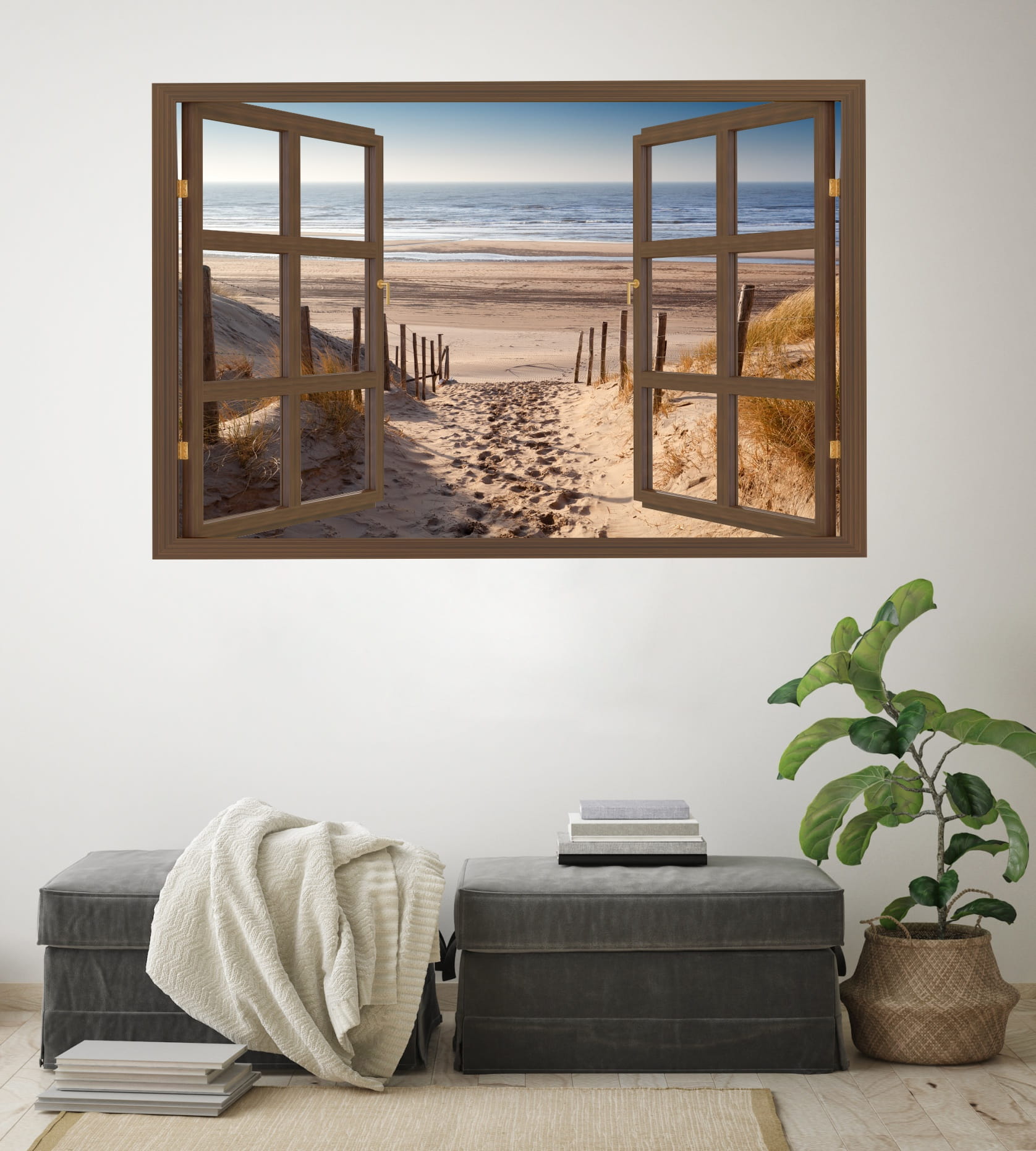 Naklejka do salonu WIDOK PRZEZ BRĄZOWE OKNO morze plaża zejście widok