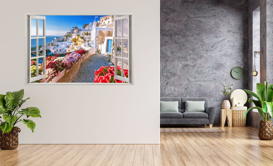 Naklejka do salonu na ścianę WIDOK PRZEZ BIAŁE OKNO Grecja Santorini