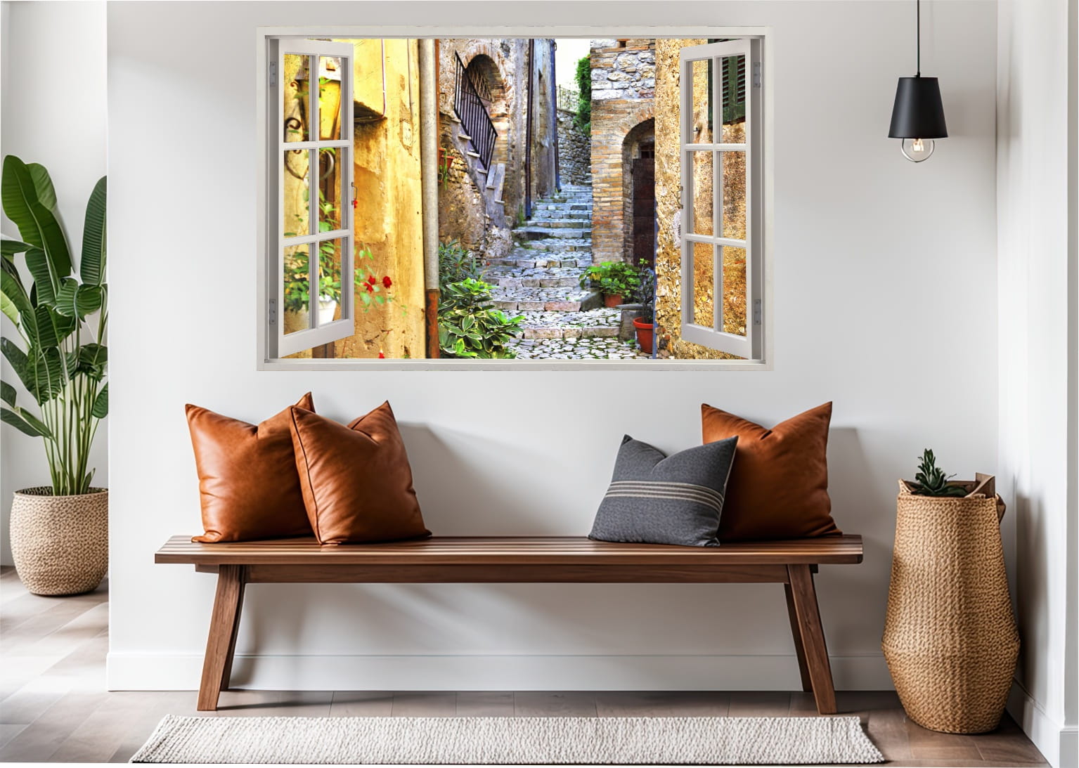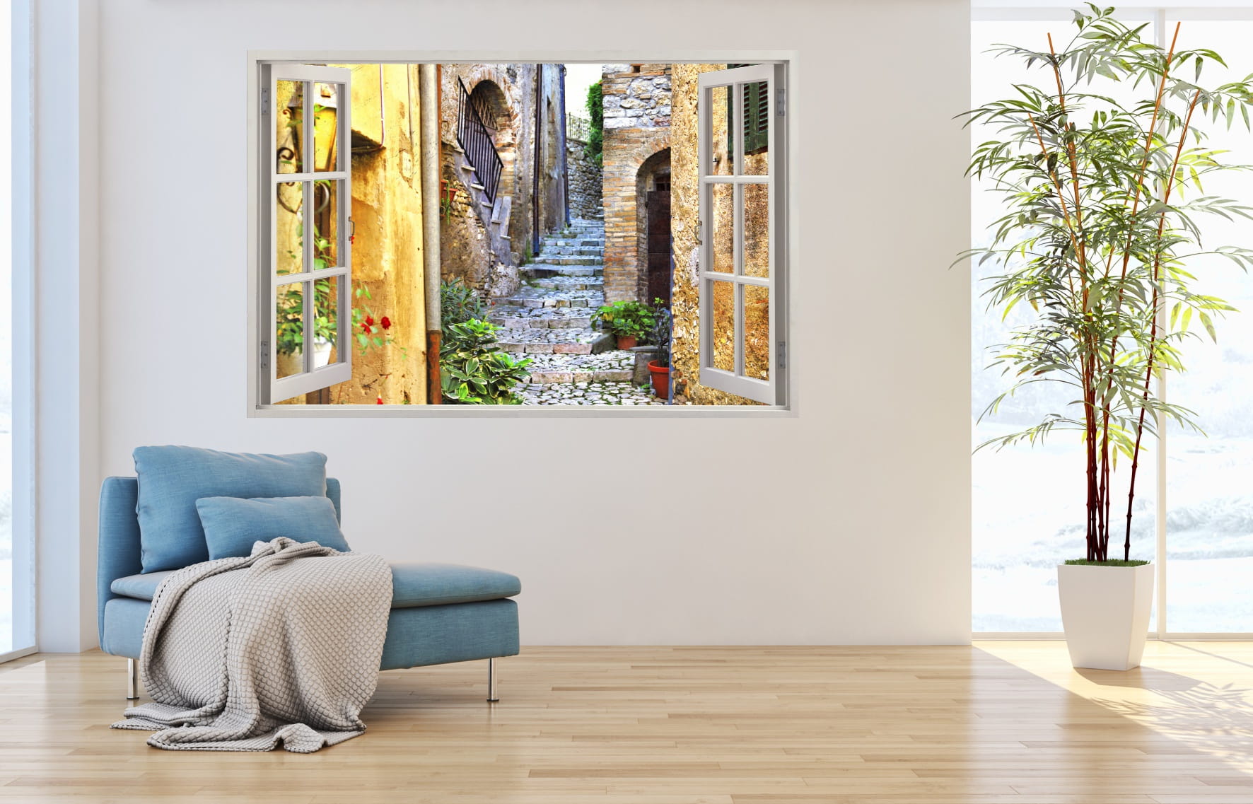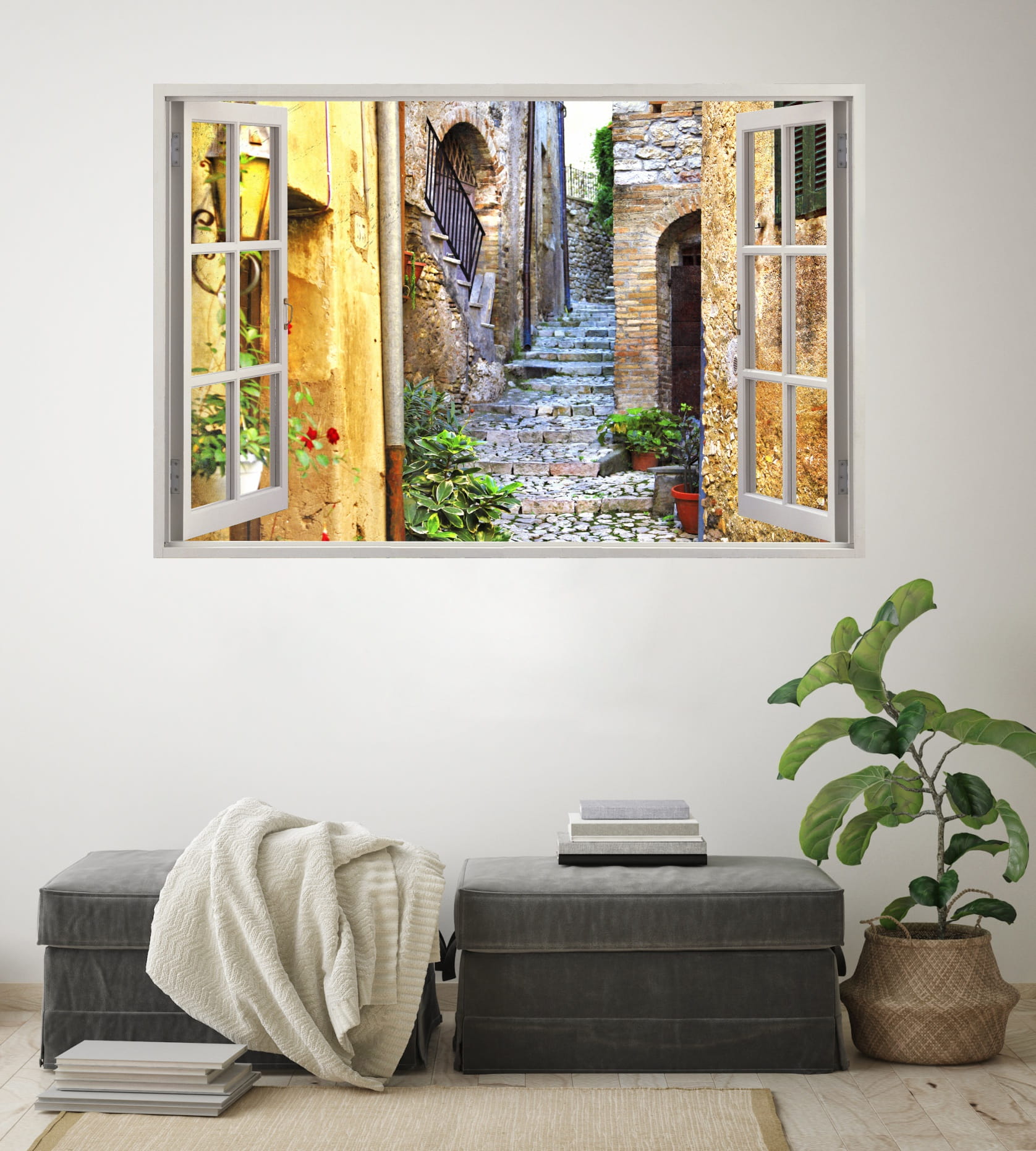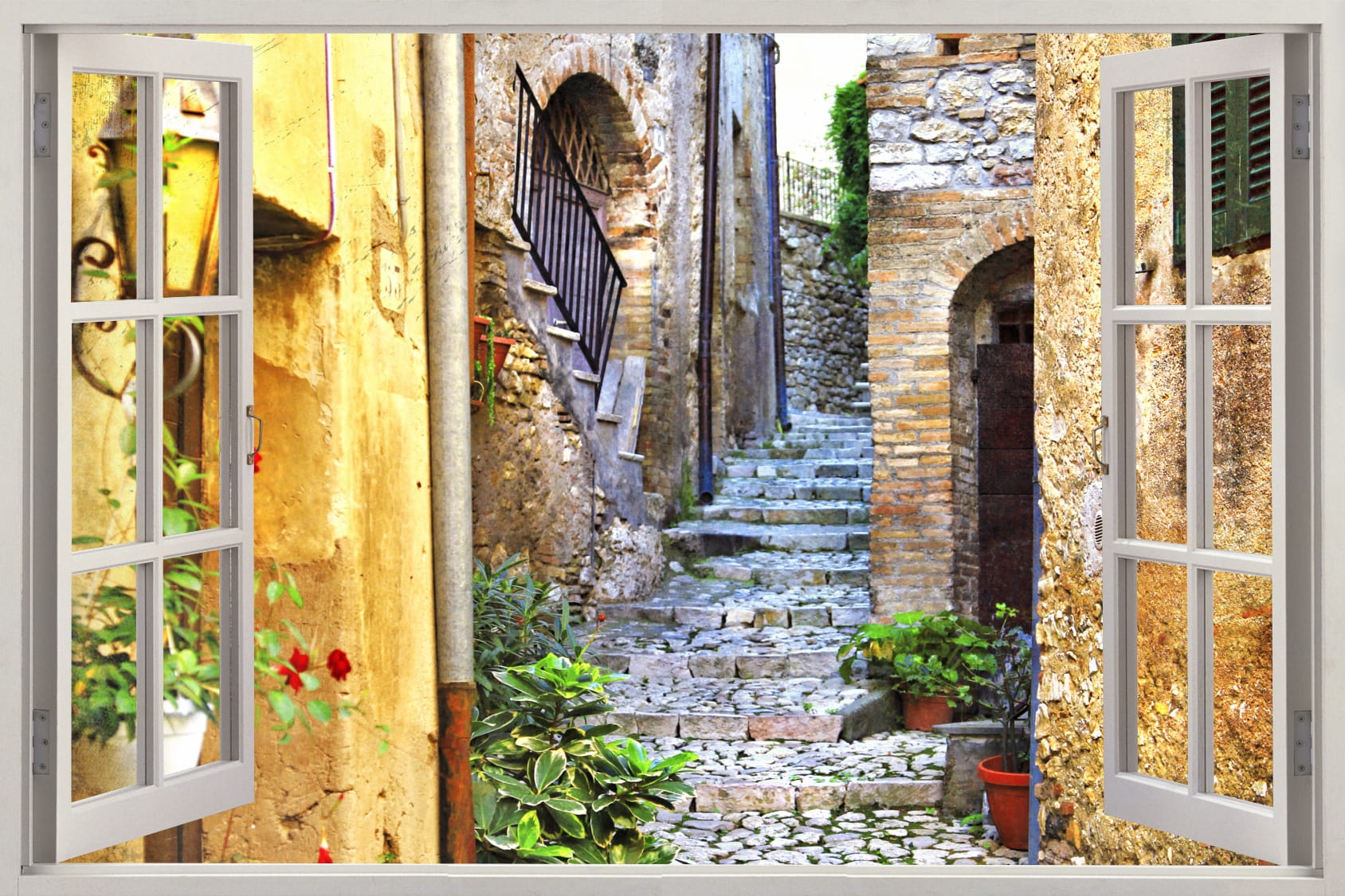 Naklejka do salonu na ścianę WIDOK PRZEZ BIAŁE OKNO uliczka alejka kwiaty