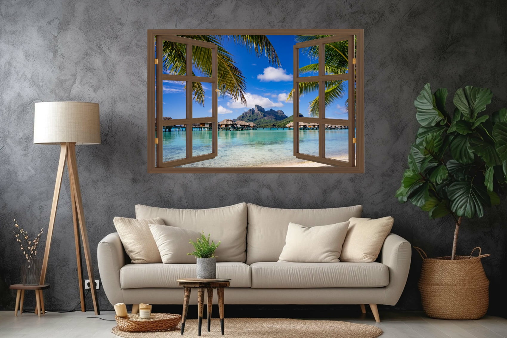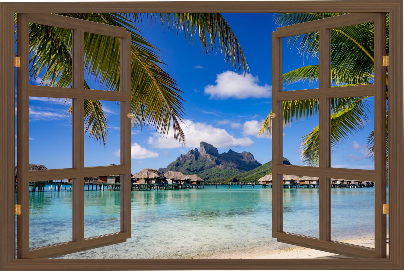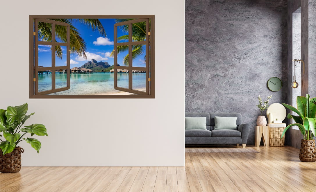 Naklejka do salonu na ścianę WIDOK PRZEZ BRĄZOWE OKNO Bora Bora palmy ocean