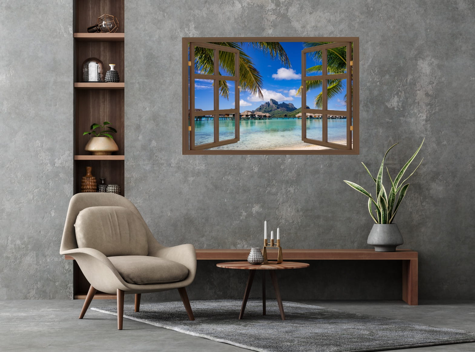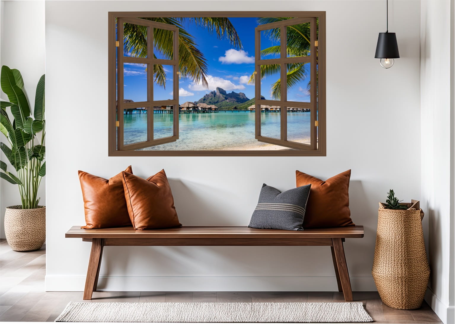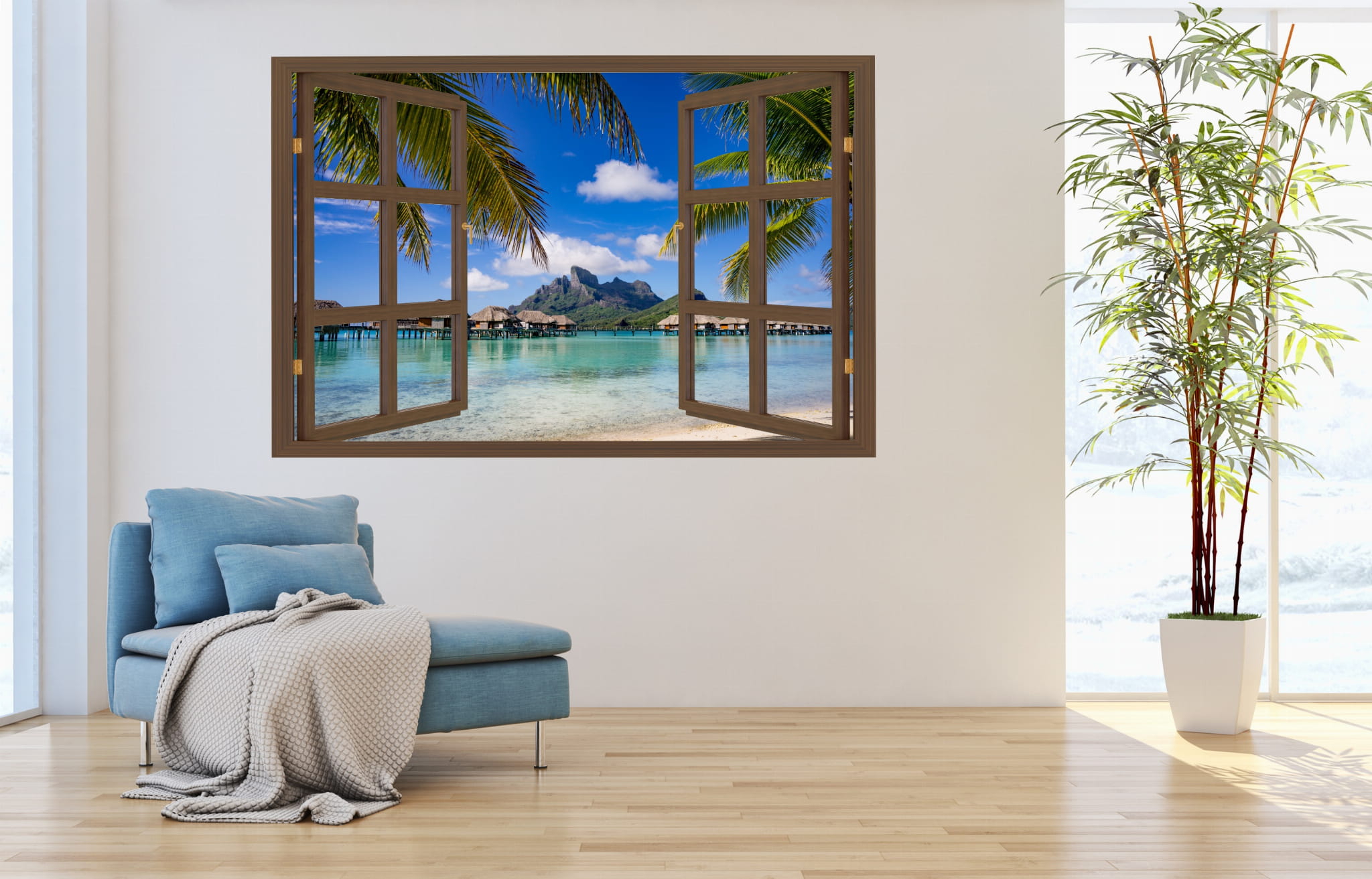 Naklejka do salonu na ścianę WIDOK PRZEZ BRĄZOWE OKNO Bora Bora palmy ocean