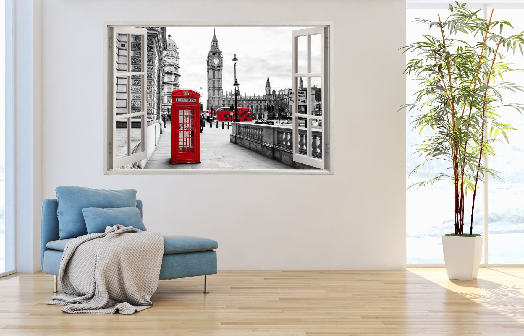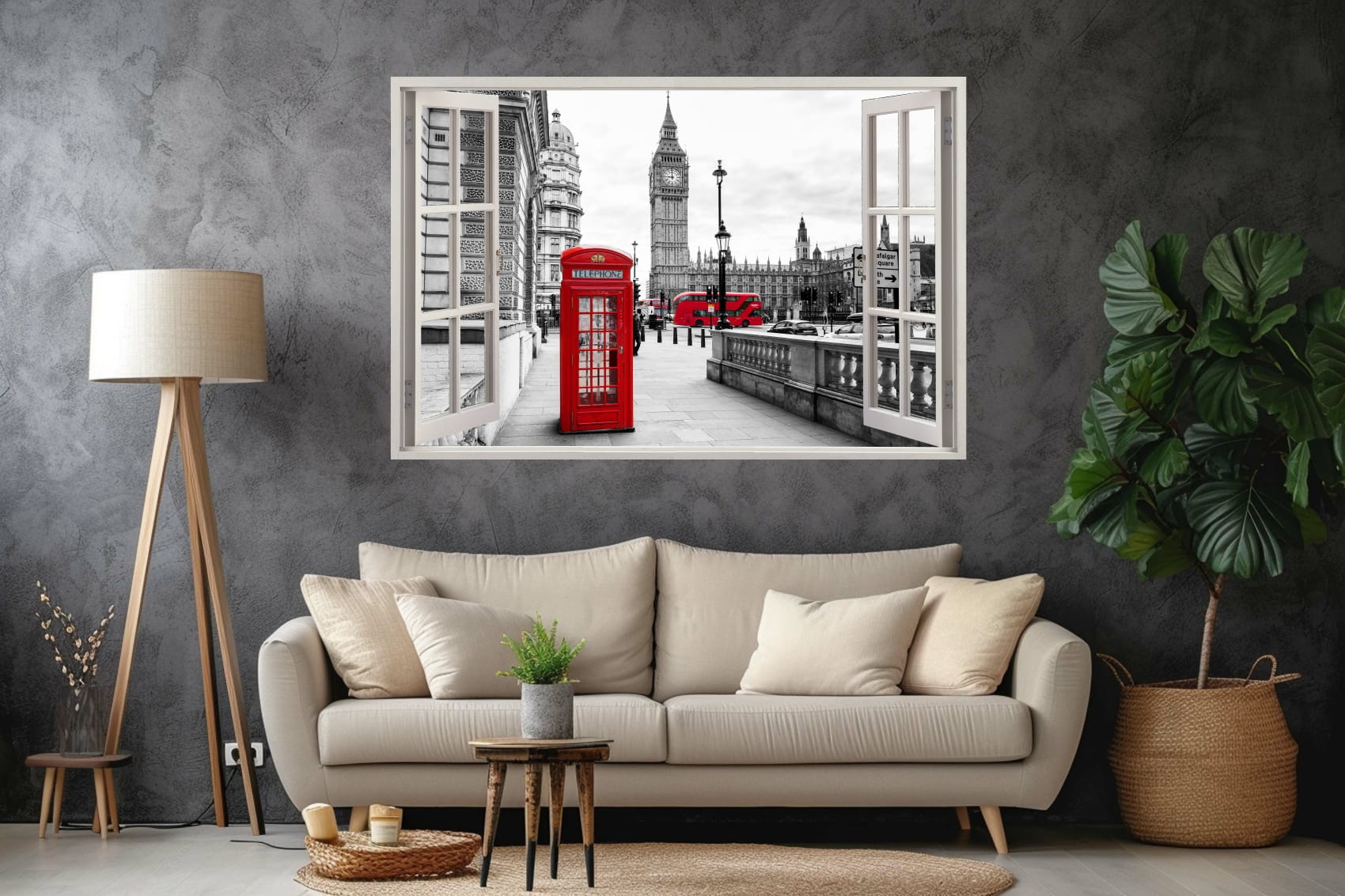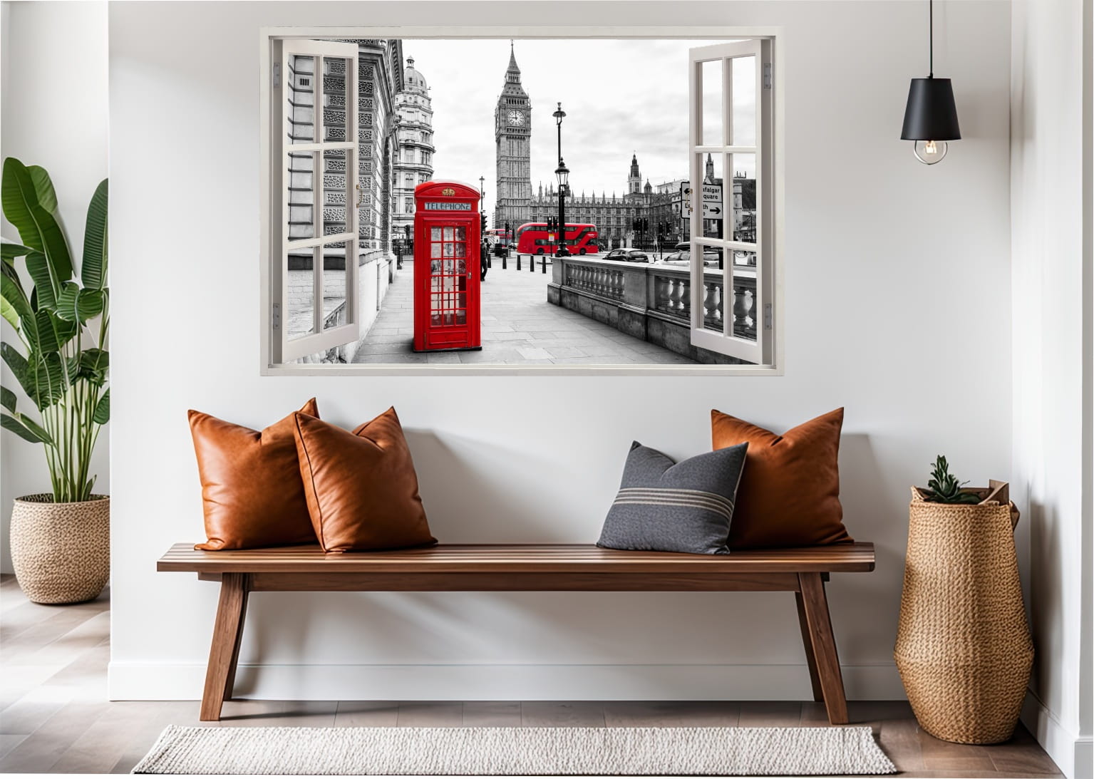 Naklejka ścienna do salonu WIDOK PRZEZ BIAŁE OKNO Londyn BIG BEN ulica