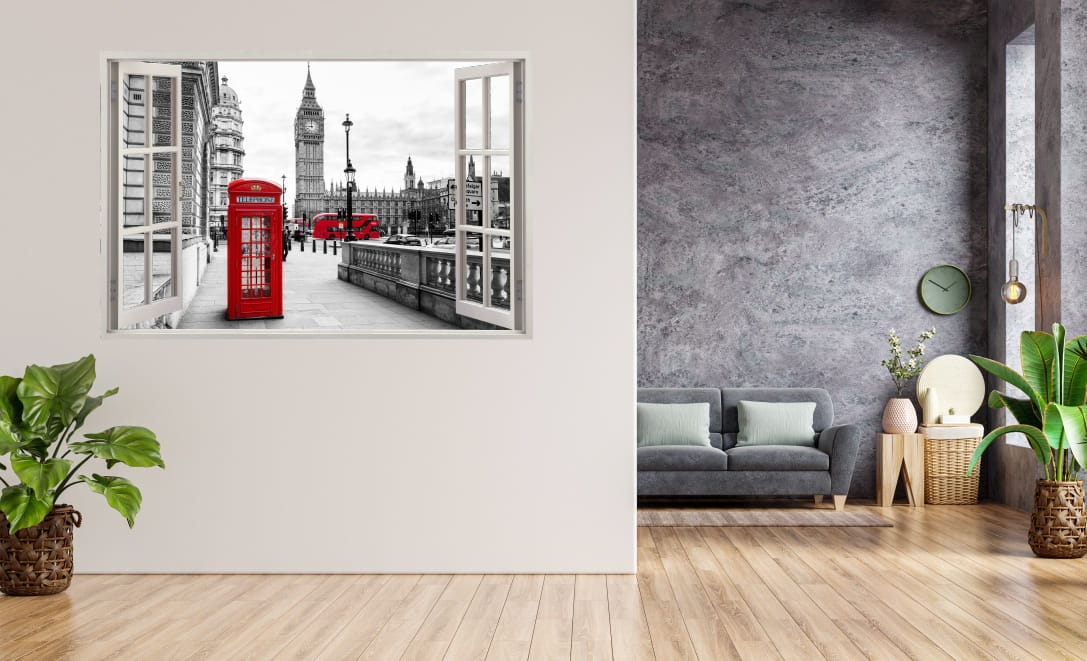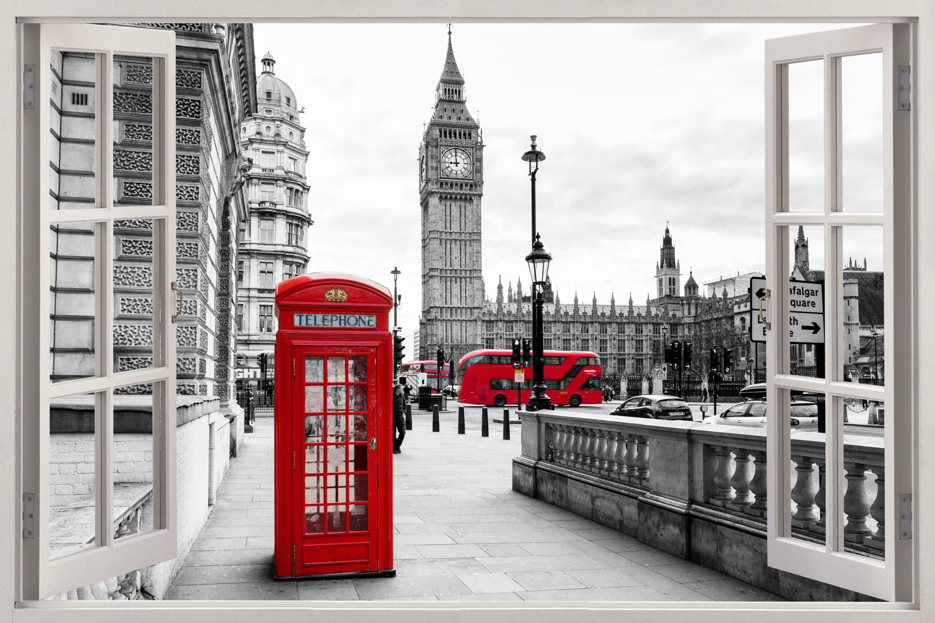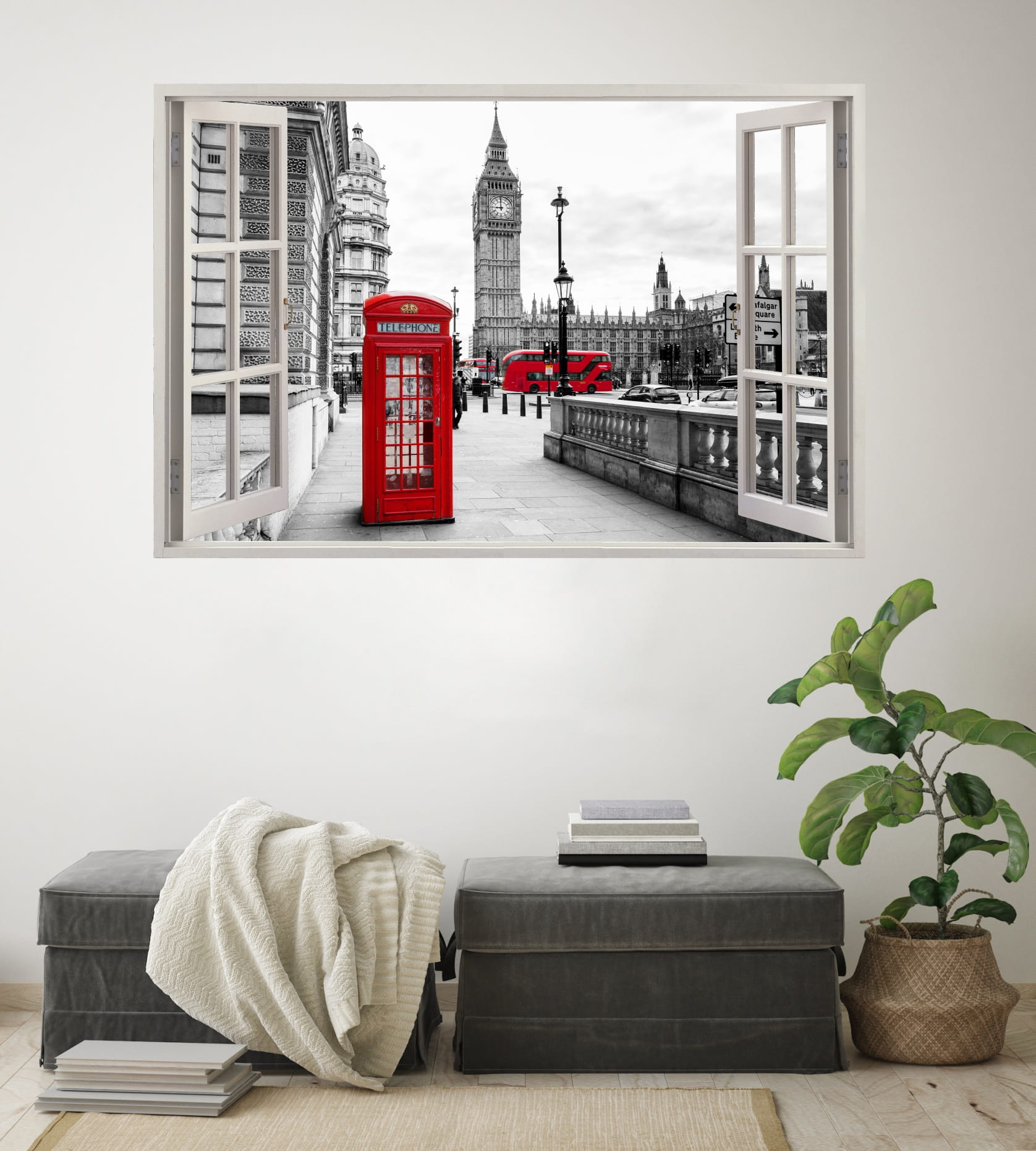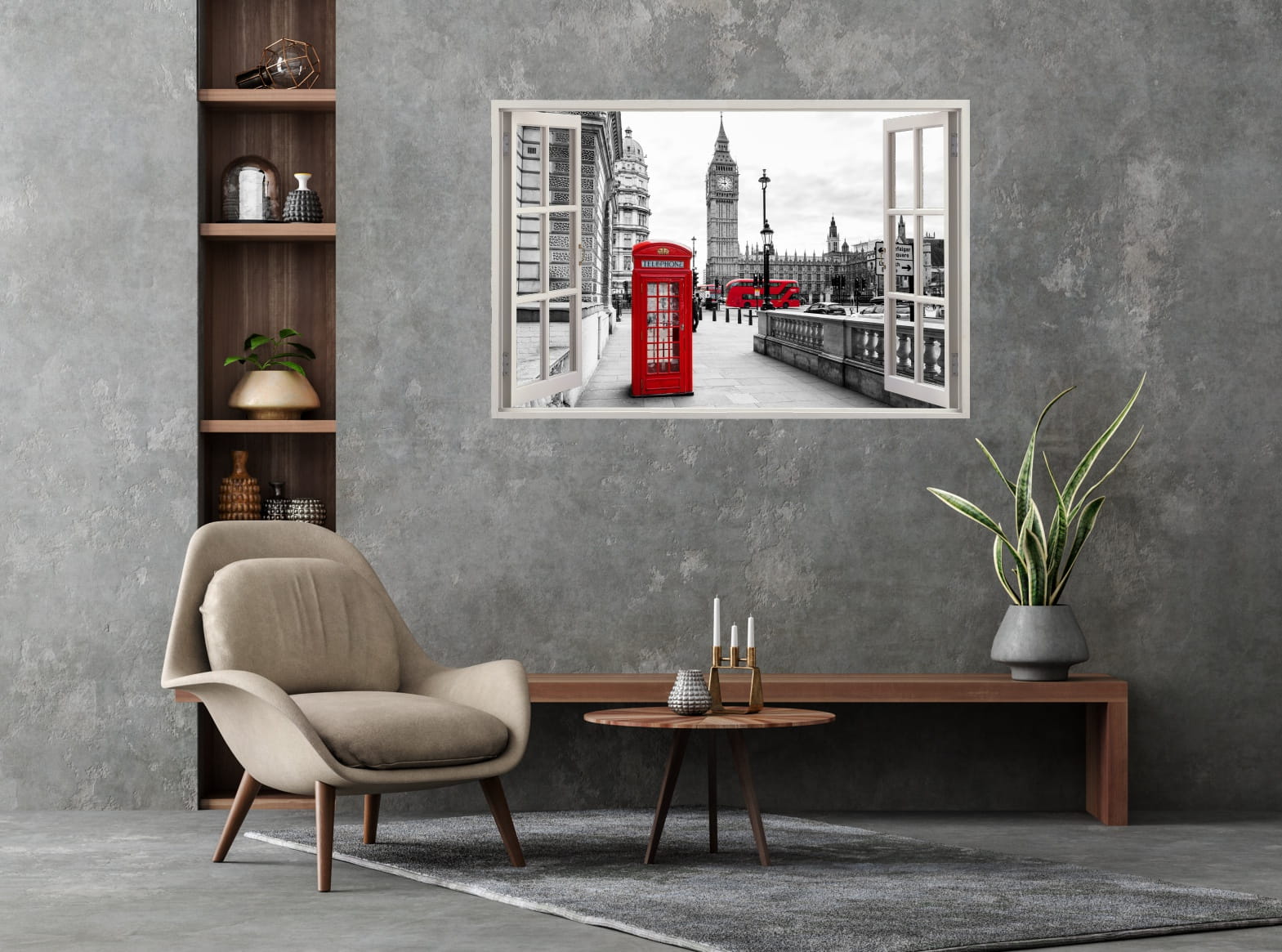 Naklejka ścienna do salonu WIDOK PRZEZ BIAŁE OKNO Londyn BIG BEN ulica
