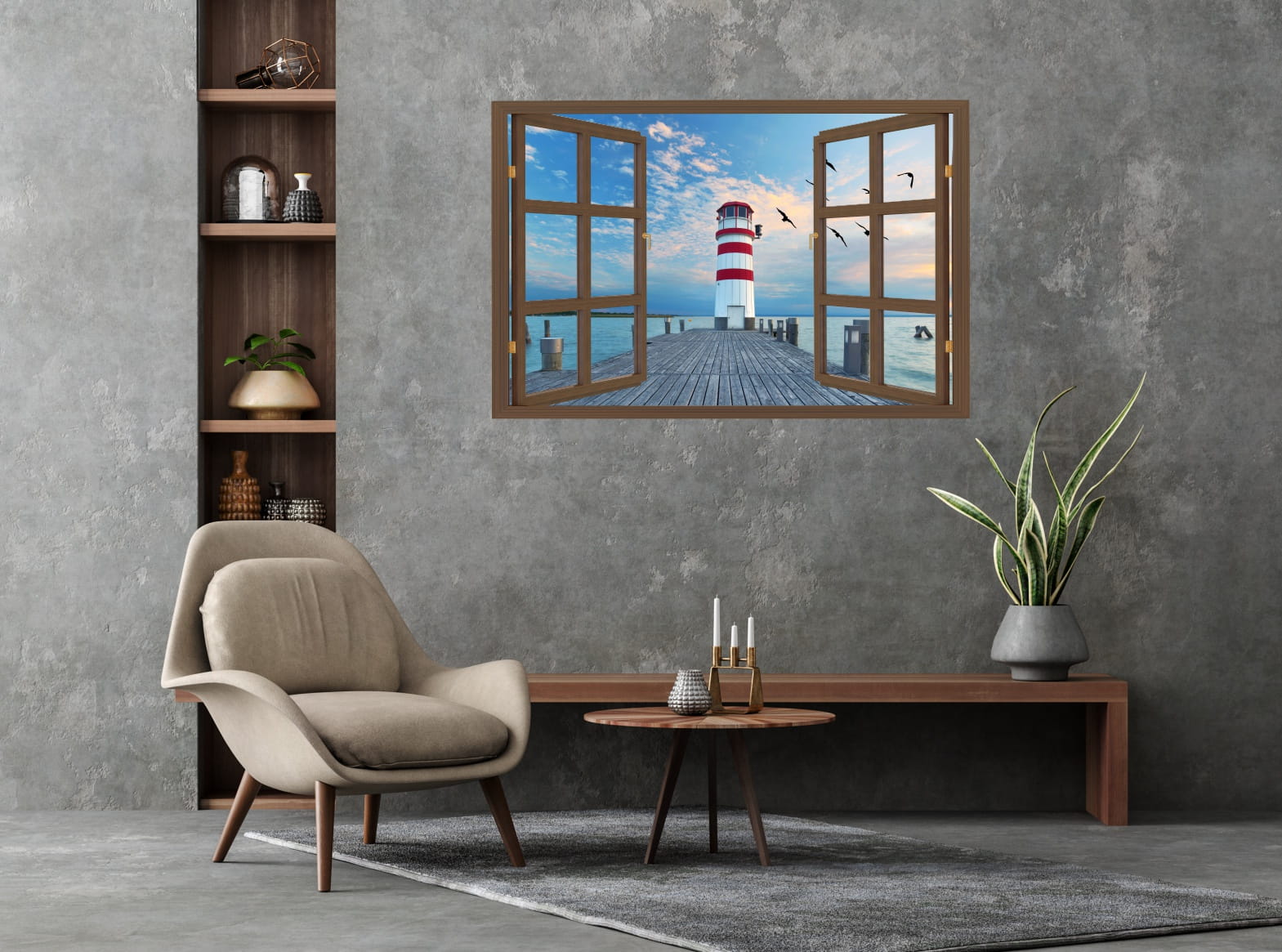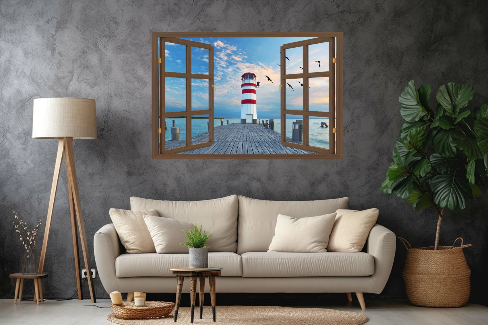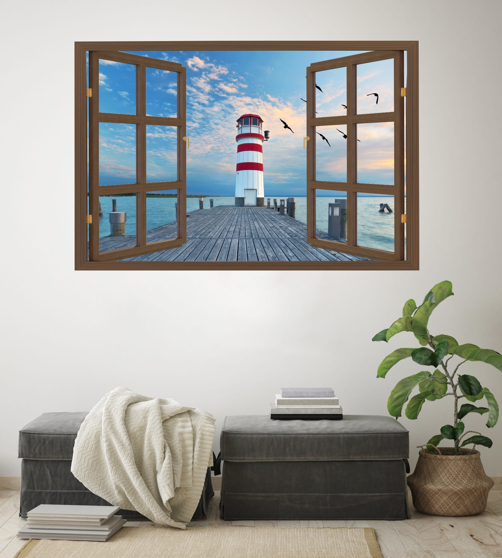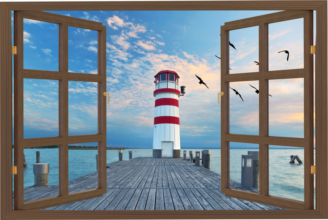 Naklejka ścienna do salonu WIDOK PRZEZ BRĄZOWE OKNO latarnia morska mewy
