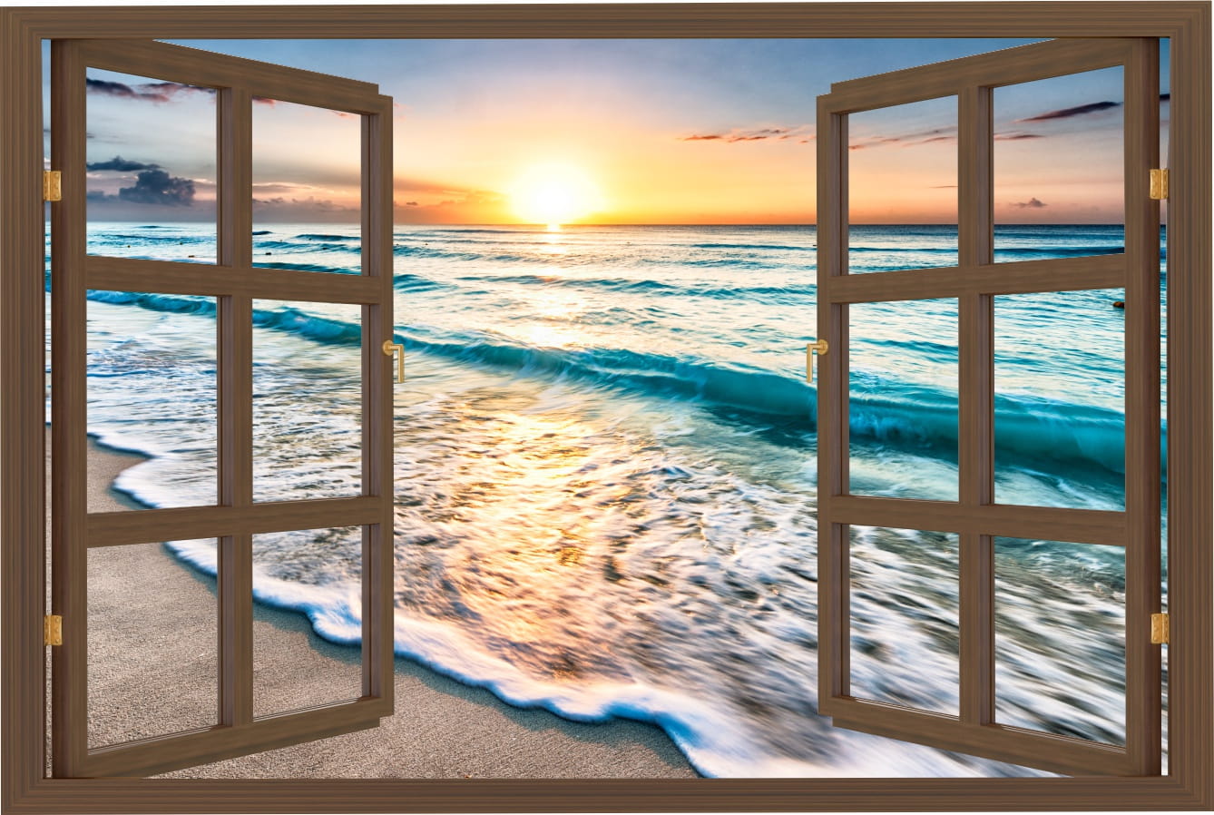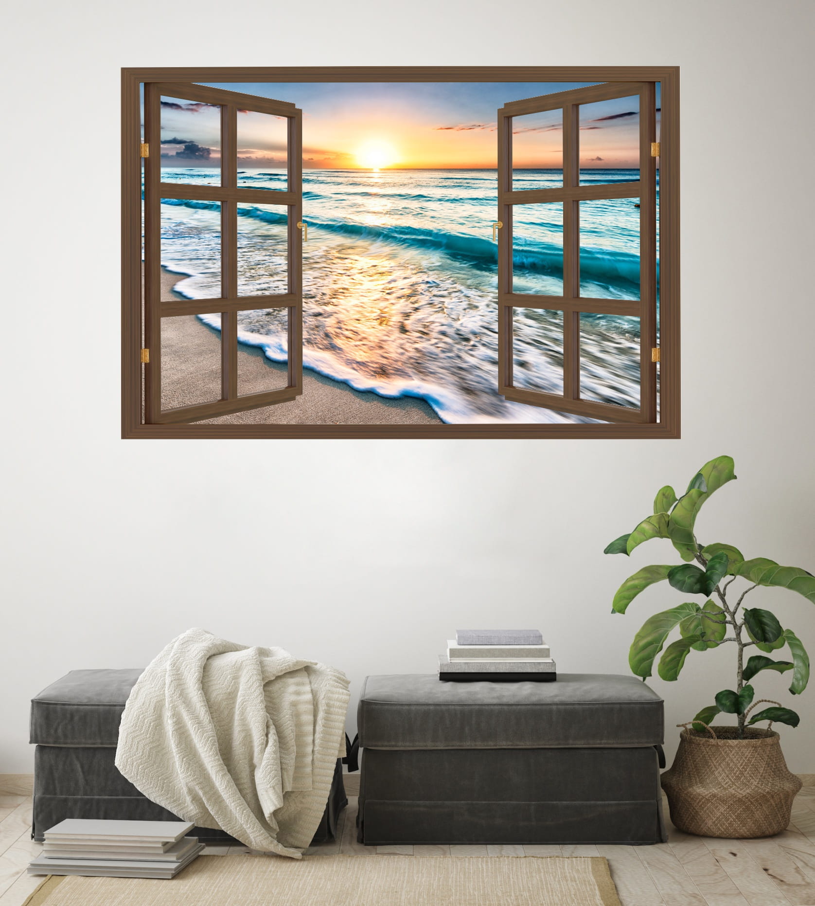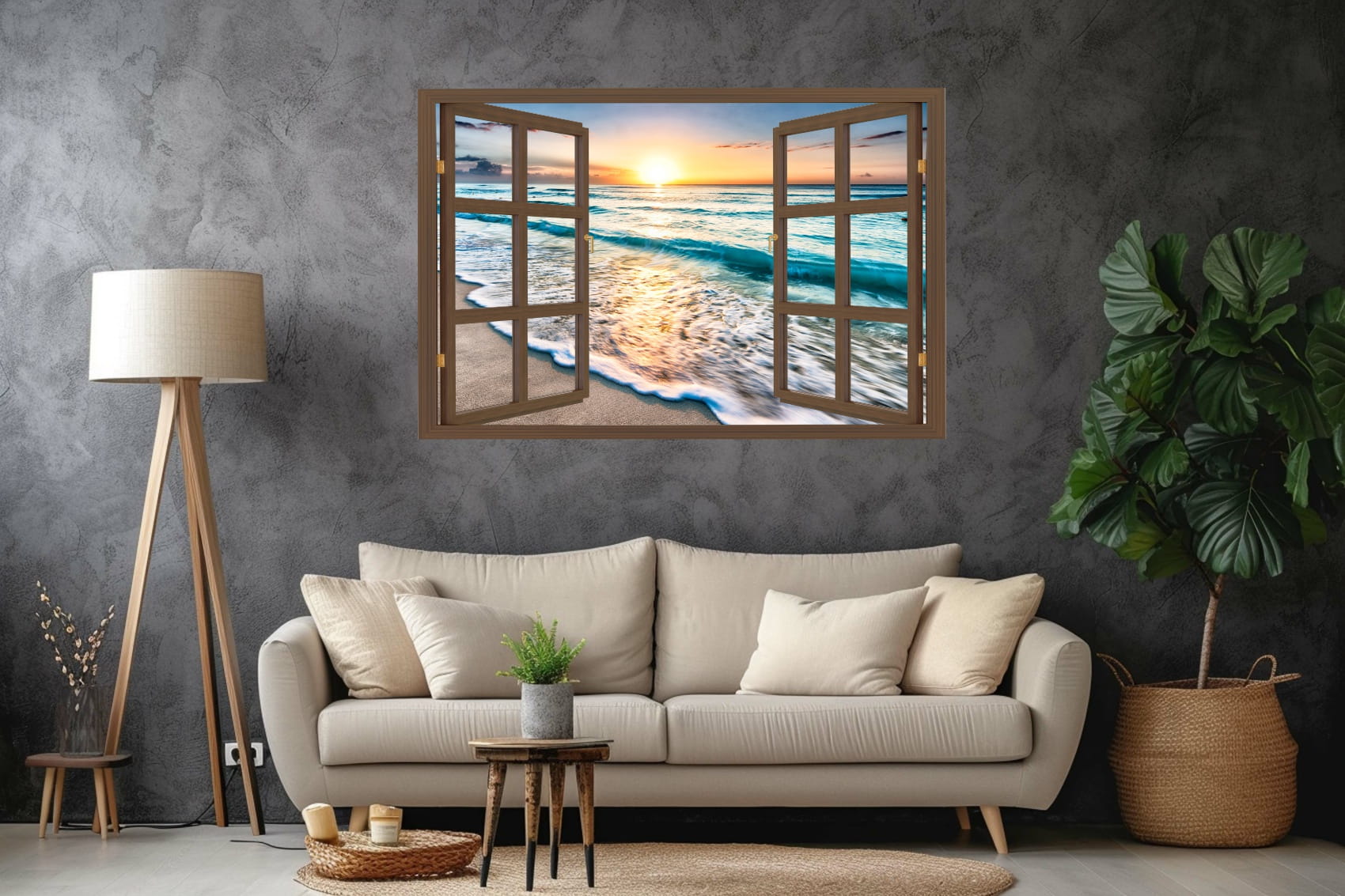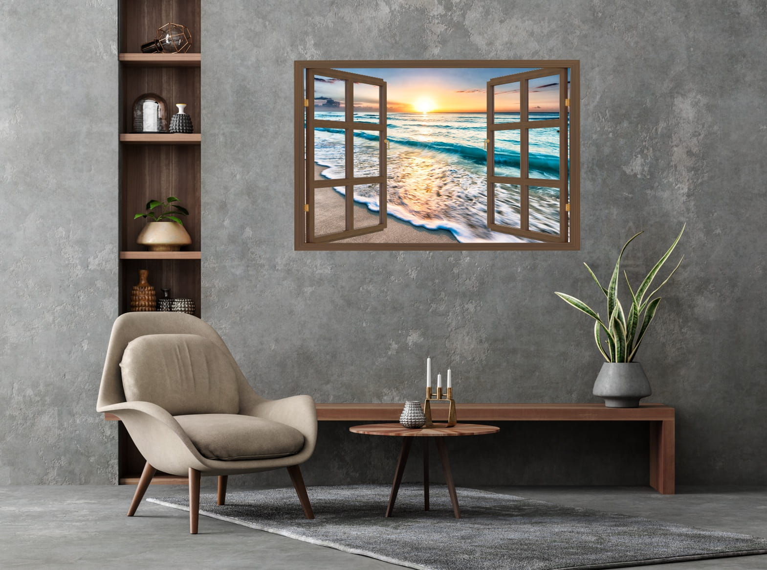 Naklejka ścienna do salonu WIDOK PRZEZ BRĄZOWE OKNO morze zachód słońca