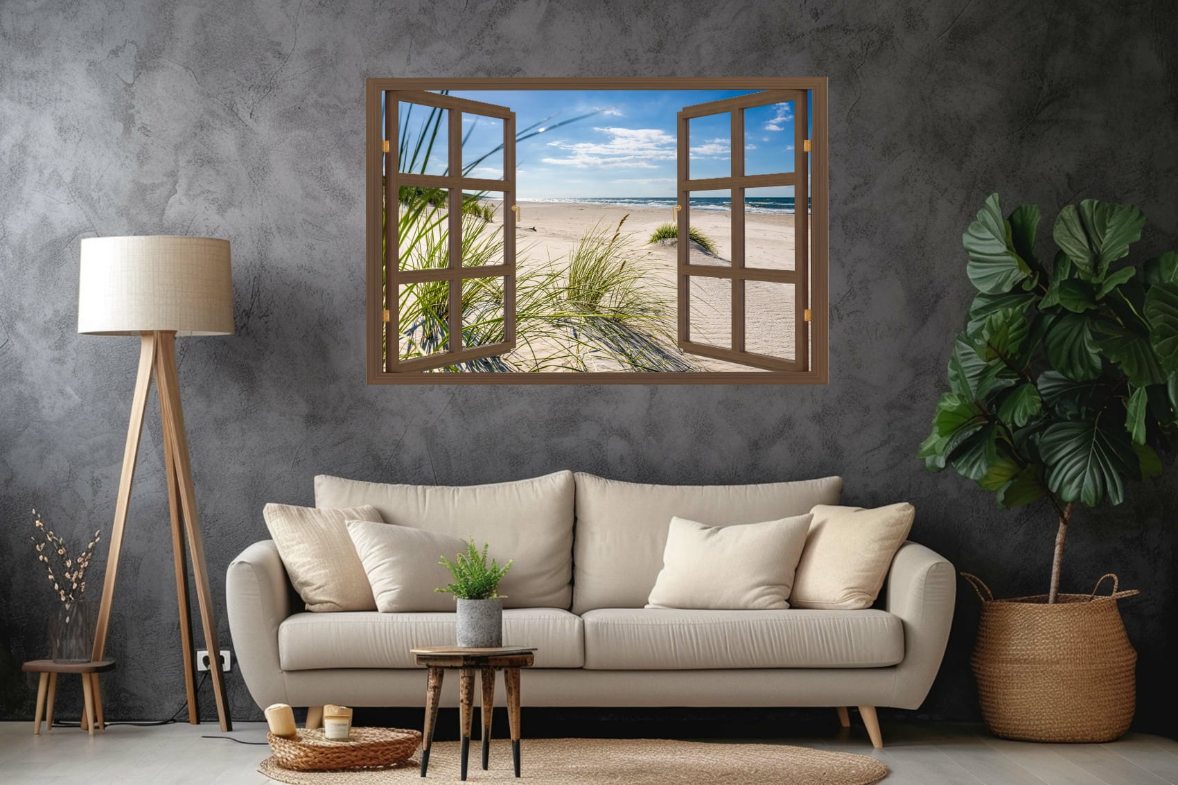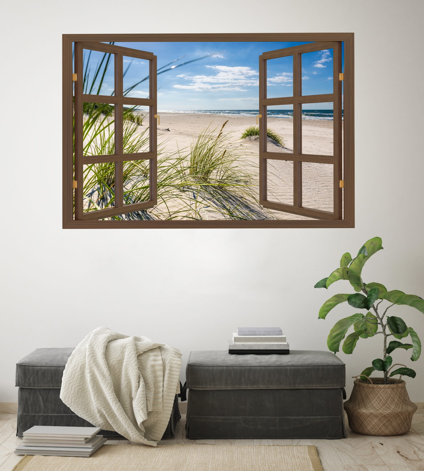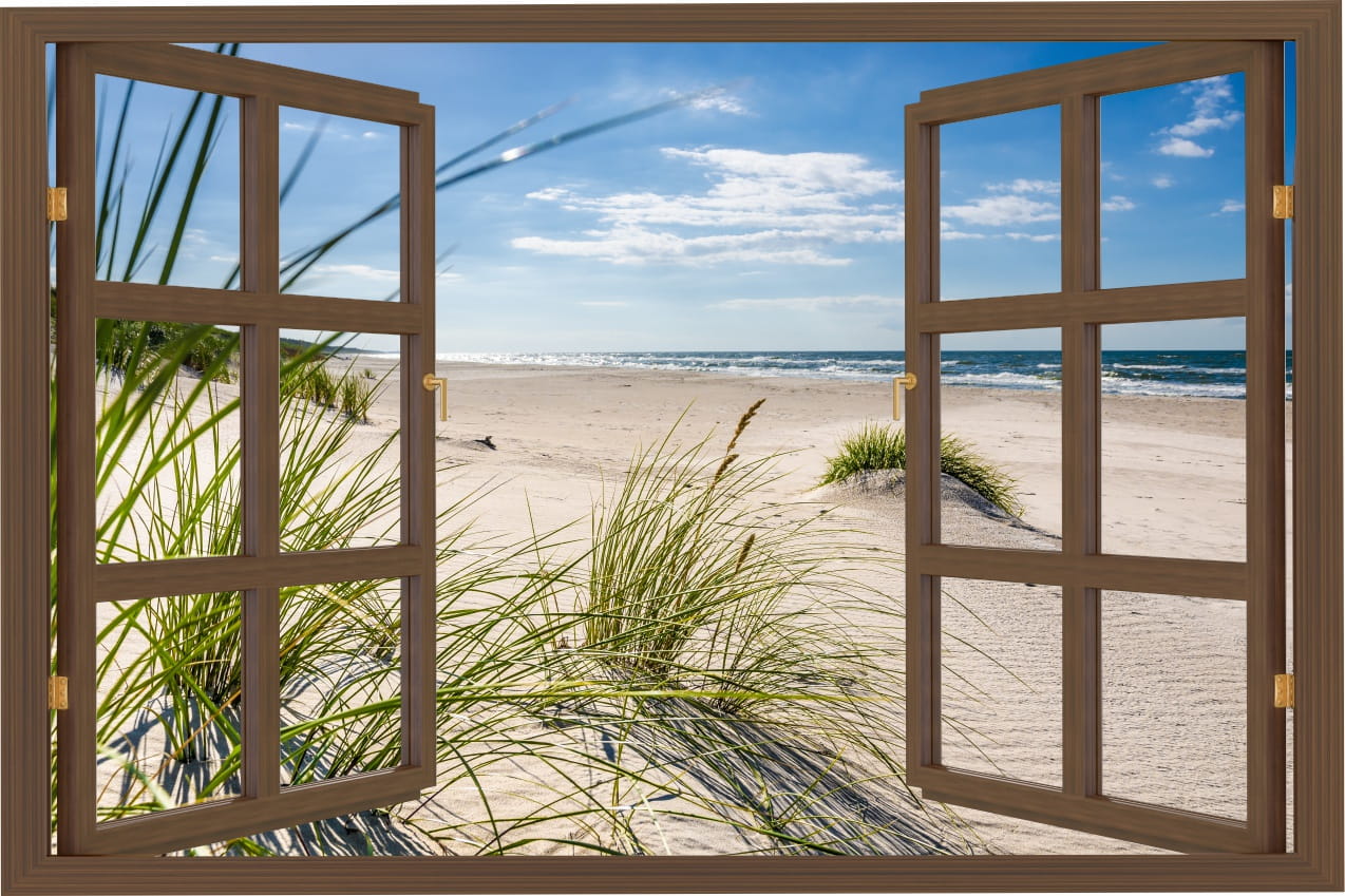 Naklejka ścienna do salonu WIDOK PRZEZ BRĄZOWE OKNO plaża piasek wydmy