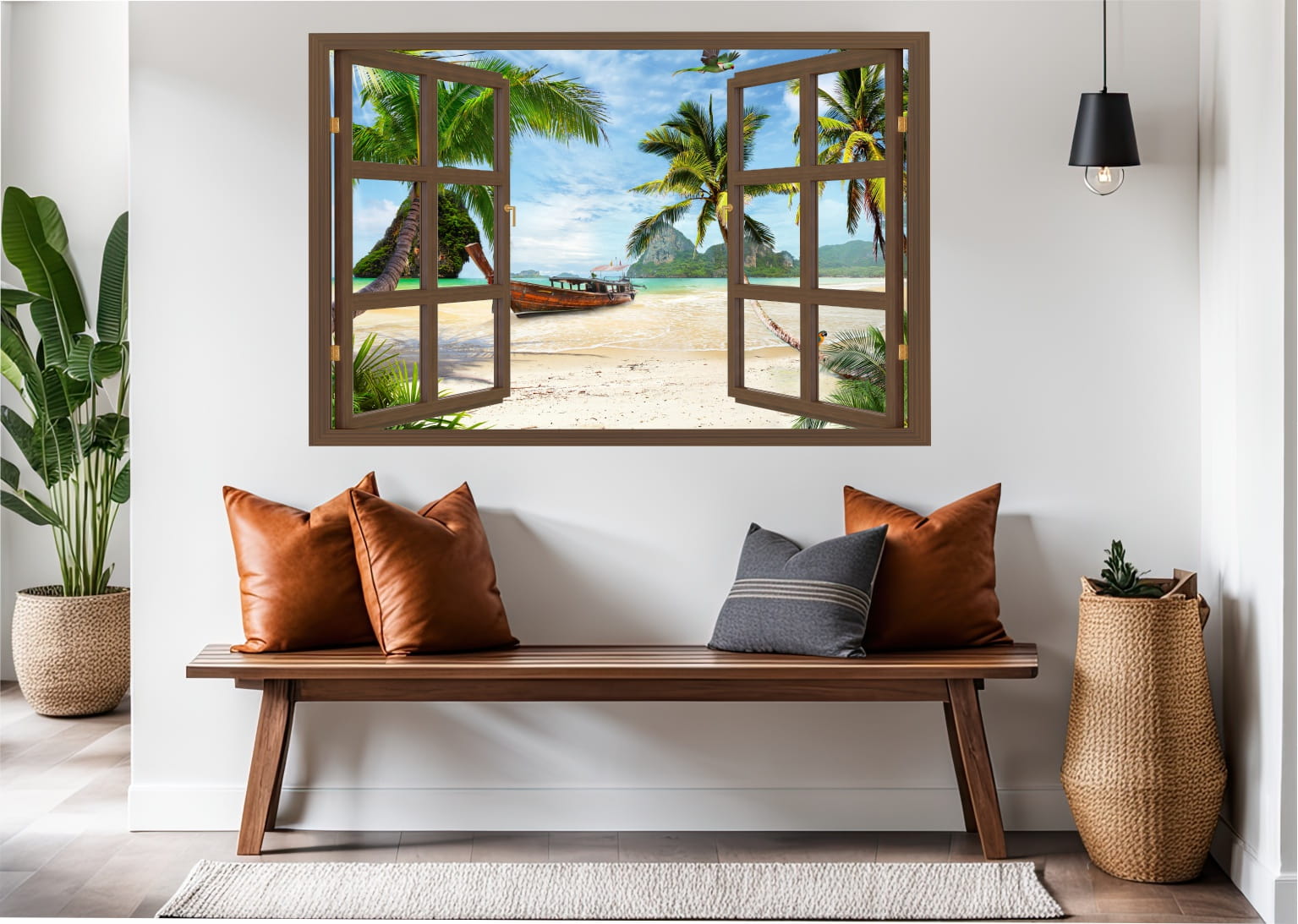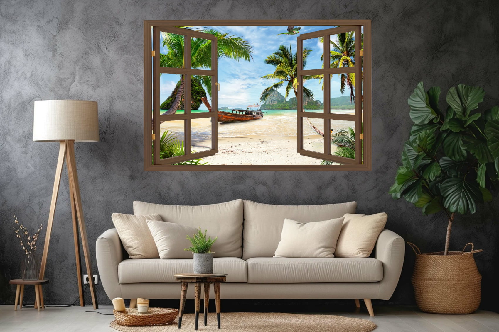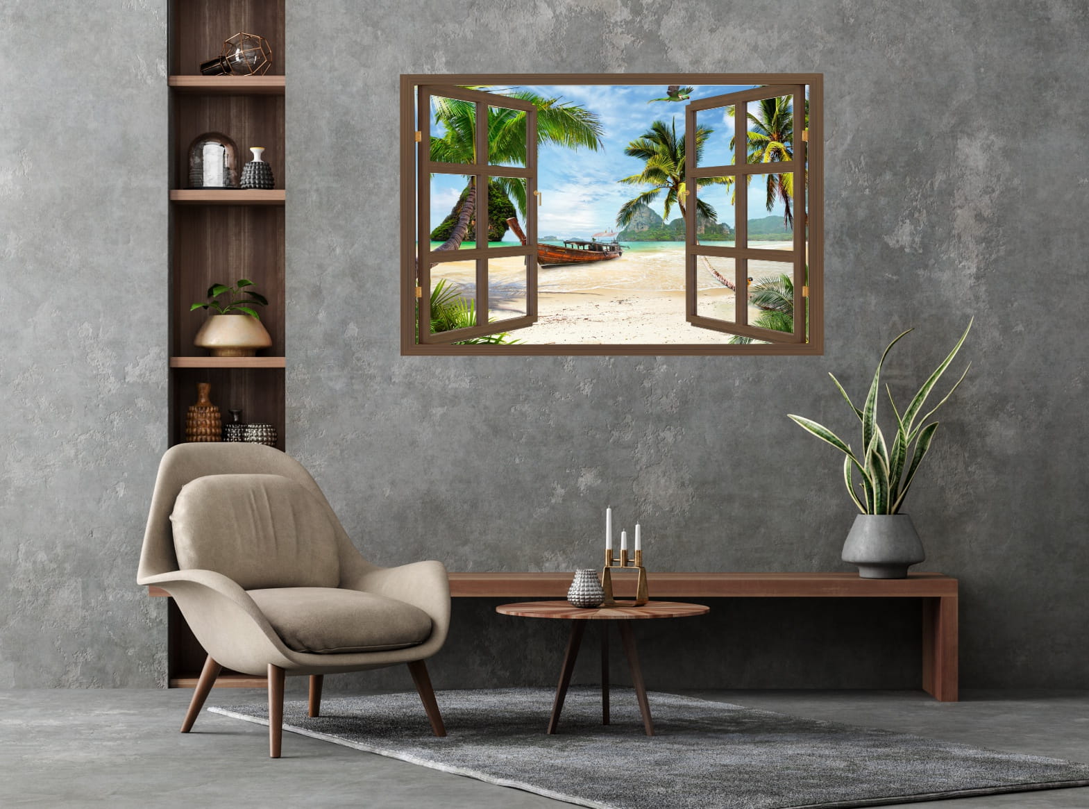 Naklejka ścienna do salonu WIDOK PRZEZ BRĄZOWE OKNO plaża tropiki palmy
