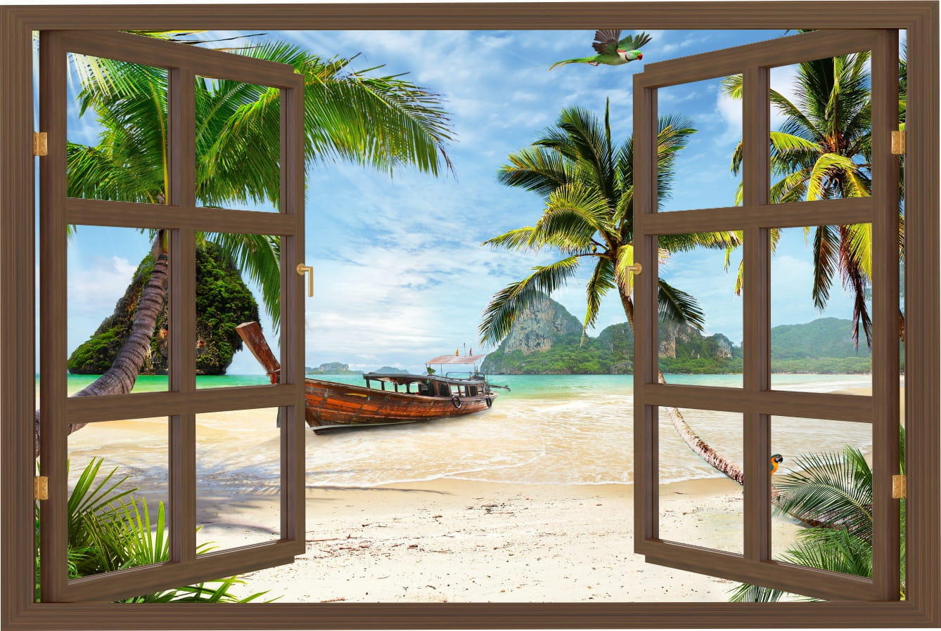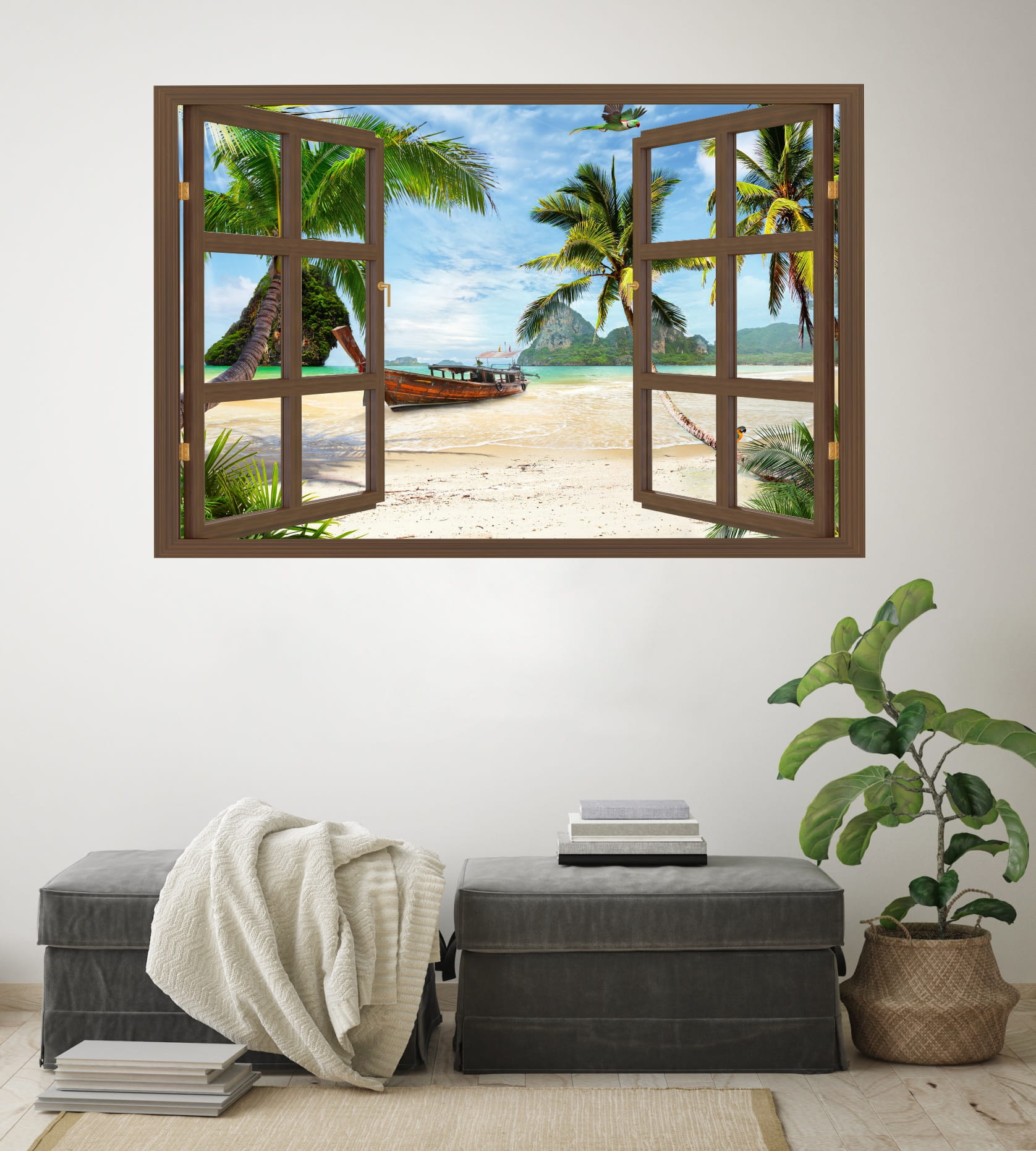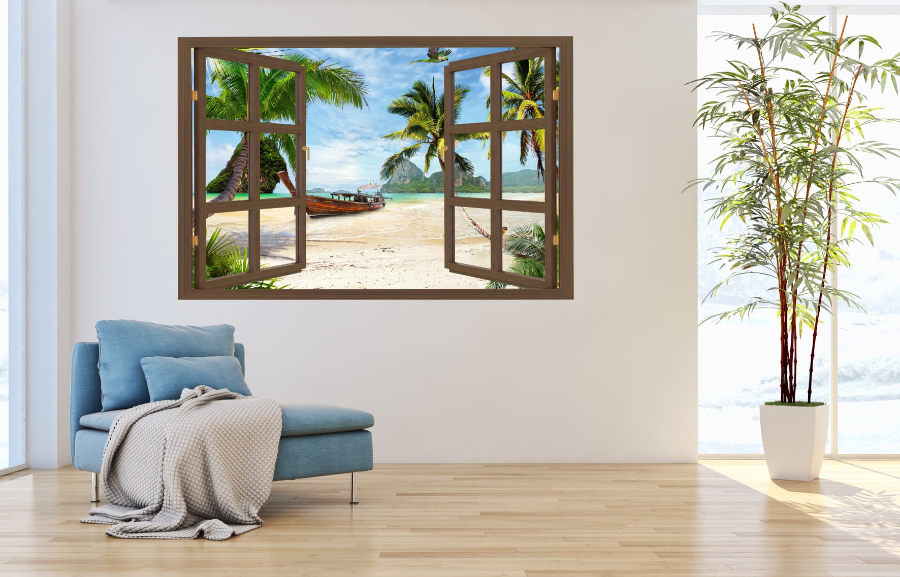 Naklejka ścienna do salonu WIDOK PRZEZ BRĄZOWE OKNO plaża tropiki palmy