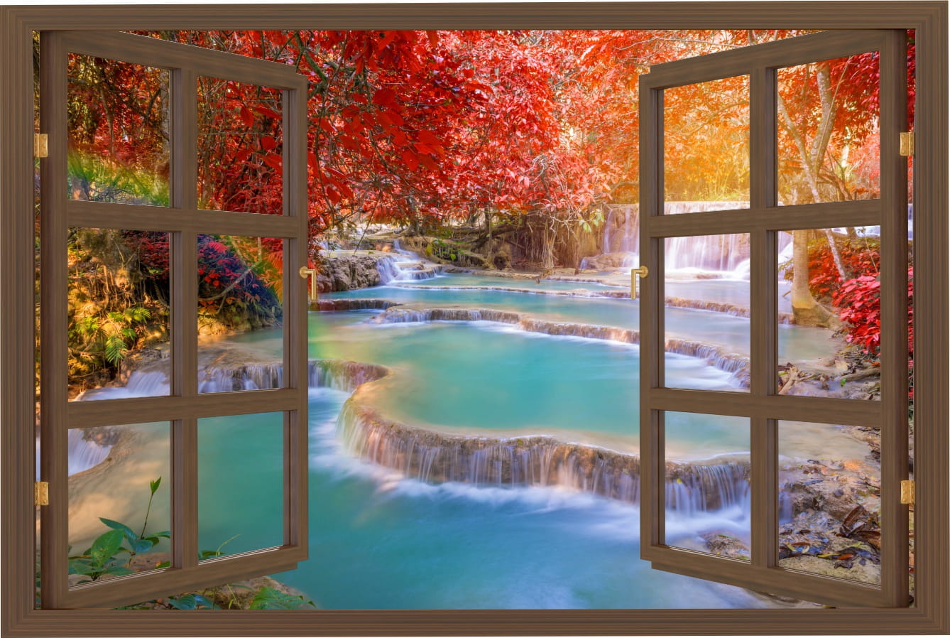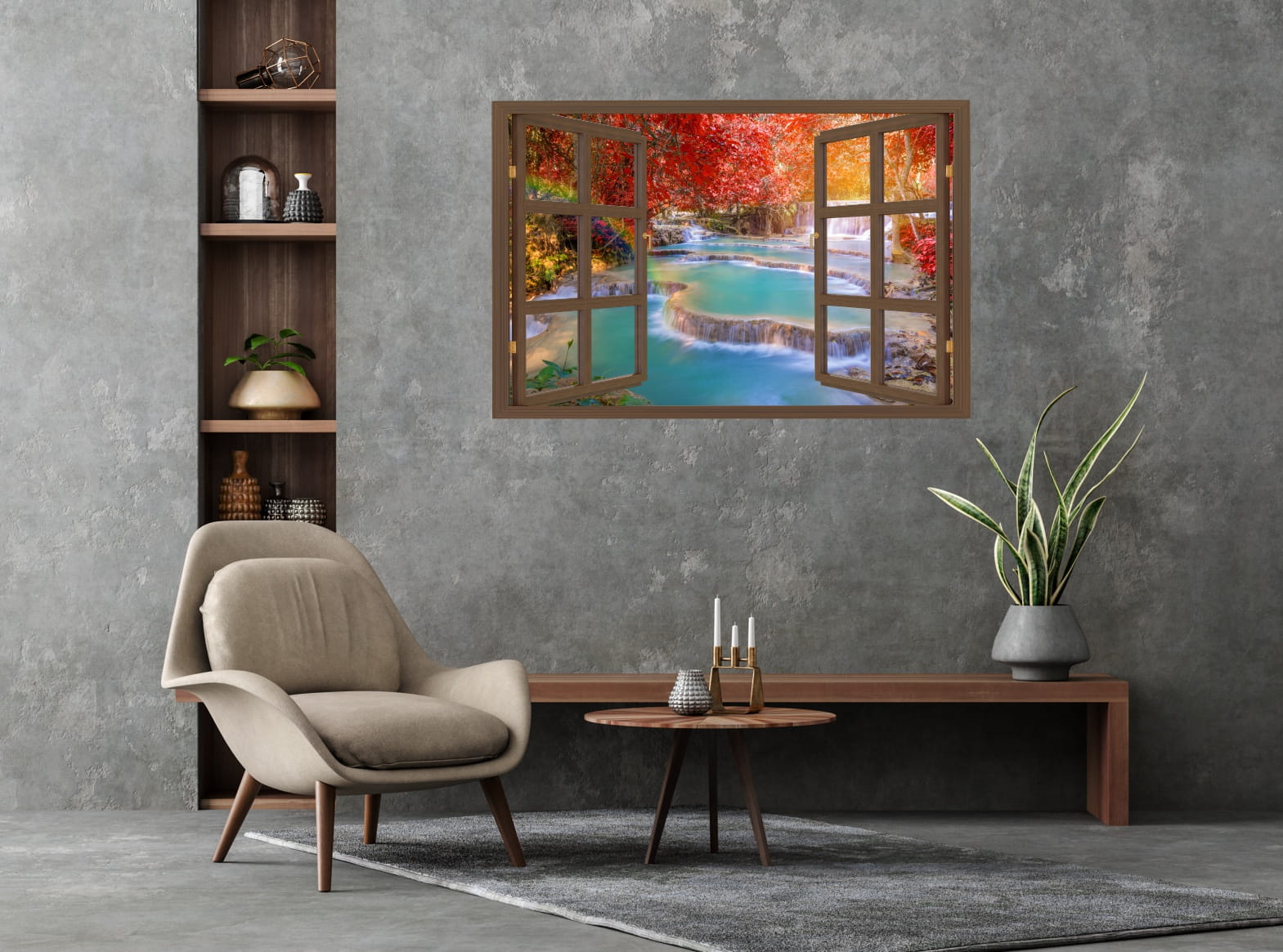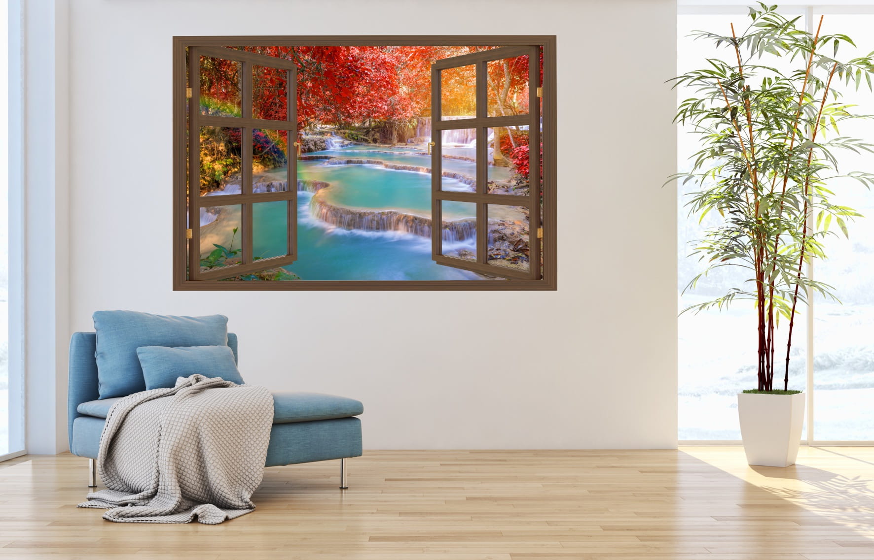 Naklejki na ścianę okno z widokiem kolorowy wodospad las natura