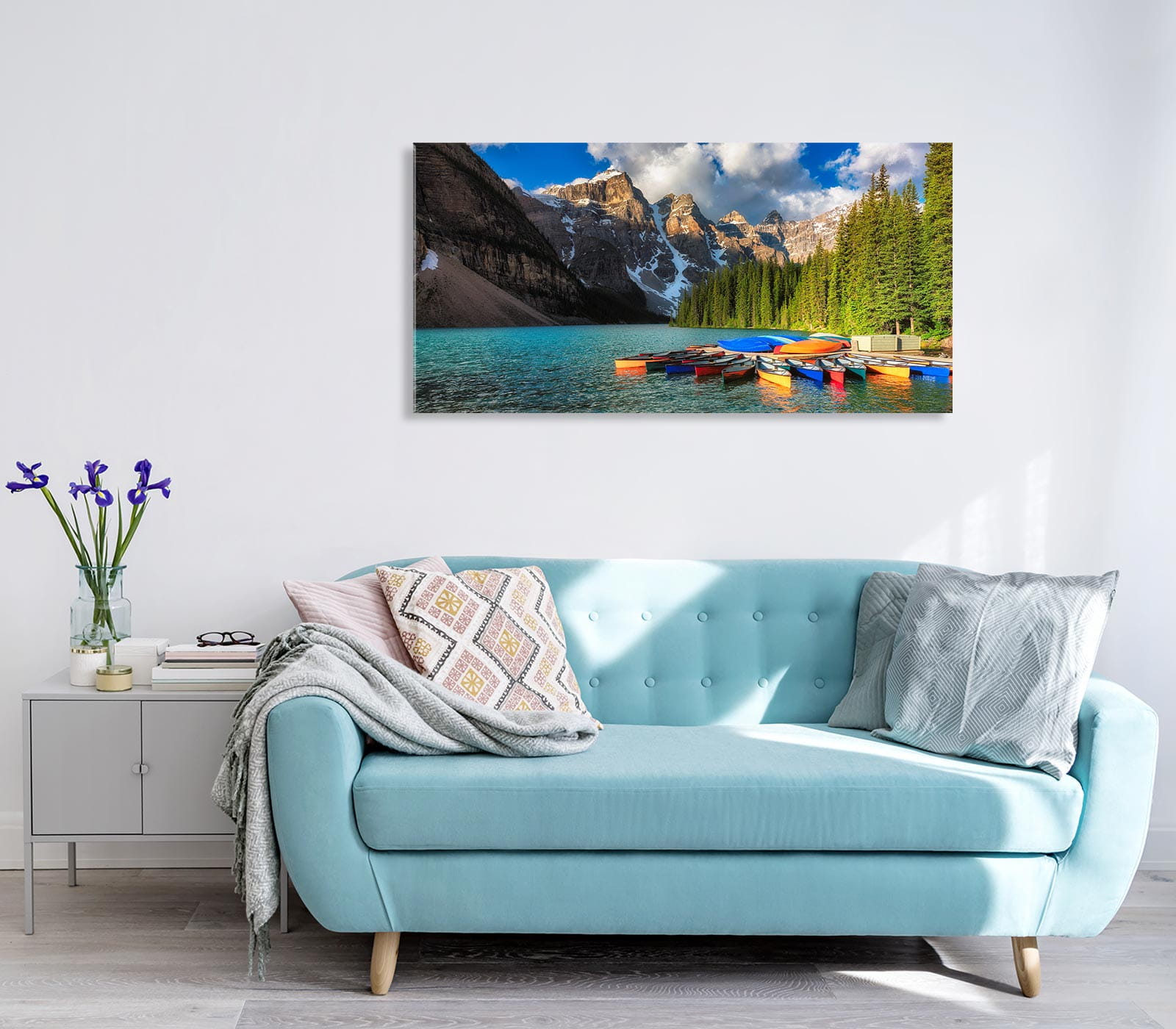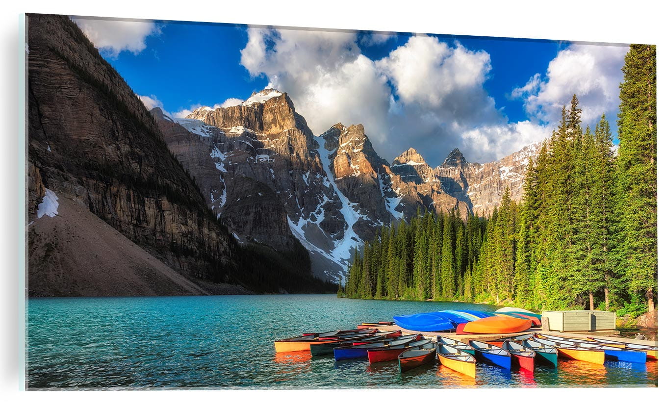 OBRAZ NA SZKLE SZKLANY DO SALONU Jezioro Moraine łódki góry