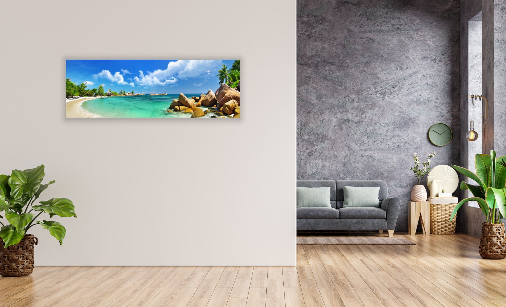 OBRAZ PANORAMICZNY dekoracyjny PANORAMA Seszele plaża palmy ocean