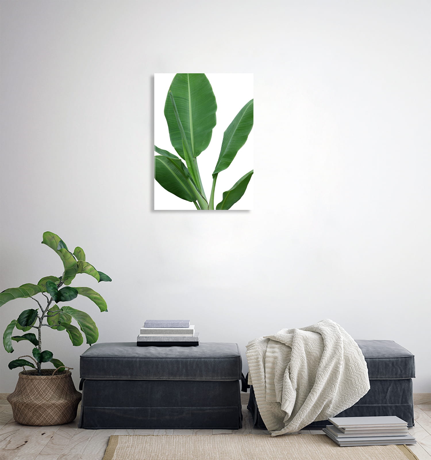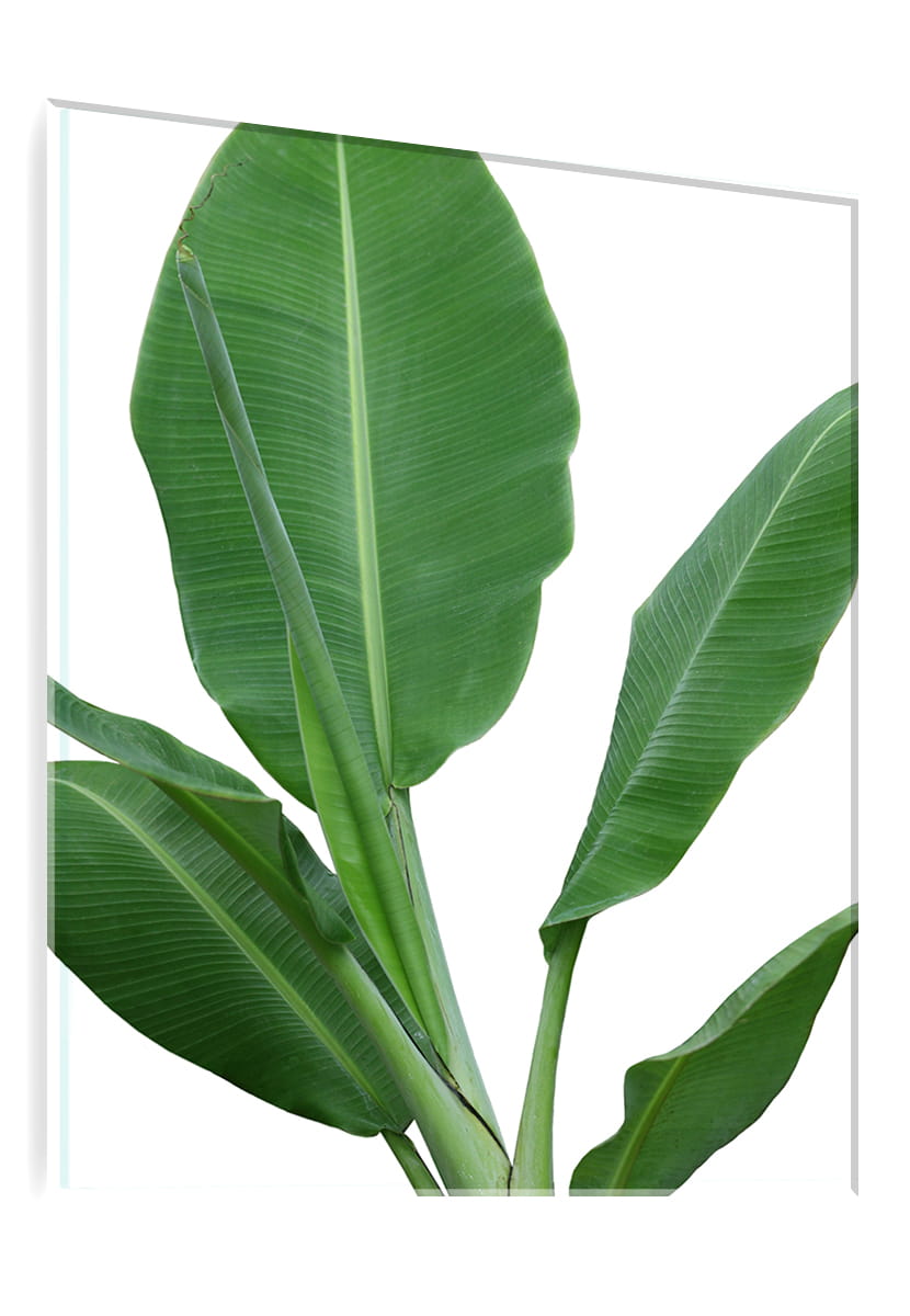 OBRAZ SZKLANY DO SALONU LIŚCIE BANANOWCA NA BIAŁYM TLE
