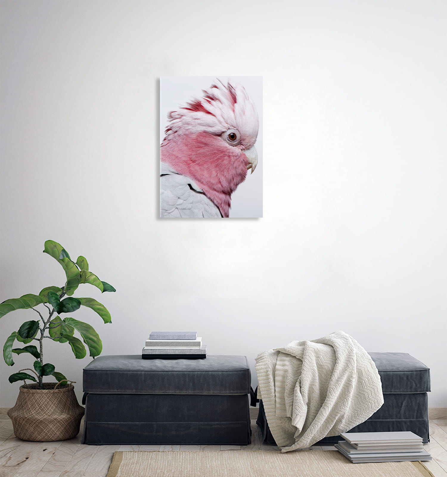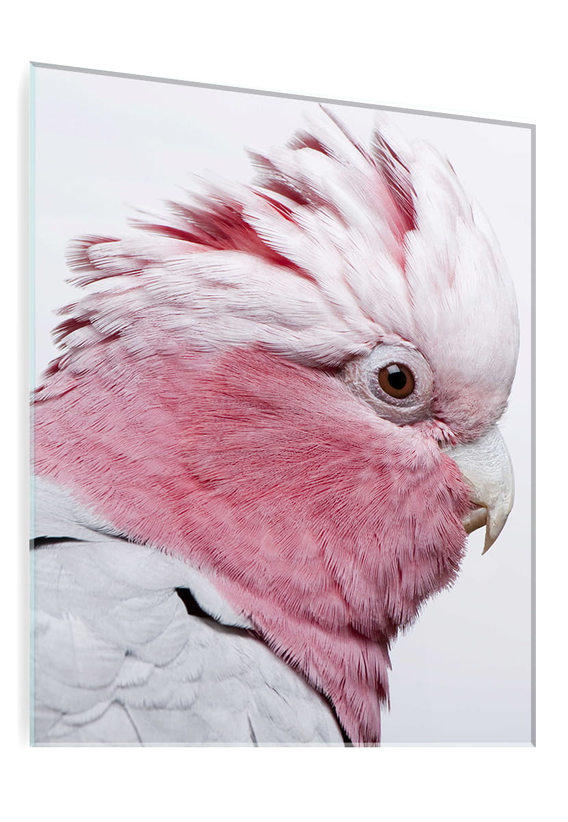 OBRAZ SZKLANY DO SALONU RÓZOWA PAPUGA NA BIAŁYM TLE