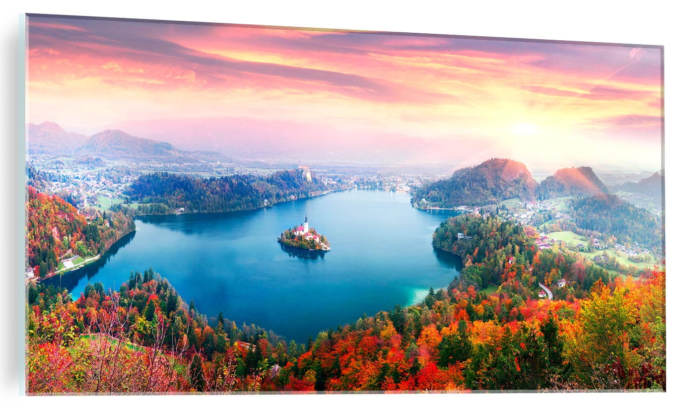 OBRAZ SZKLANY NA SZKLE WIDOK NA JEZIORO DRZEWA JESIEŃ