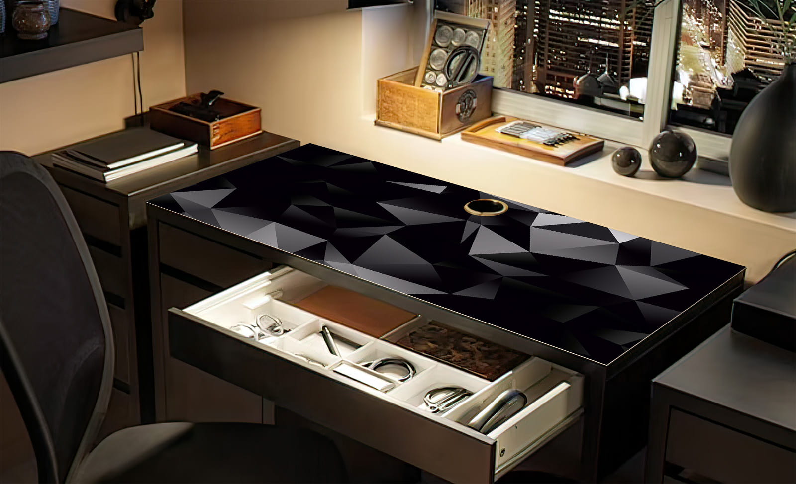 Ochronna mata na biurko z IKEA MICKE dla chłopca czarna abstrakcja