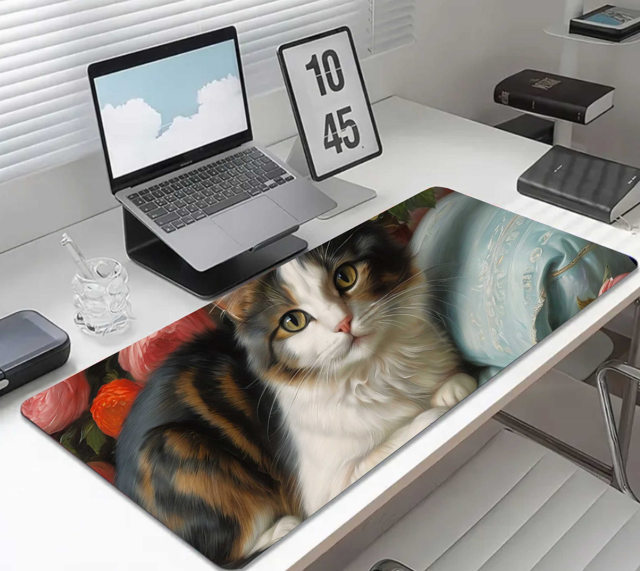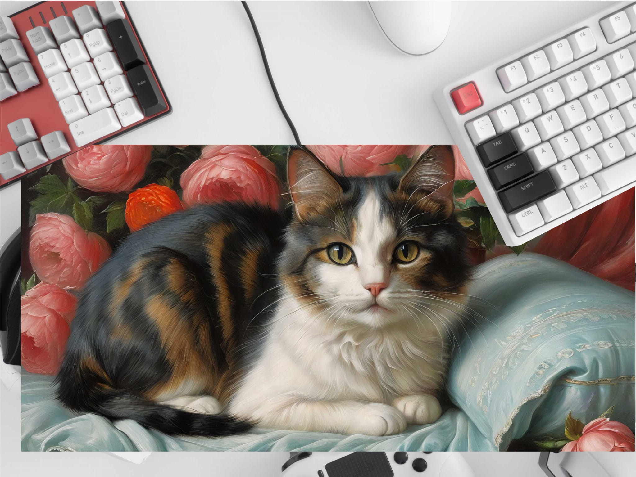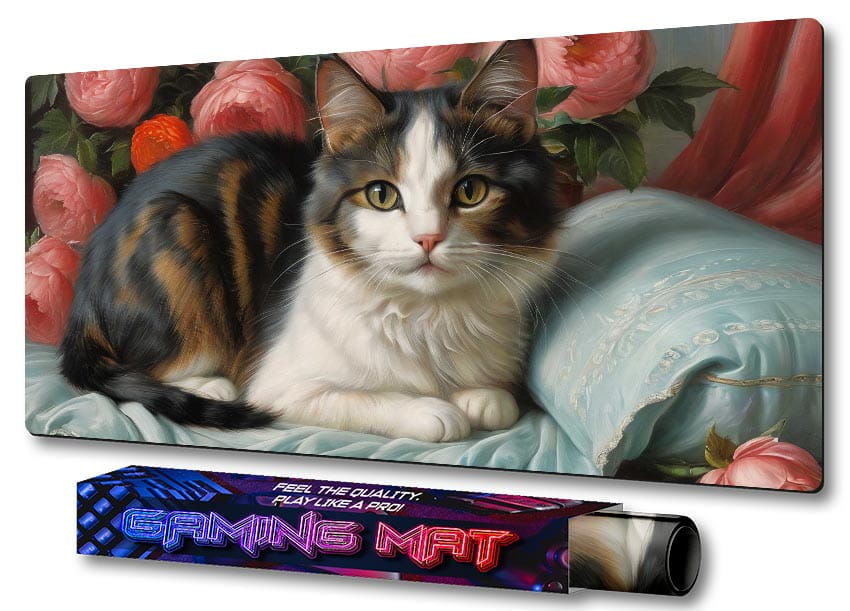 PODKŁADKA NA BIURKO GAMING Cute Cat On Couch With Flowers