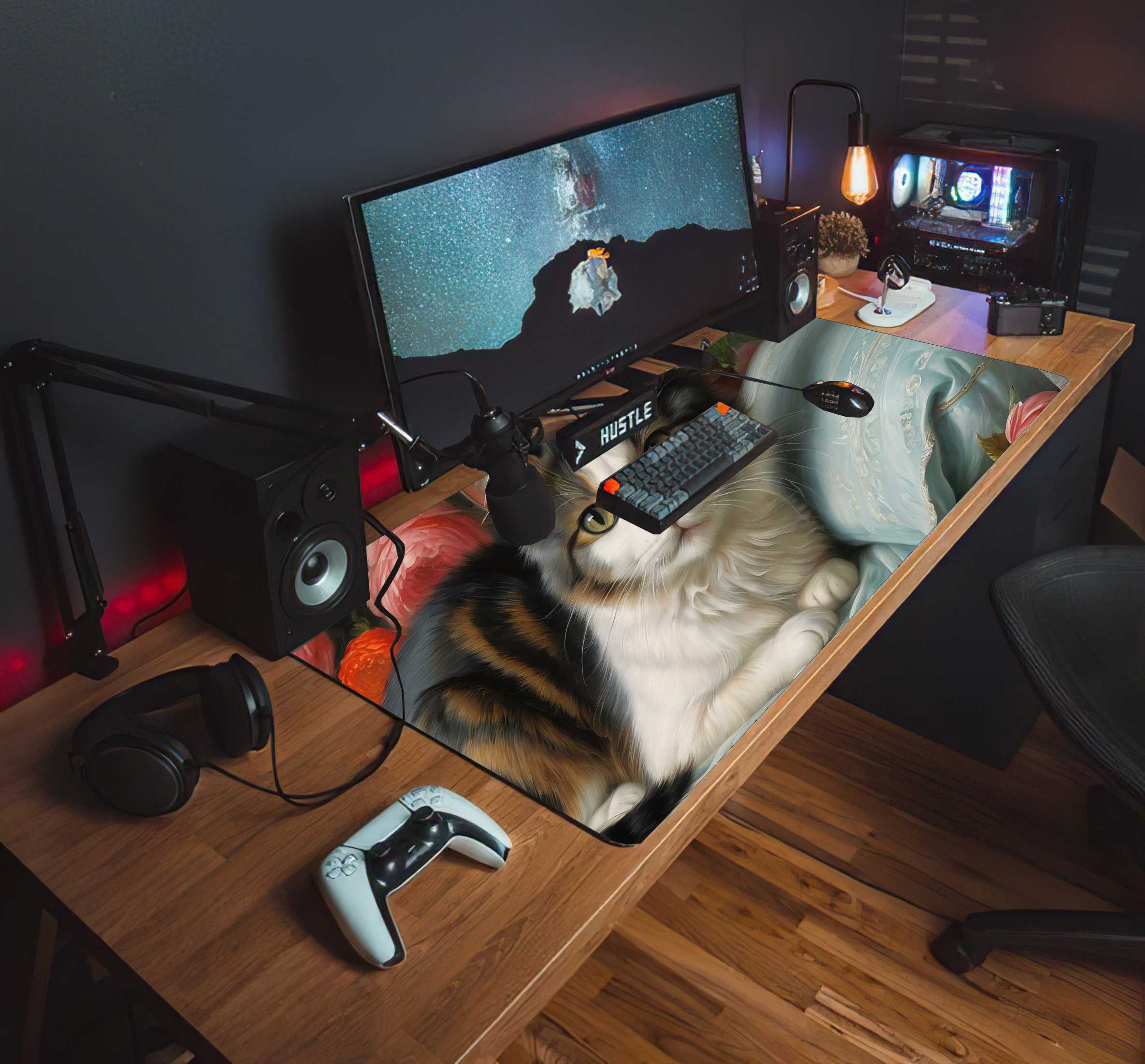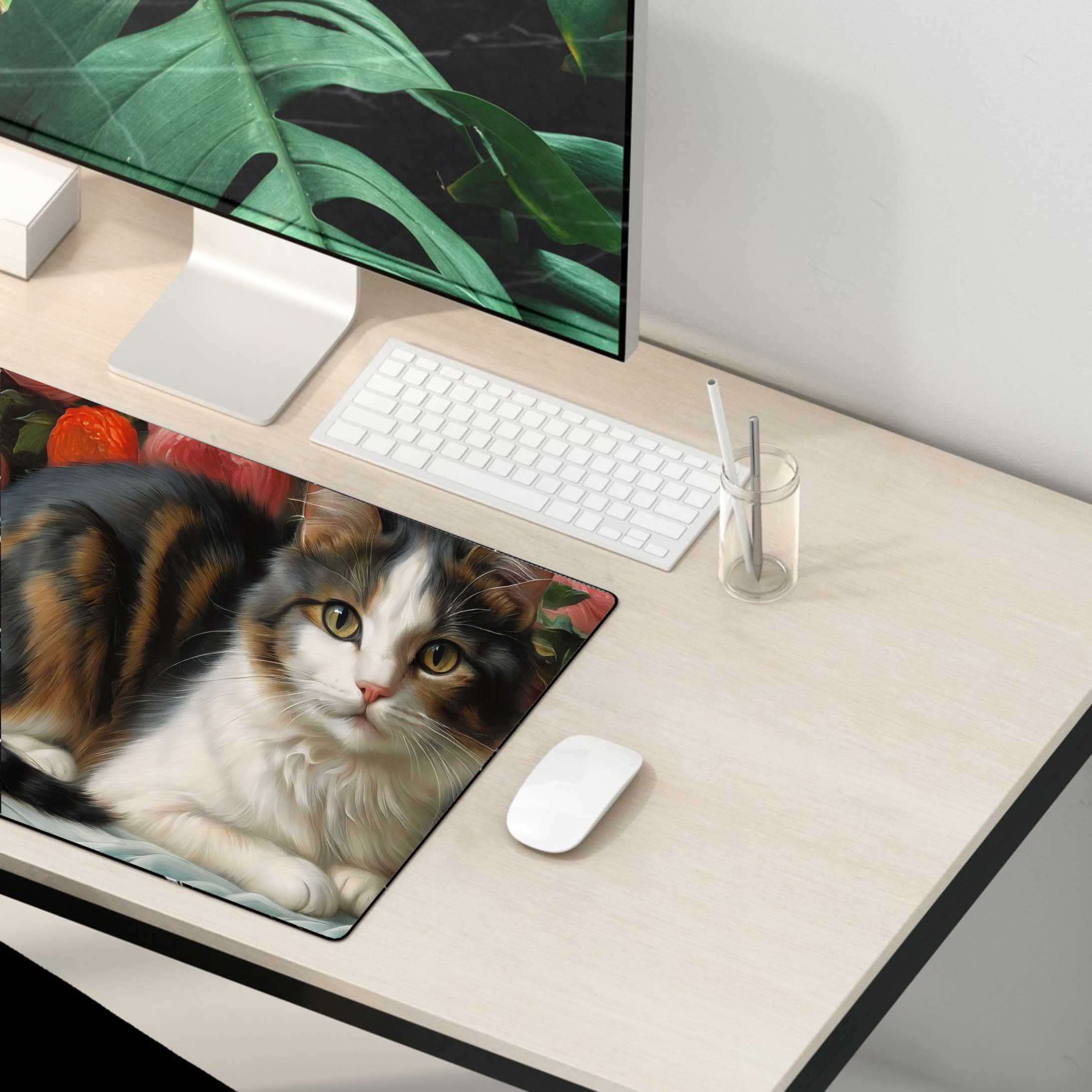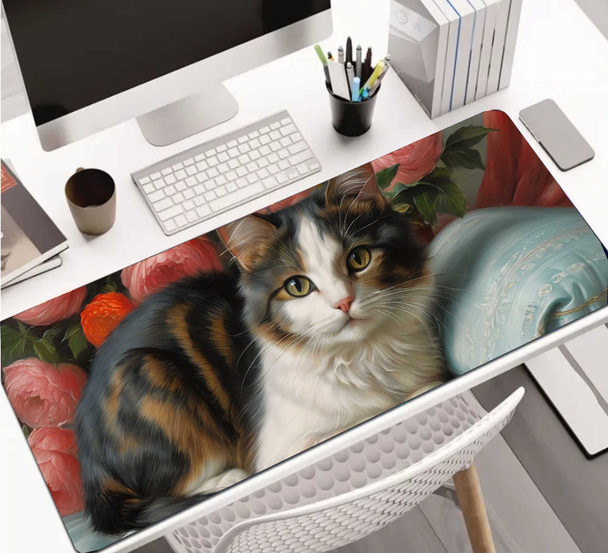 PODKŁADKA NA BIURKO GAMING Cute Cat On Couch With Flowers