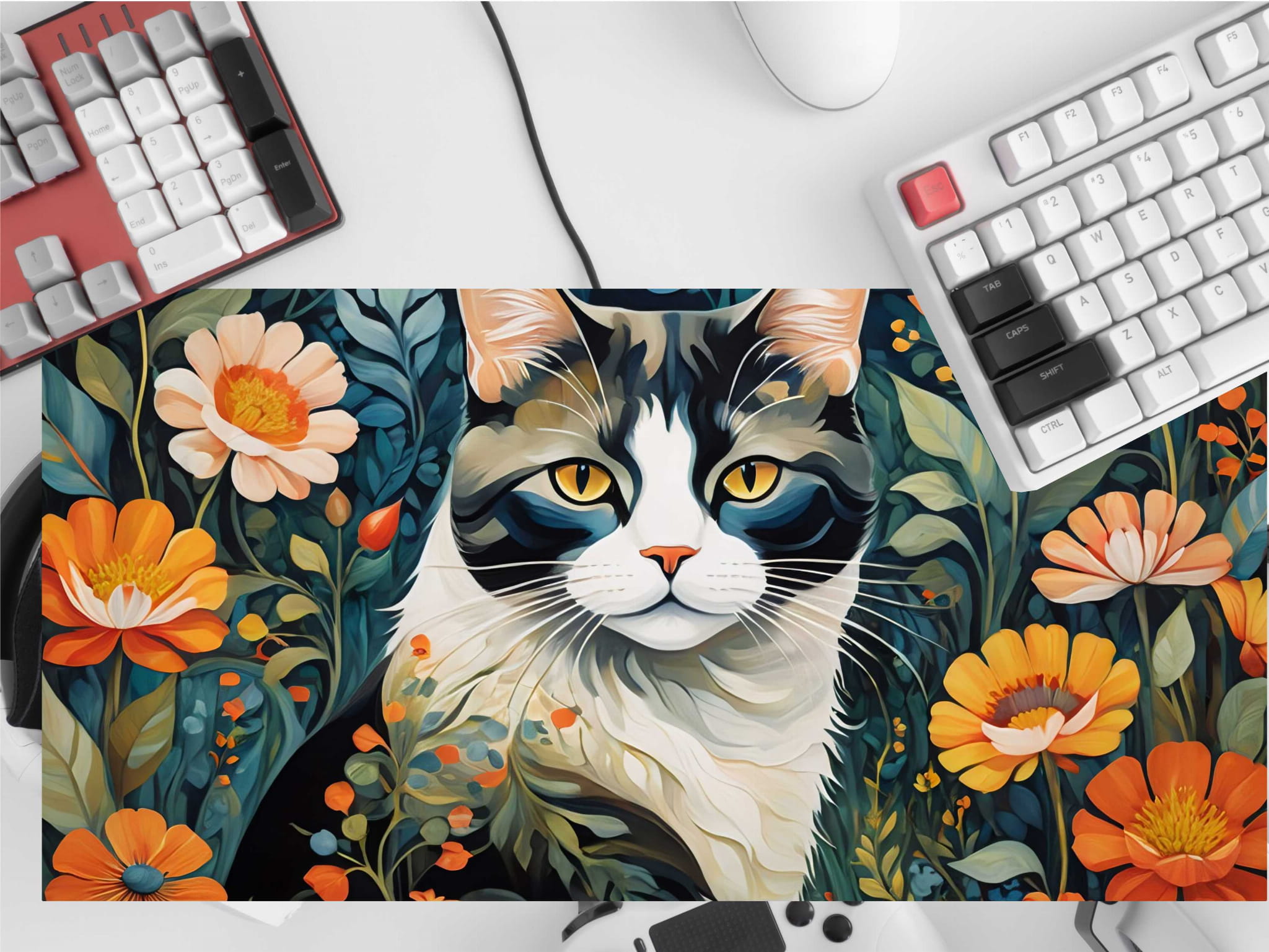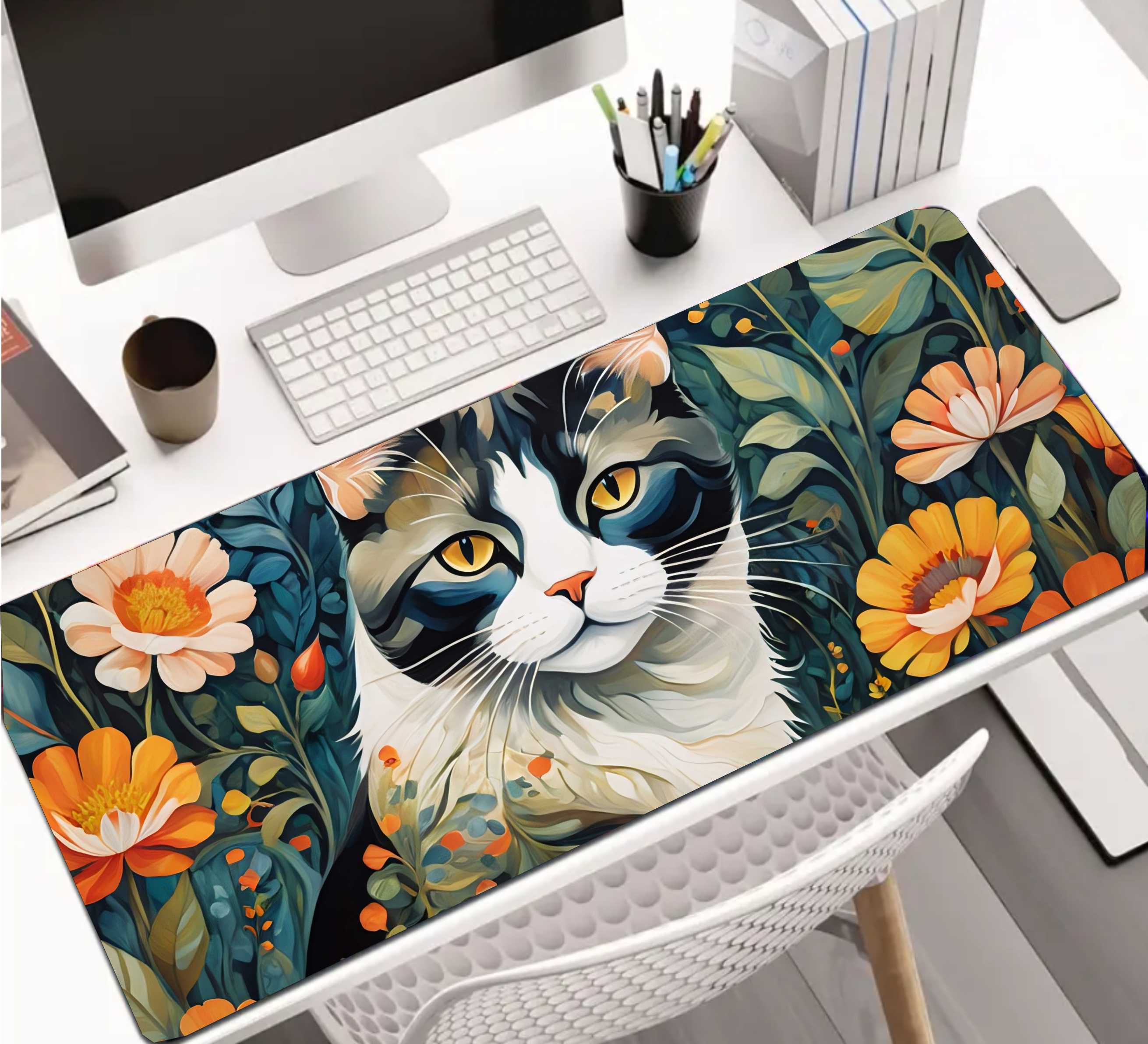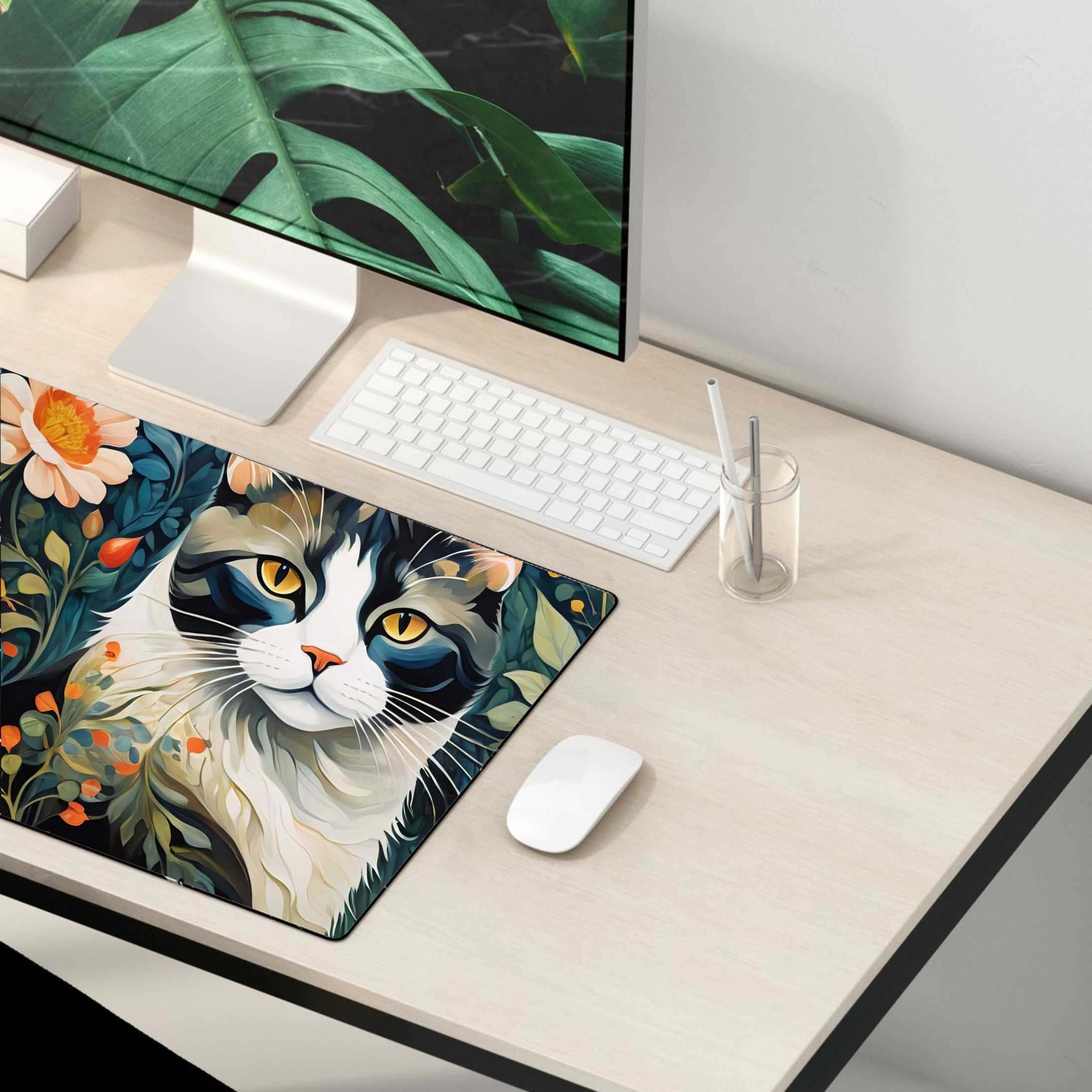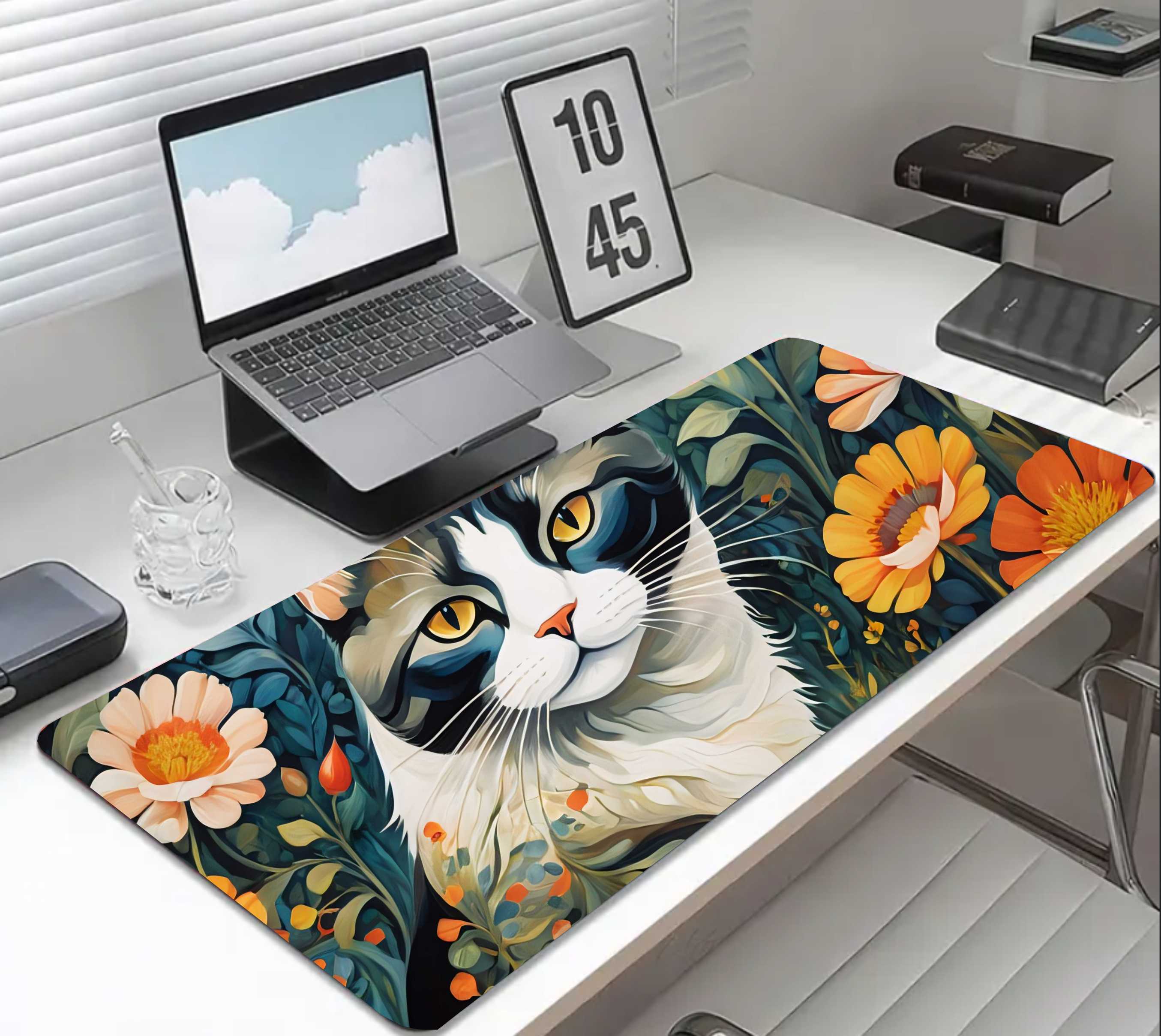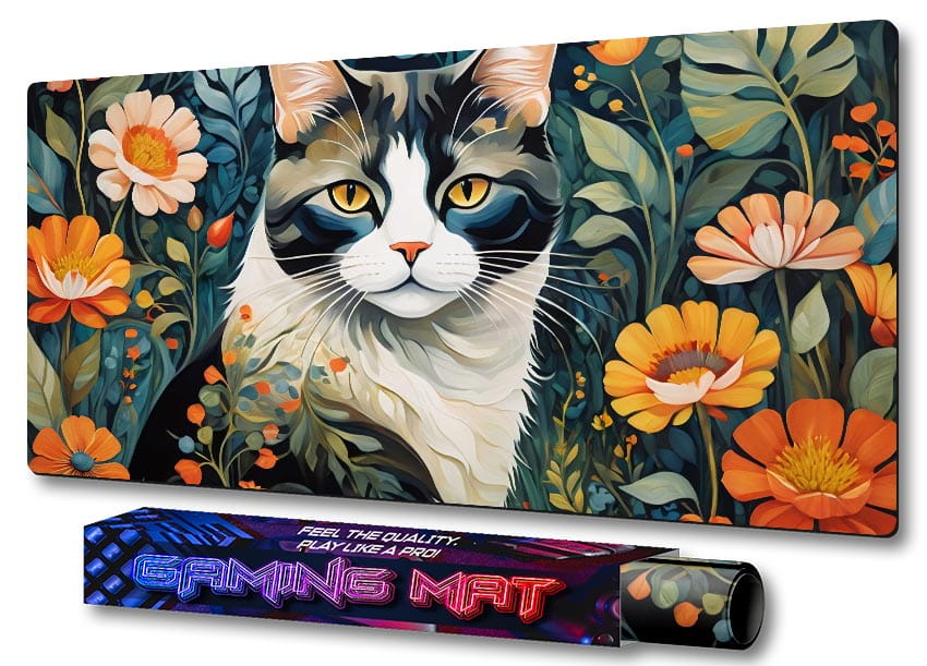 PODKŁADKA NA BIURKO GAMING Kwiatowy Pejzaż Czarno-Biały Kot