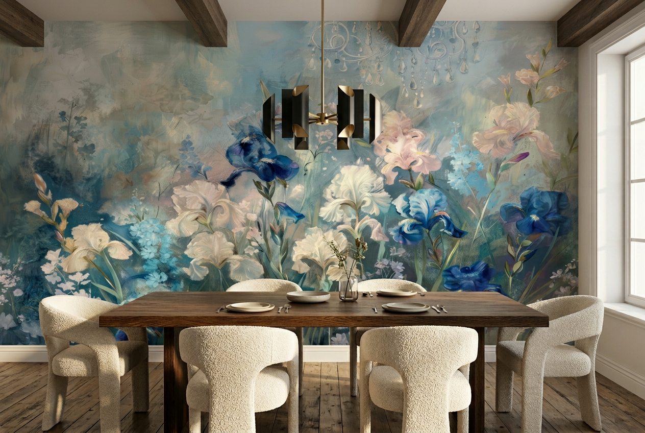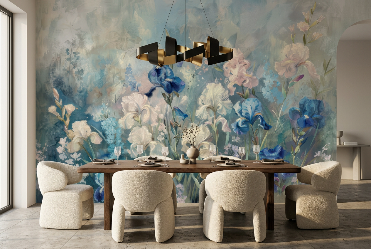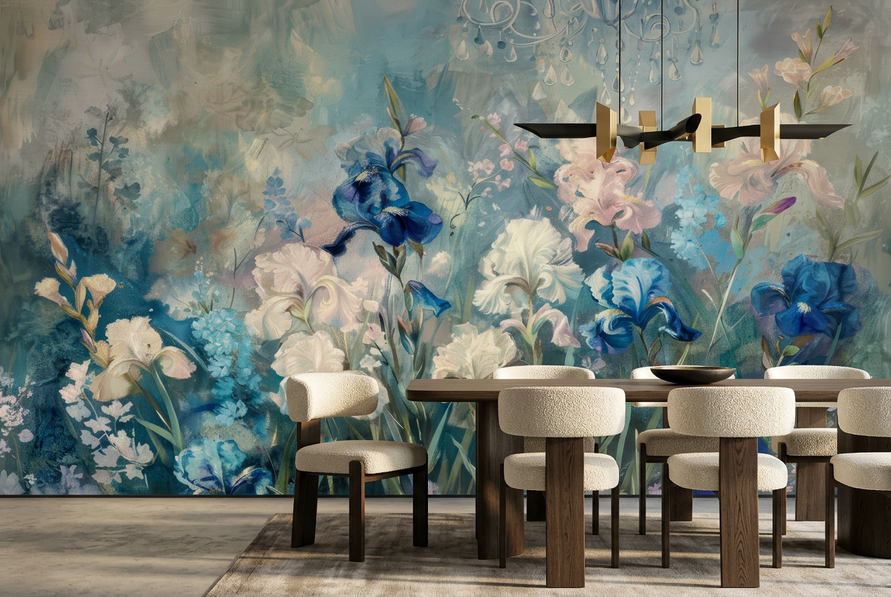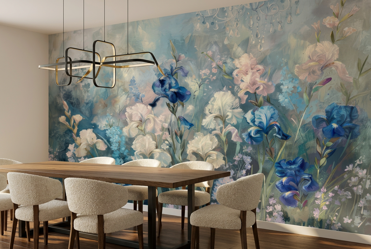 Przenieś się w świat subtelnej elegancji z tapetą Celeste. Ten wielkoformatowy mural to prawdziwe arcydzieło współczesnego malarstwa dekoracyjnego. Przedstawia on gęsty ogród pełen kwitnących irysów, gdzie królewski błękit miesza się z perłową bielą i pudrowym różem. Całość kompozycji dopełnia nastrojowy zarys kryształowego żyrandola, który nadaje grafice głębi i salonowego szyku.