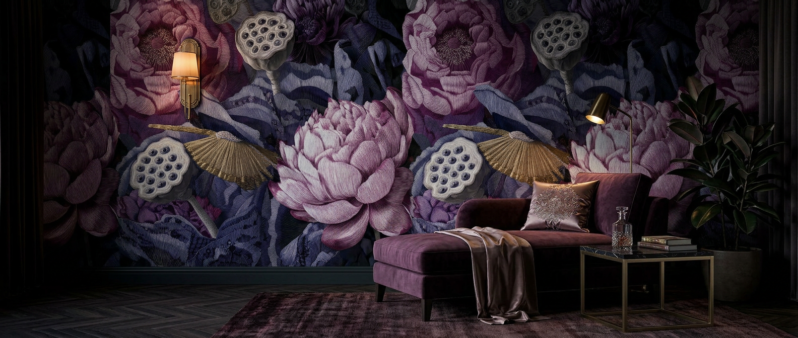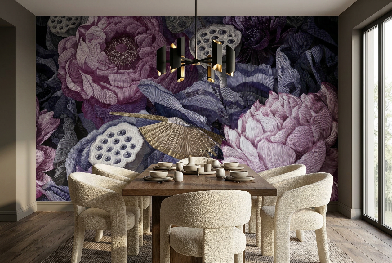 Fiber Bloom to autorski projekt tapety, który redefiniuje klasyczne motywy florystyczne. Centralnym punktem kompozycji są majestatyczne piwonie oraz egzotyczne owocostany lotosu, przedstawione w głębokiej, nasyconej palecie fioletów, burgundu i granatu, przełamanych akcentem szlachetnego złota.